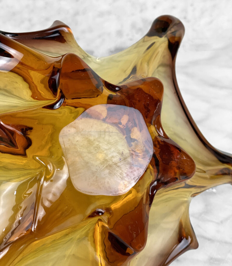 This Art Glass Bowl is in overall good condition without any cracks, chips or repairs shown. Mild scratches along the bottom side of the bowl is shown from age.