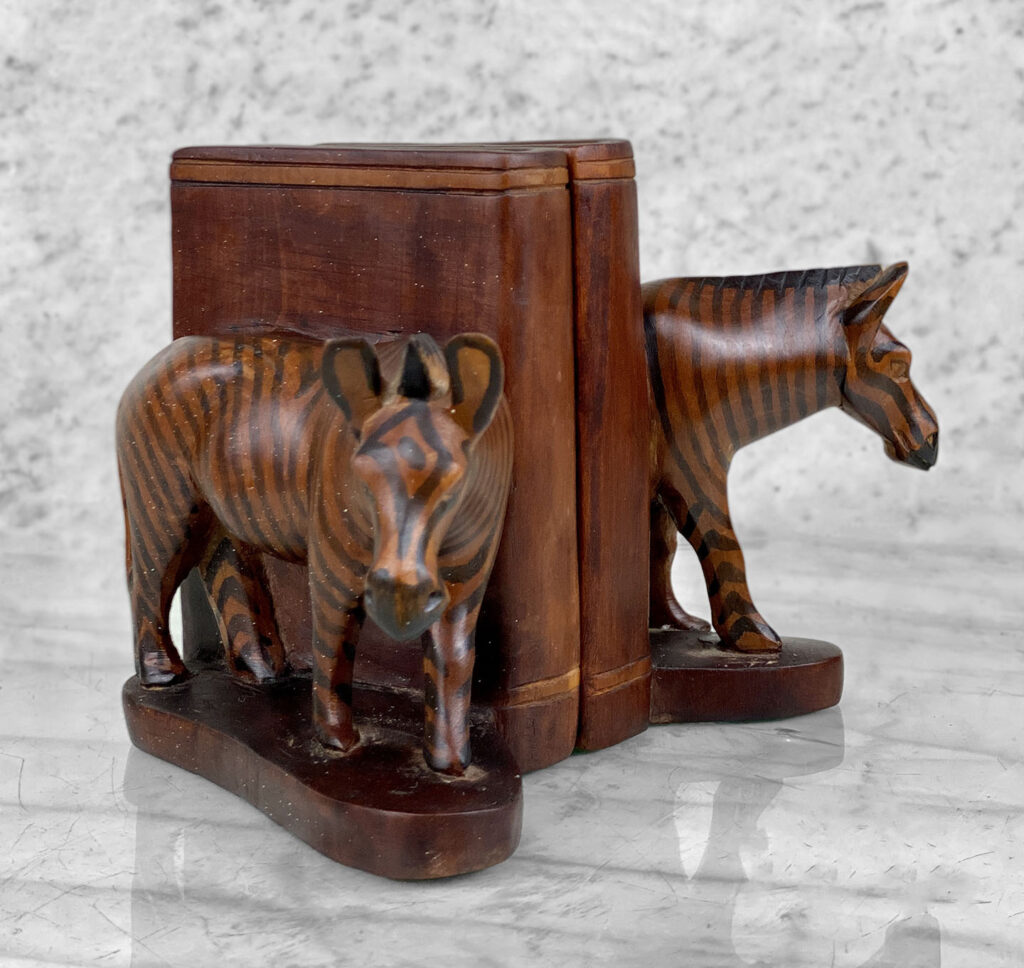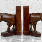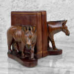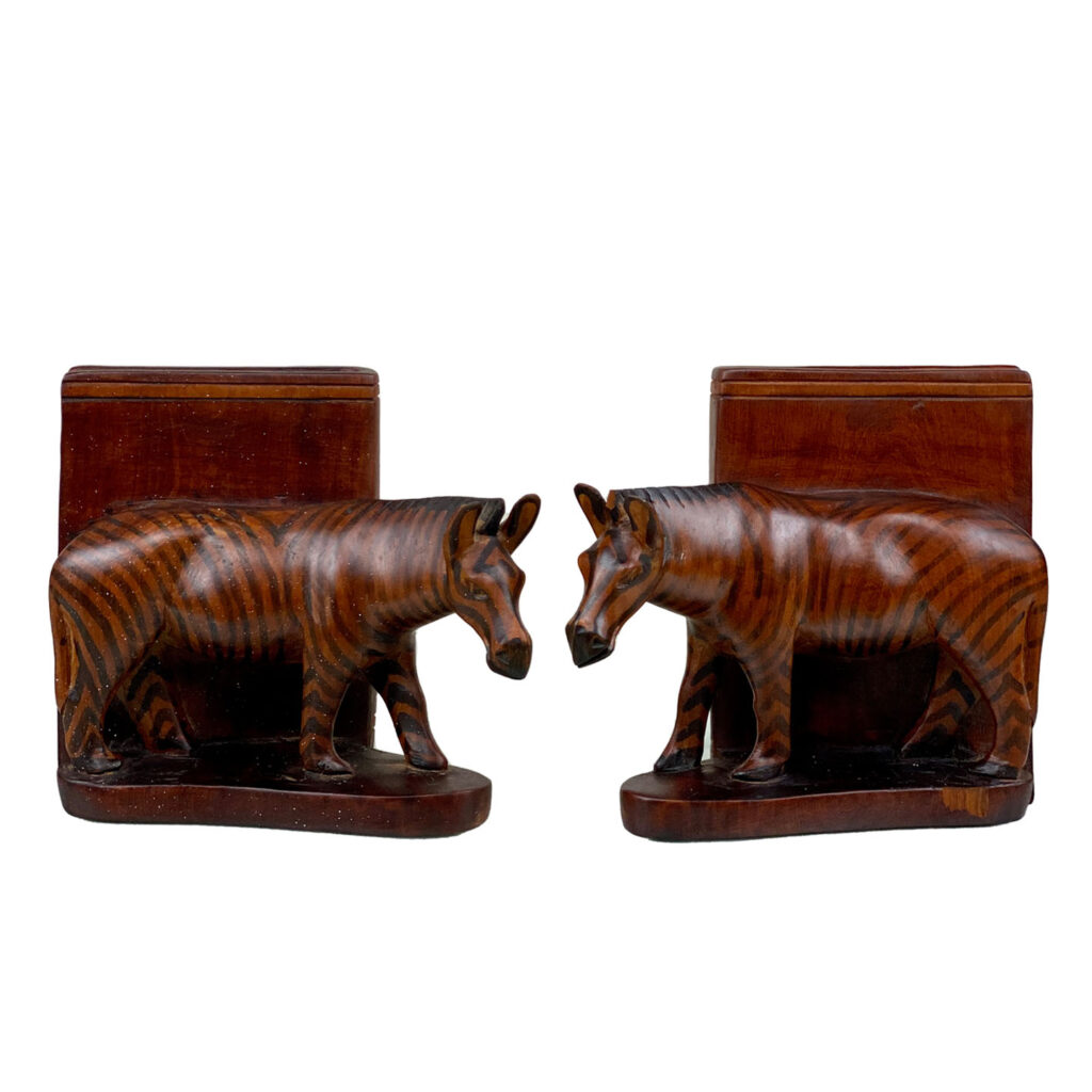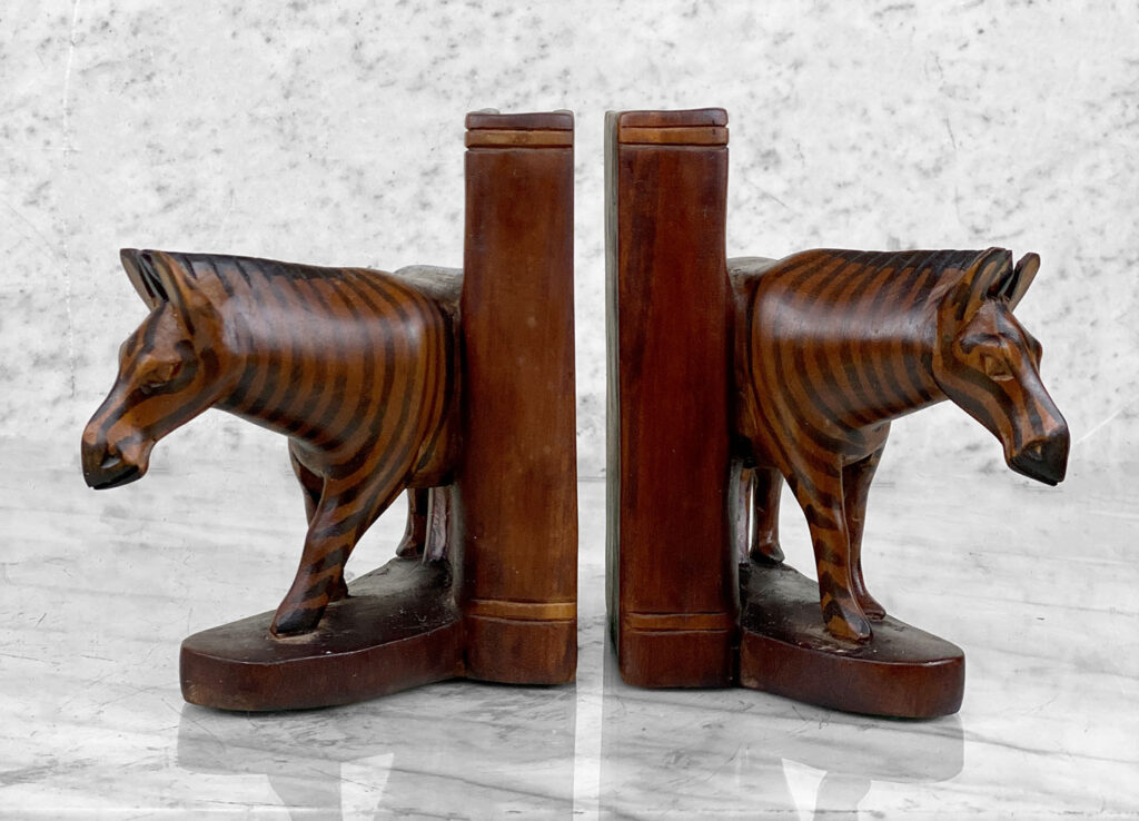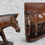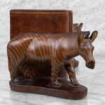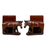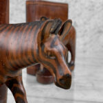This Pair of Figural Zebra Mahogany Bookends are in overall good condition. There aren’t any cracks, splitting or chips in the mahogany. The Mahogany’s finish is nicely aged.