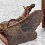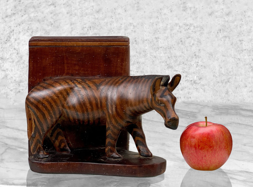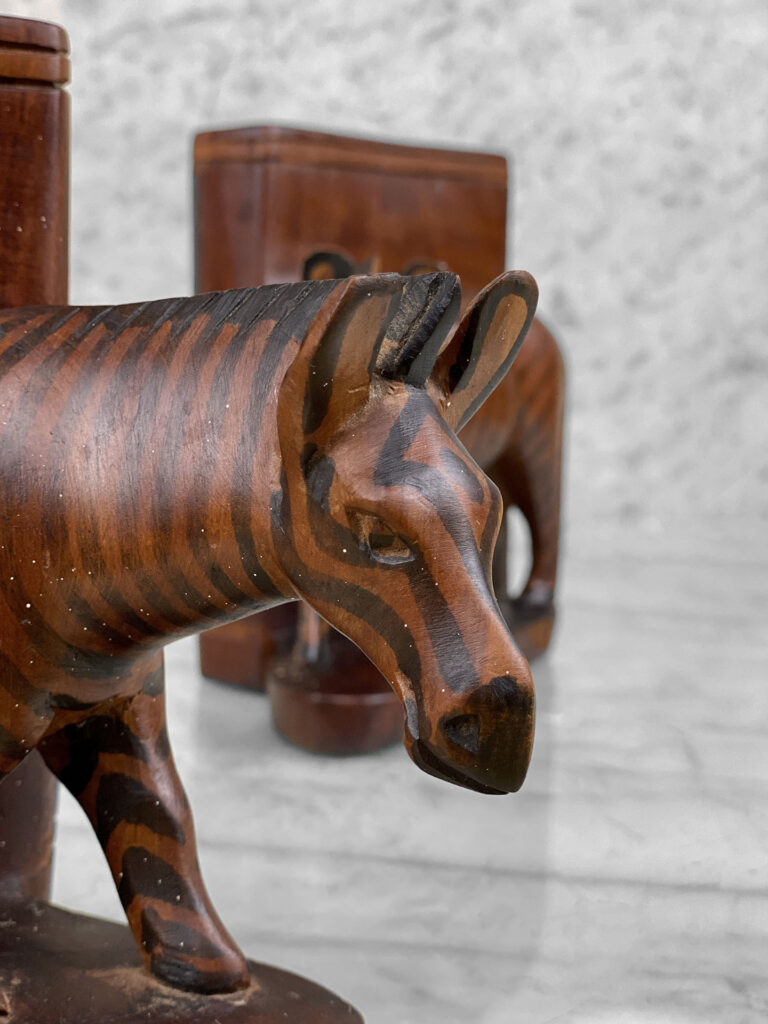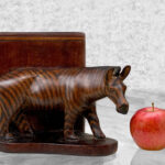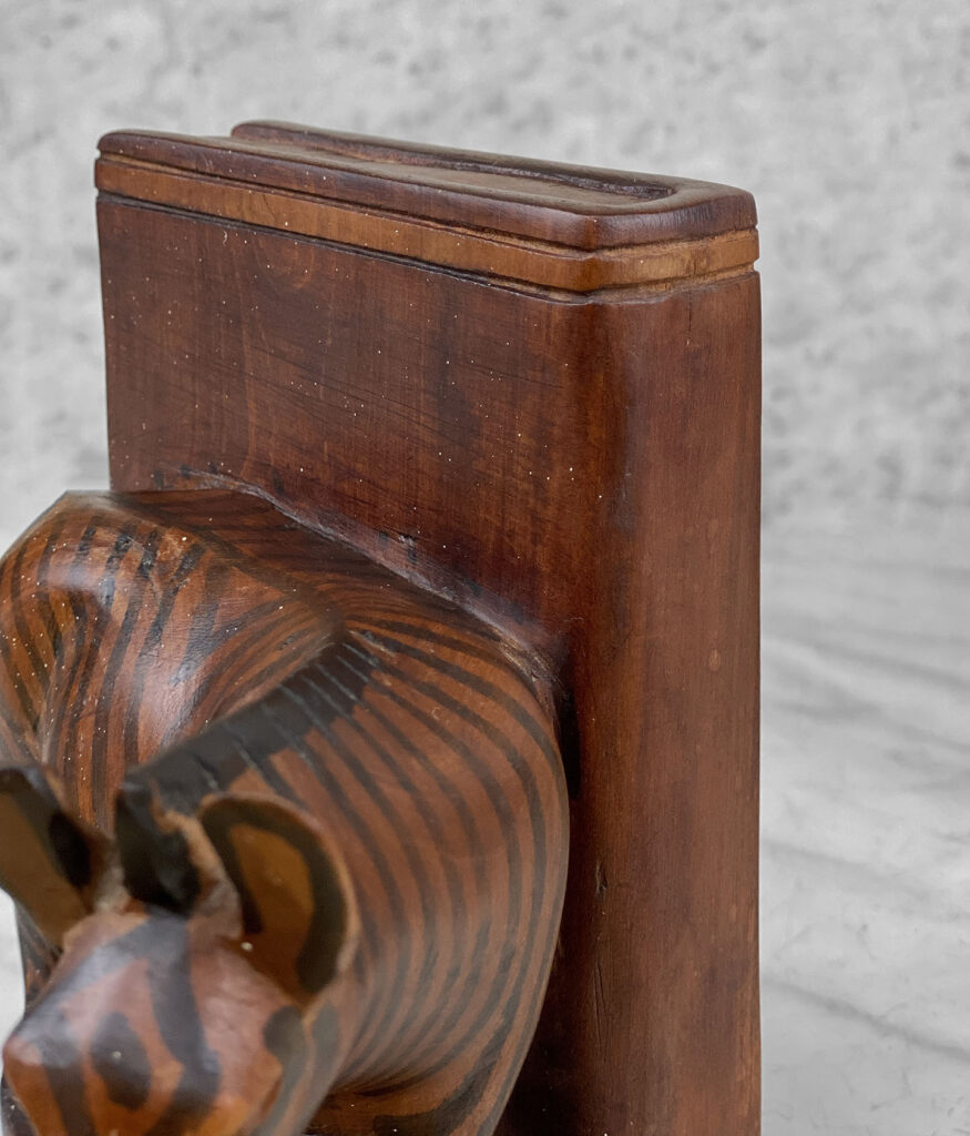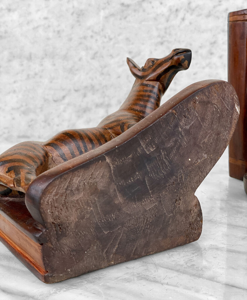 This Pair of Figural Zebra Mahogany Bookends are in overall good condition. There aren’t any cracks, splitting or chips in the mahogany. The Mahogany’s finish is nicely aged.