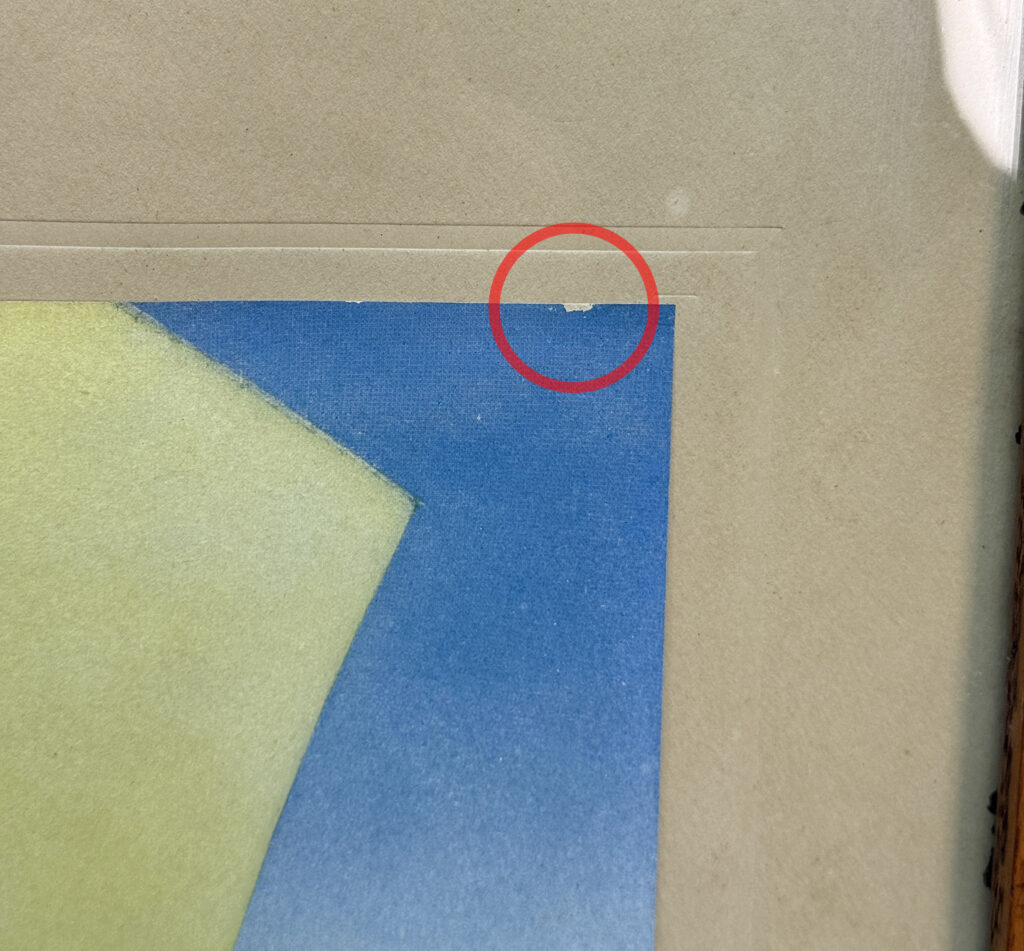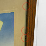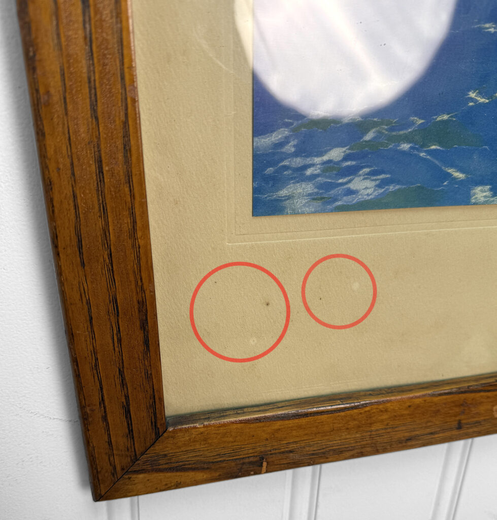 Wonderful aging to the print can be seen. Light distress to select areas of the papers edge can be seen. These areas are circled in our photo gallery to reference.
