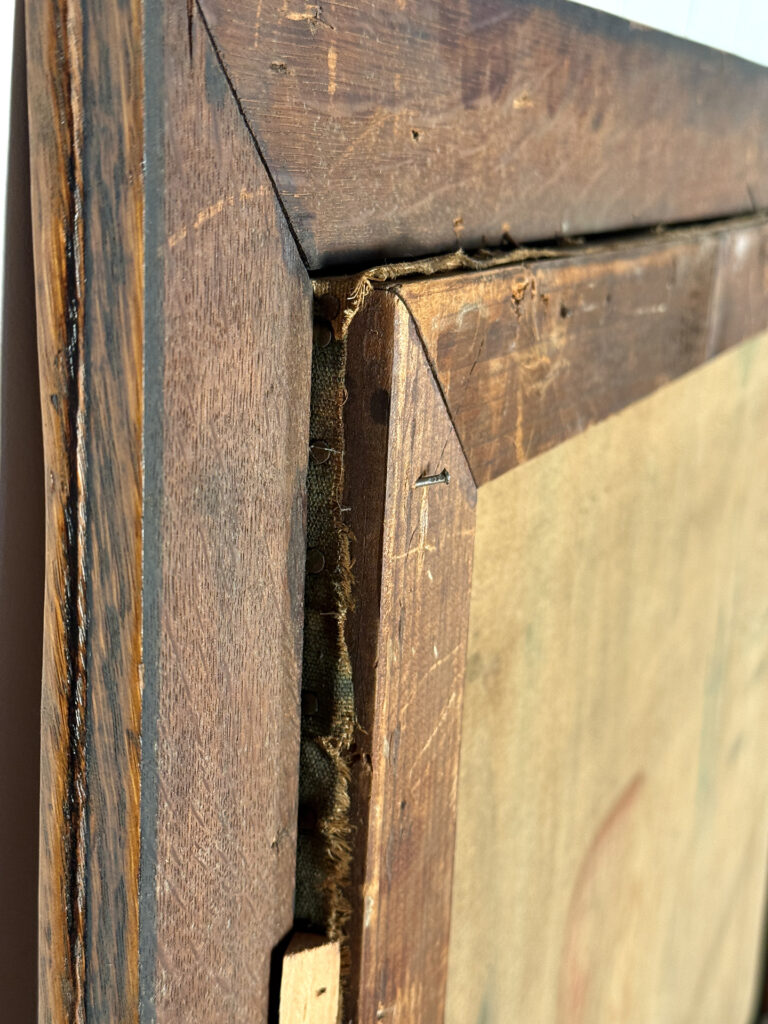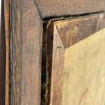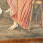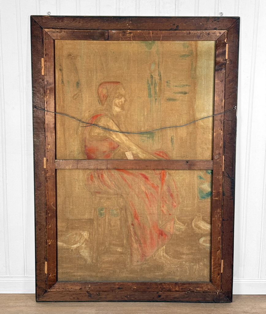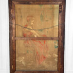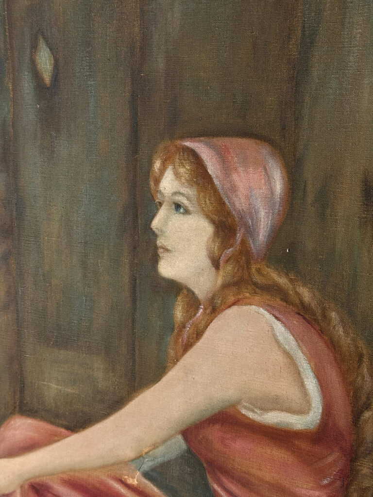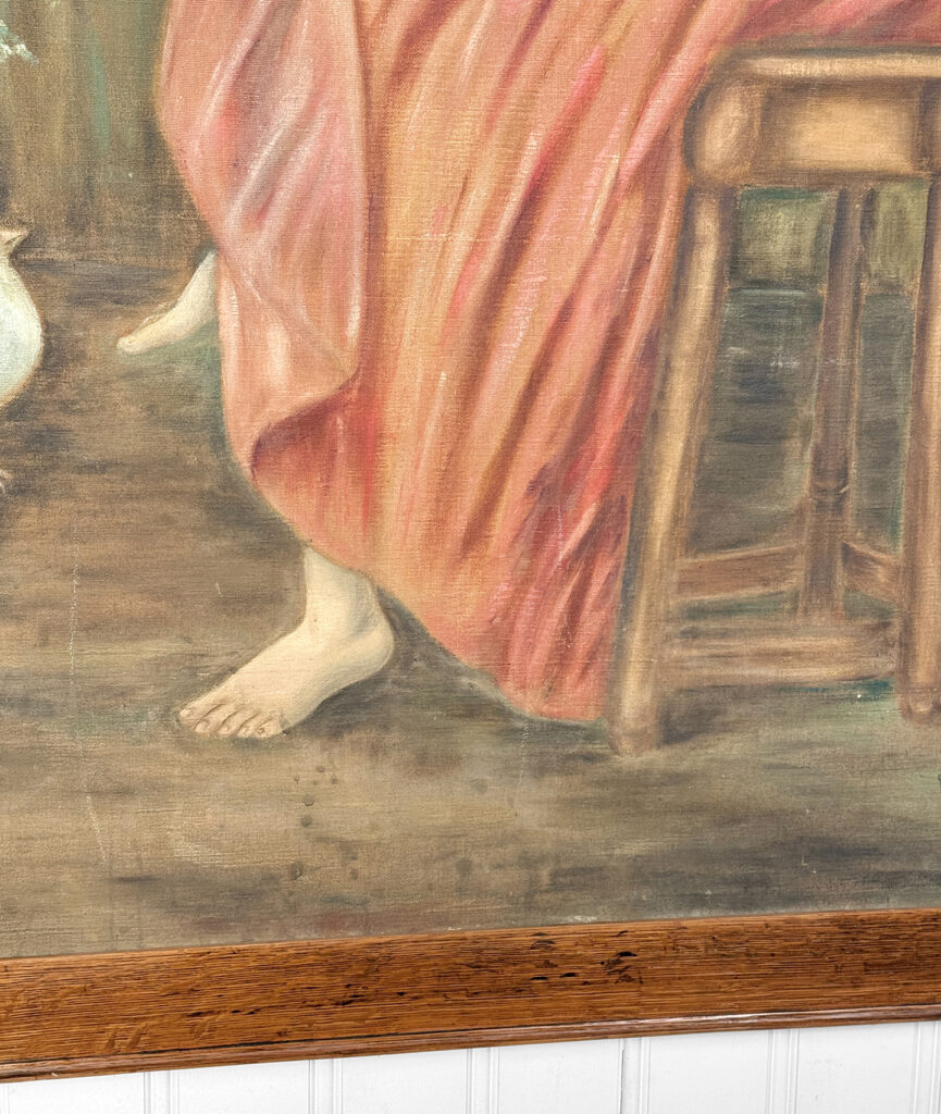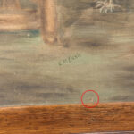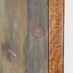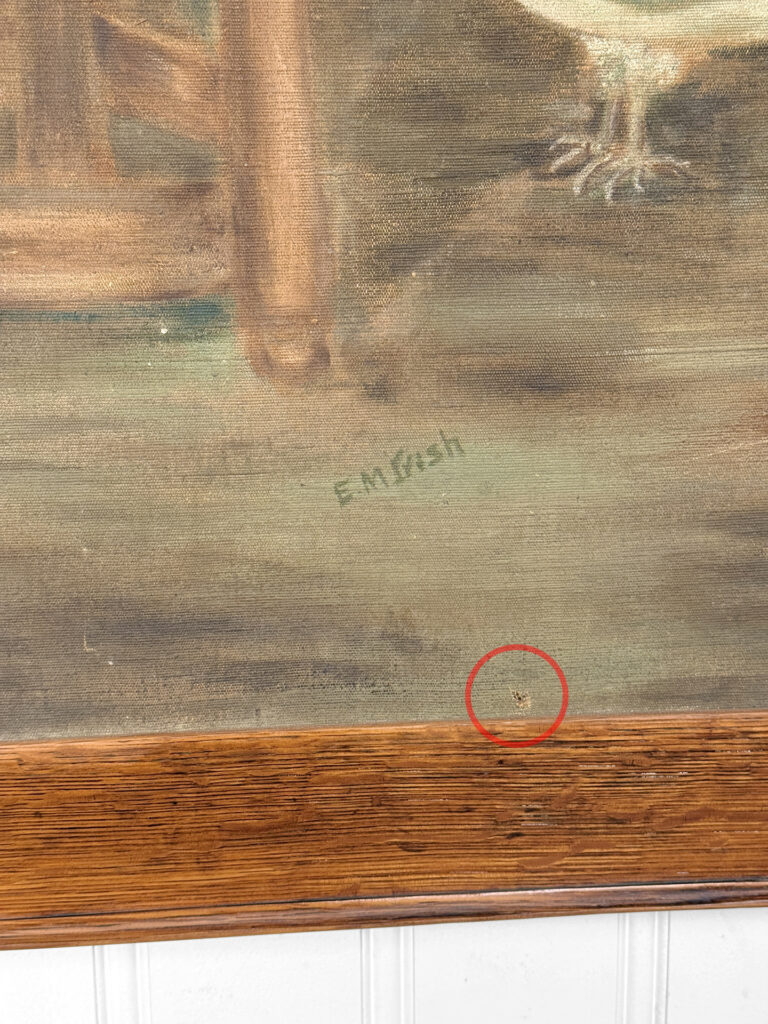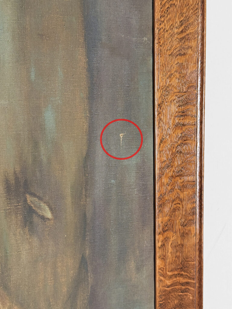 A patched repair is shown just below the women’s elbow. Smaller punctures in the canvas can be seen. These areas are circled in our photo gallery to reference.