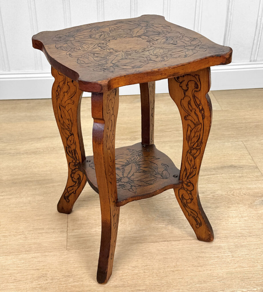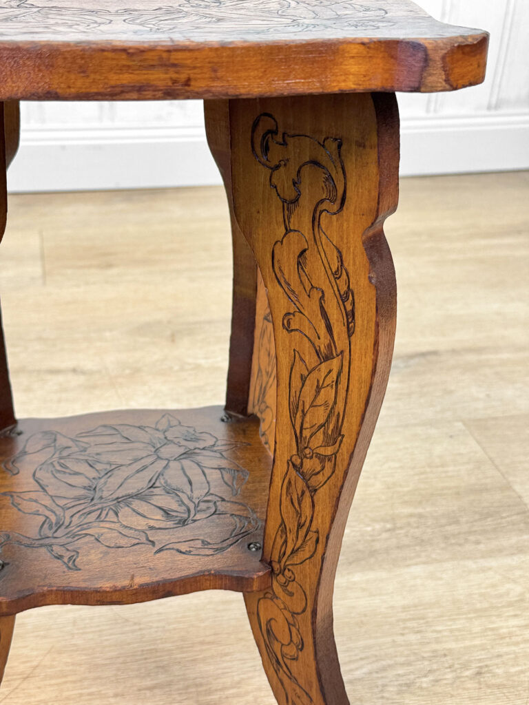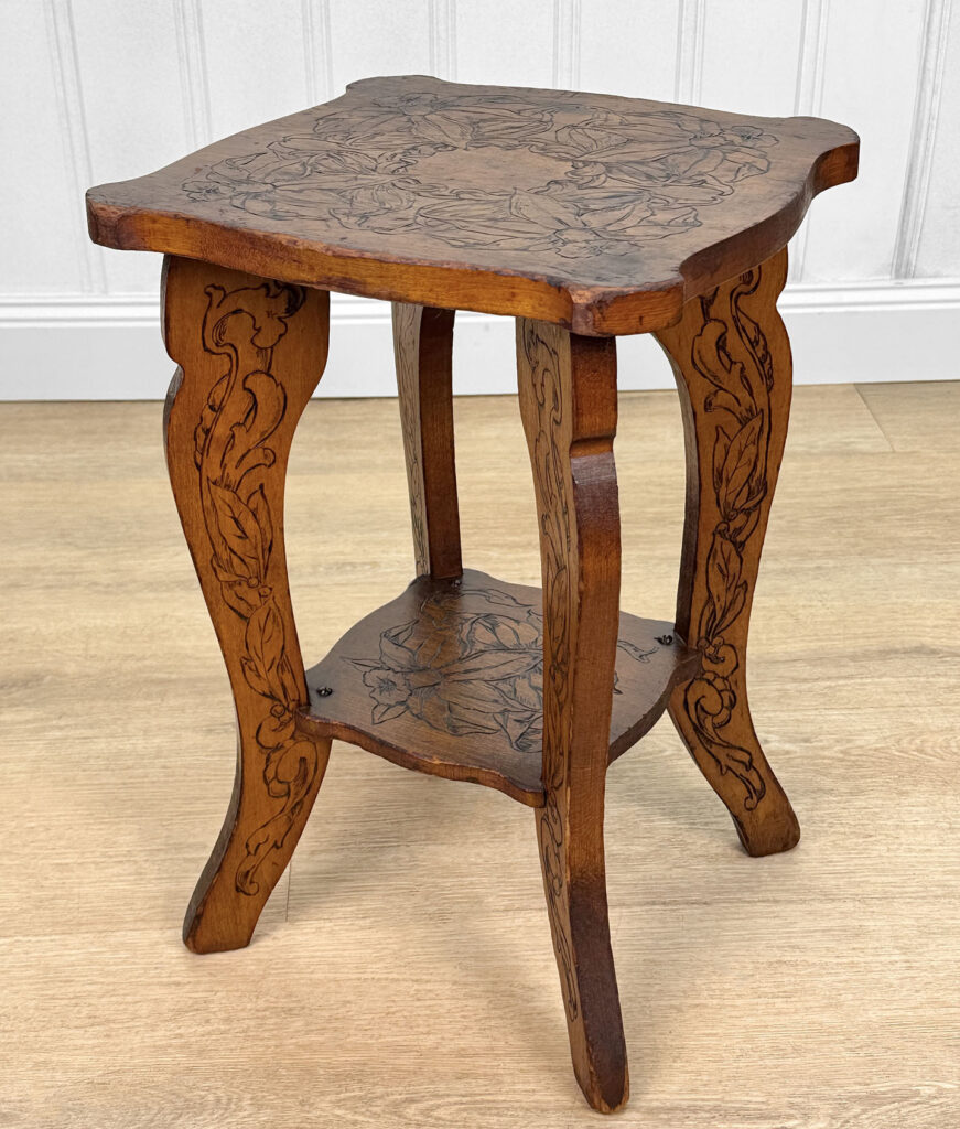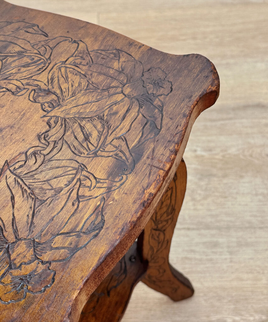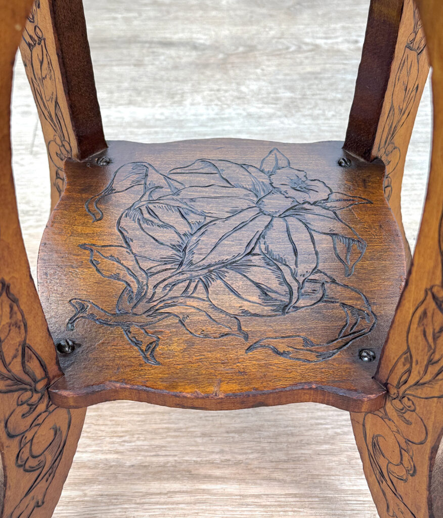 - Attractive Pyrography Floral Motifs Throughout the Top Surface, Legs & Bottom Tier