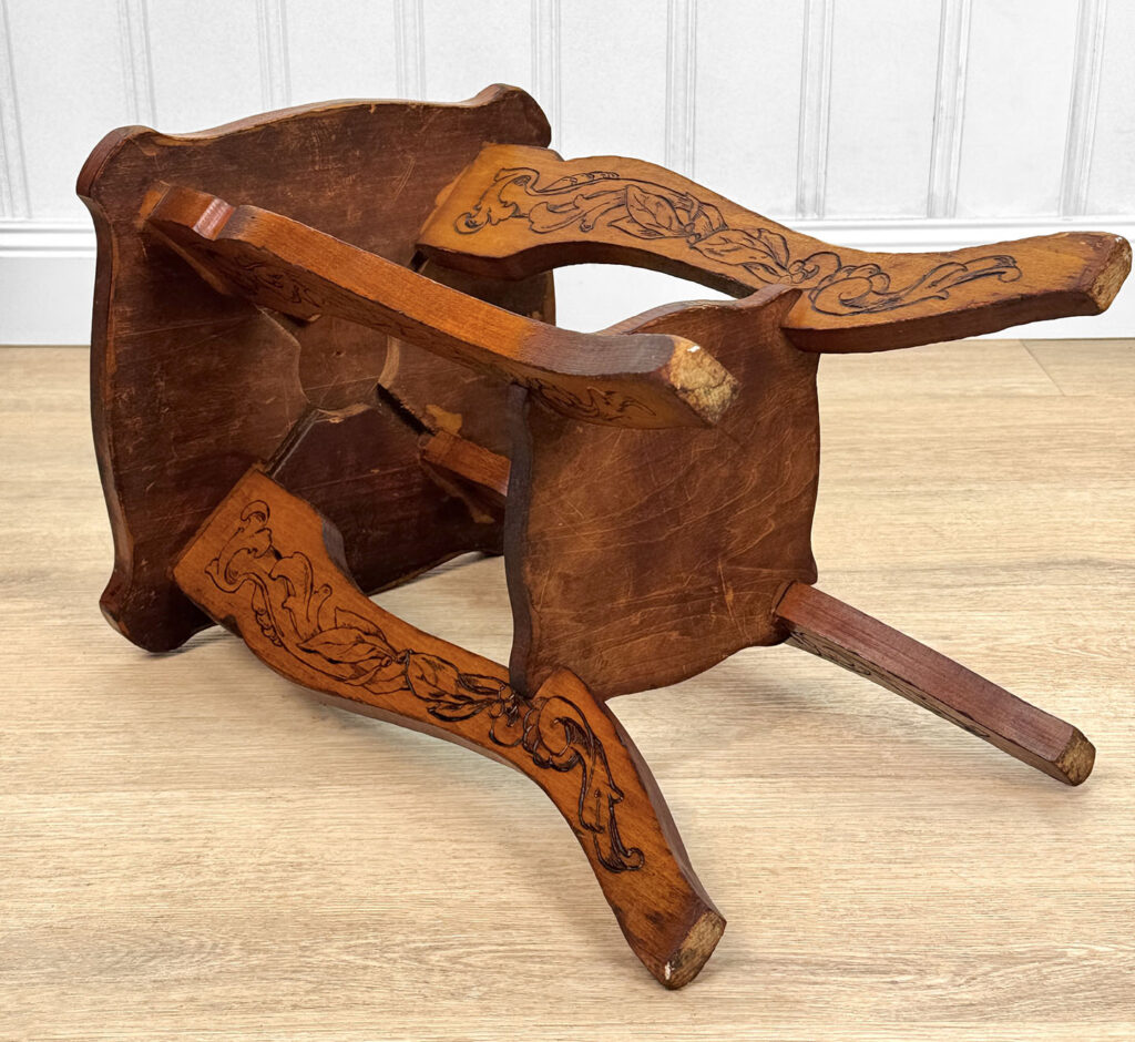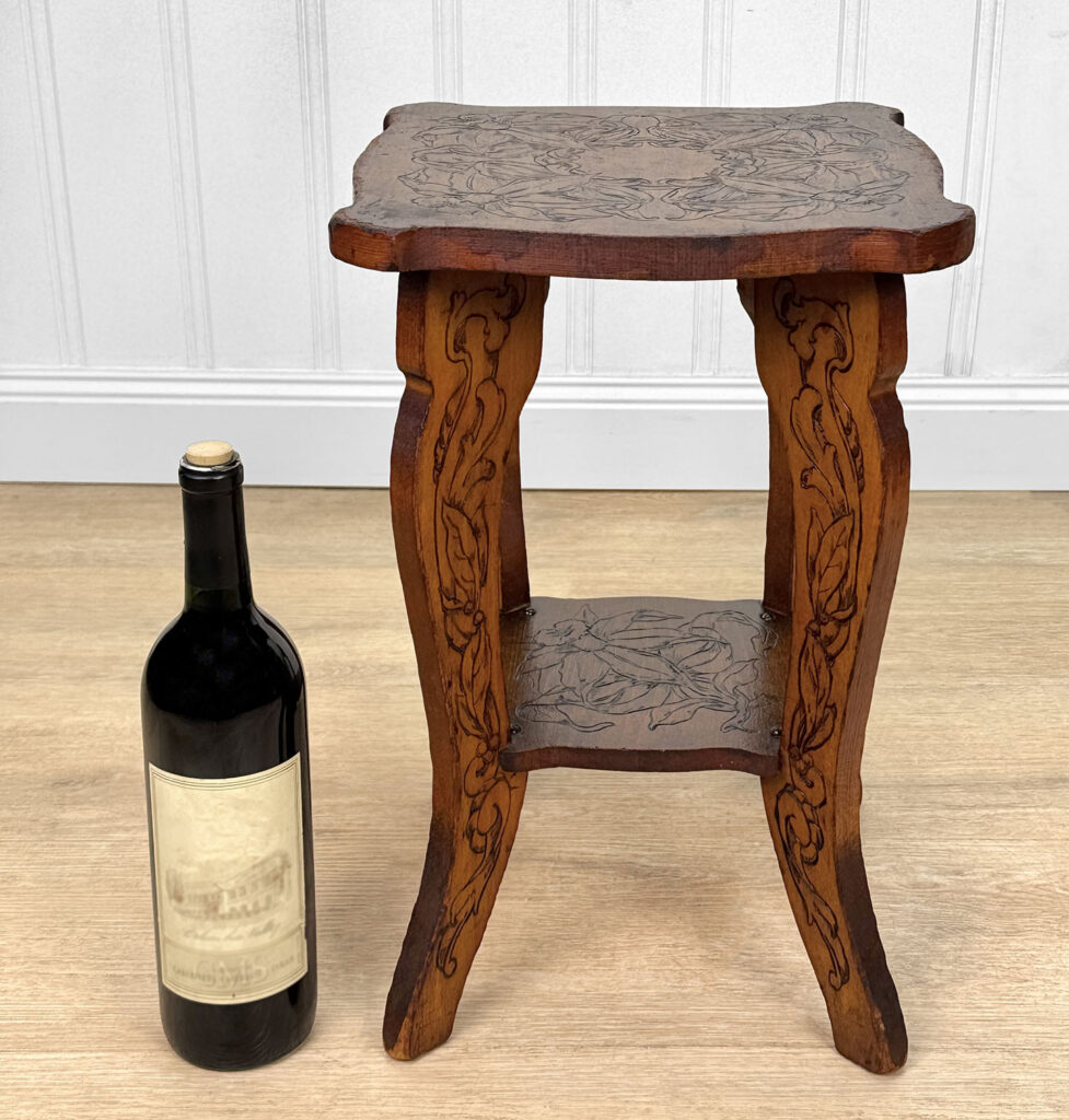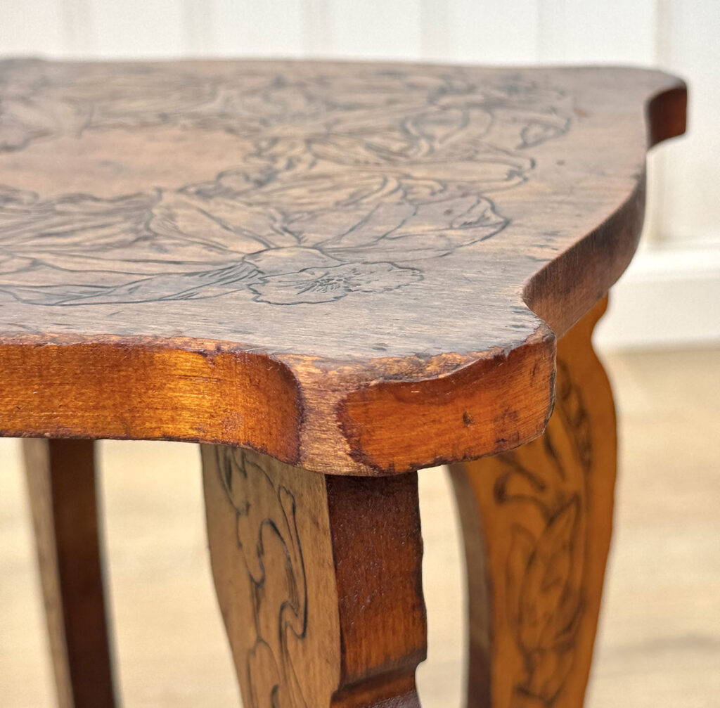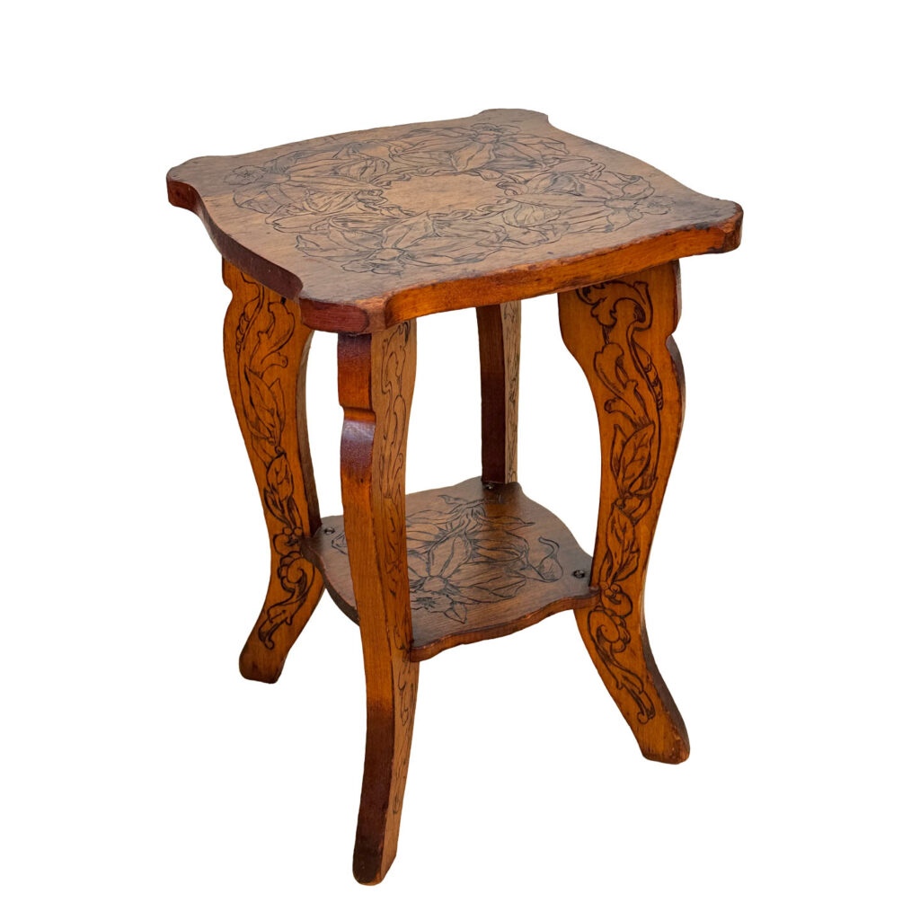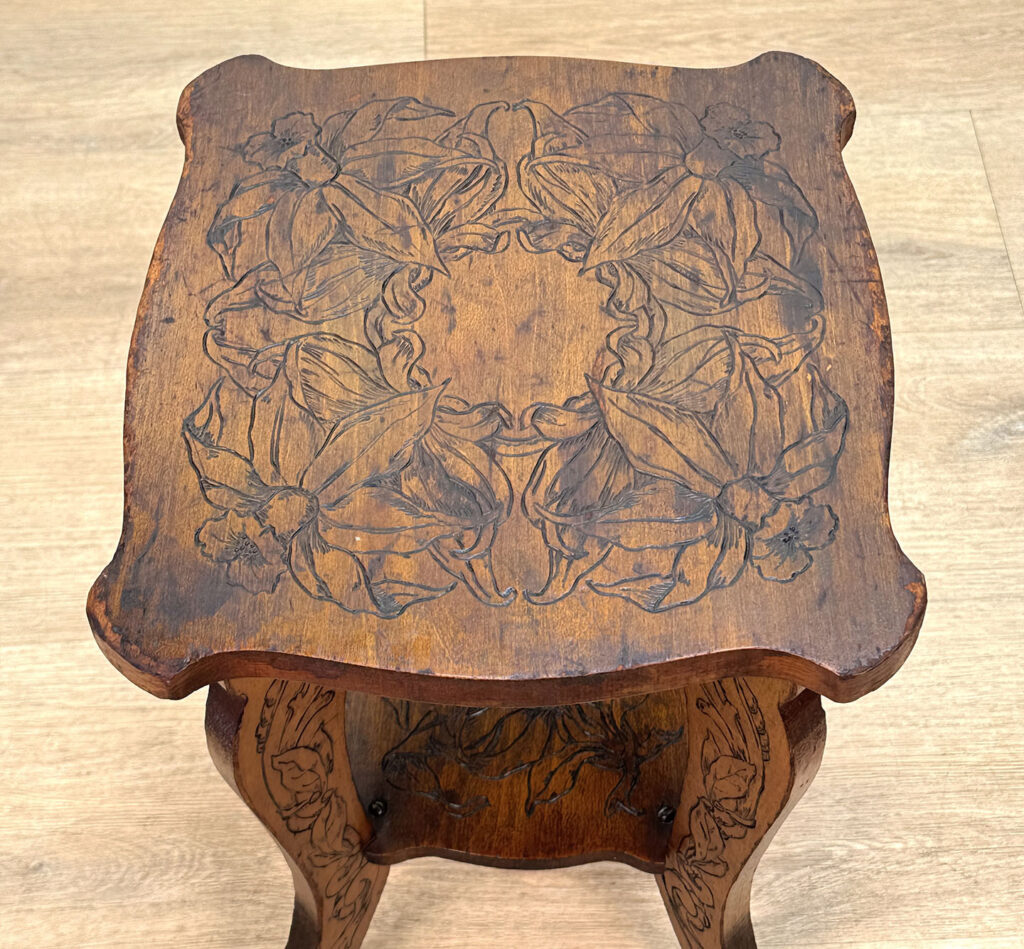 - Attractive Pyrography Floral Motifs Throughout the Top Surface, Legs & Bottom Tier