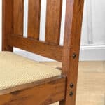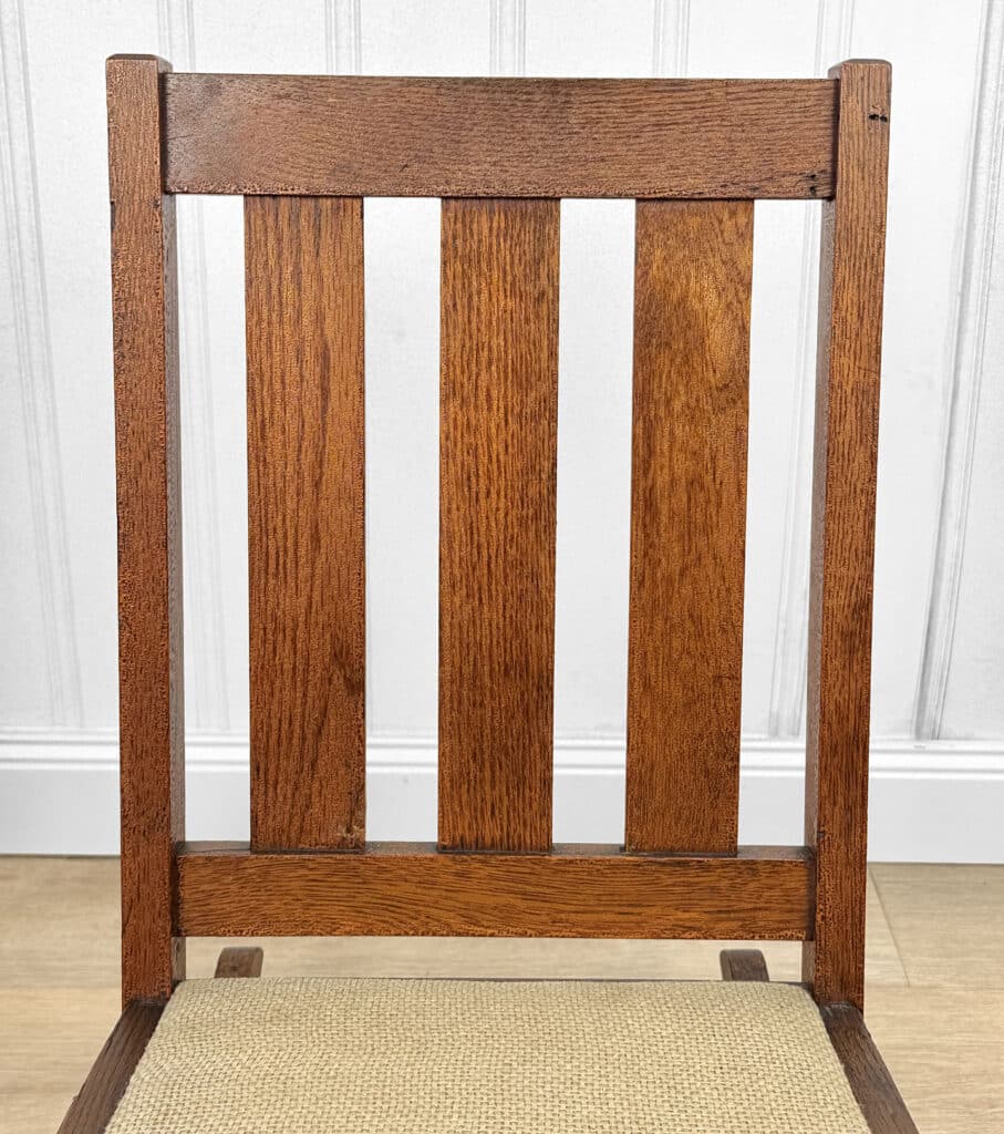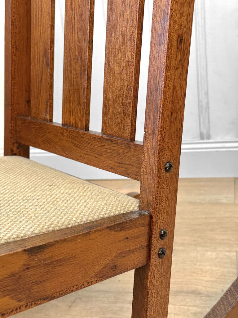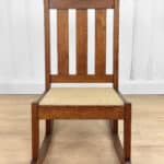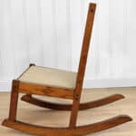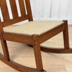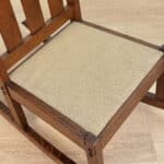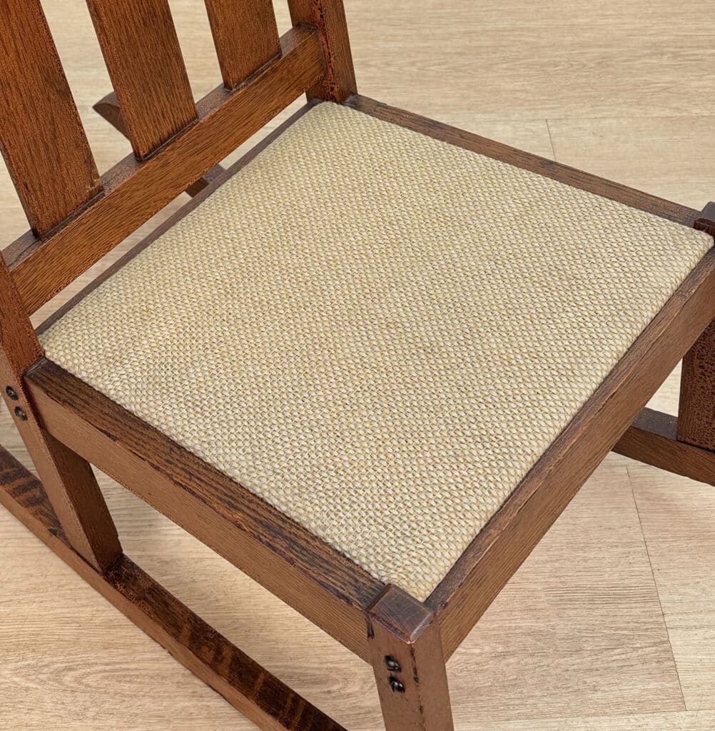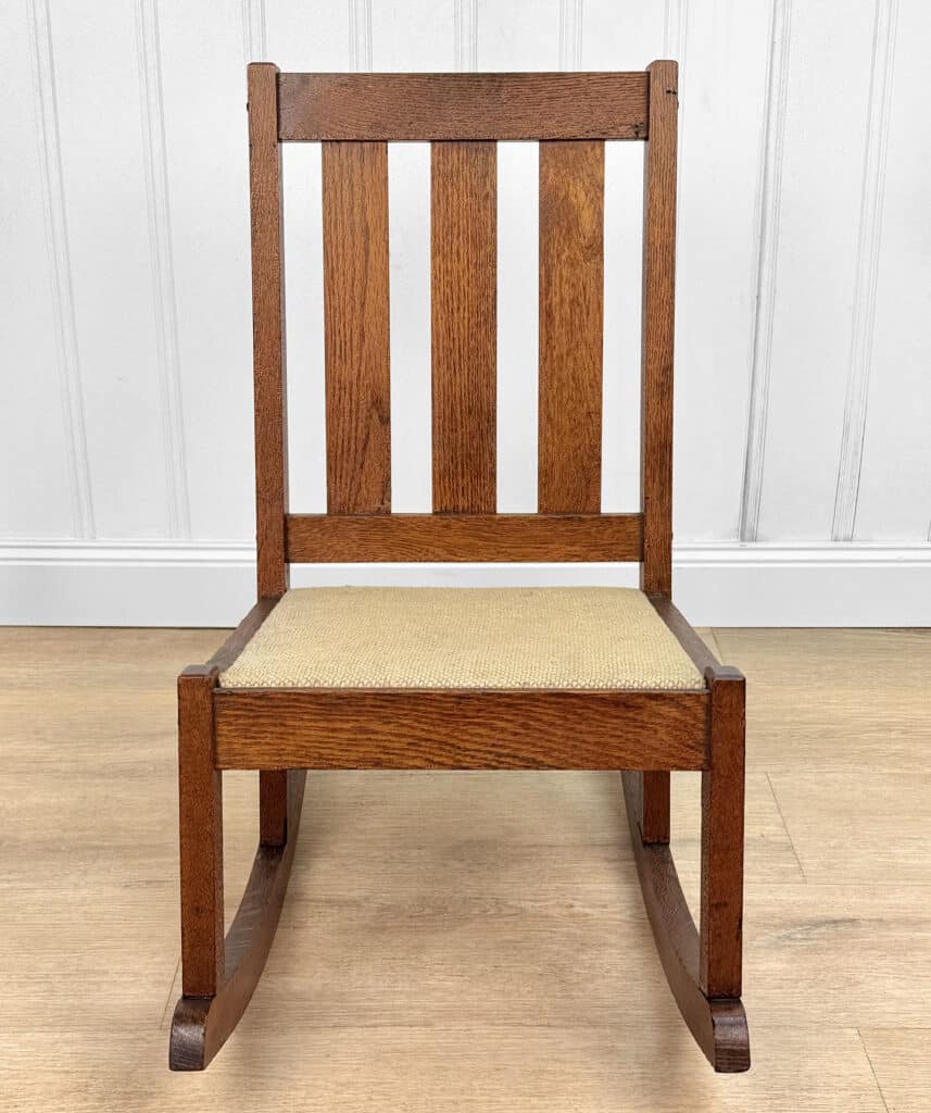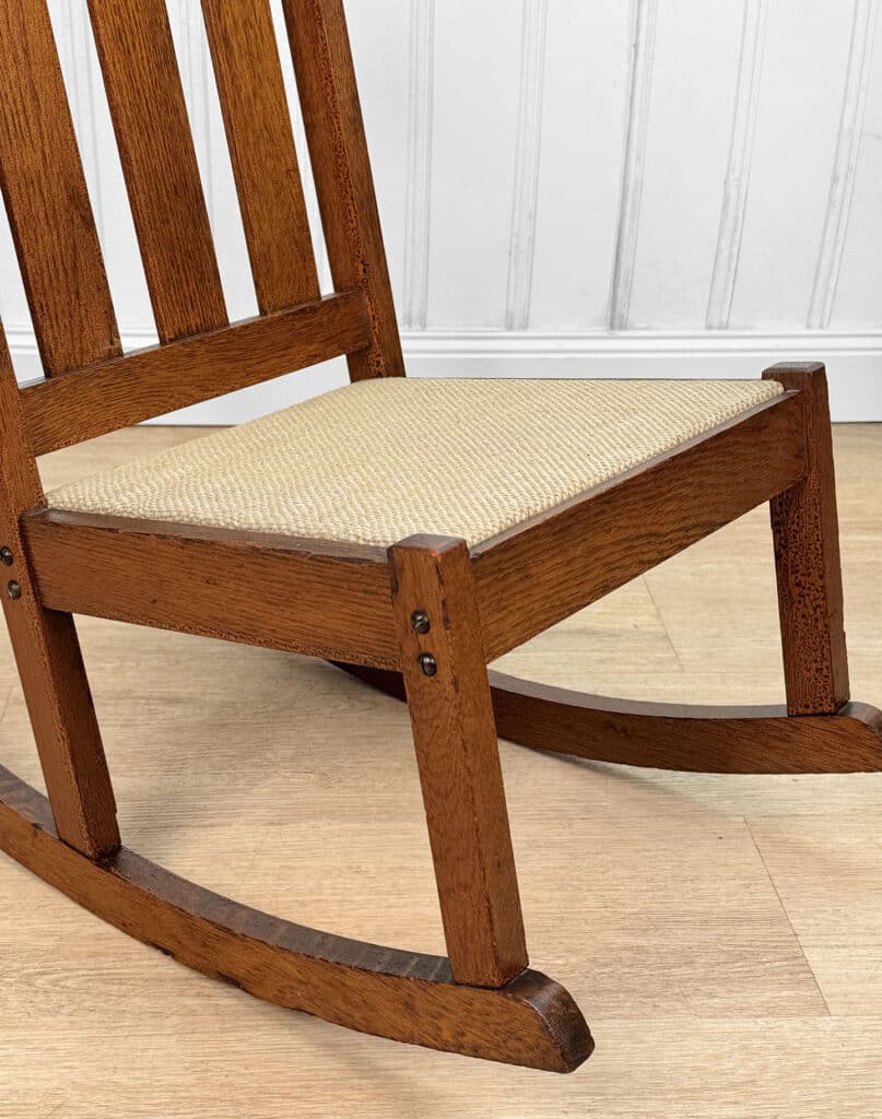 This Child’s Rocking Chair is solid and sturdy to be used; It’s in overall good condition. The finish is well aged, showing patina and signs of wear. There aren’t any repairs shown to the Chair. The upholstery was likely redone during the Mid 20th Century; It’s free of any holes or rips.