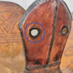 Fully solid and heavy saddle, no loose areas. Wear to the leather can be seen throughout. One of the round mirror accents is cracked. We’ve circled this area in our photo gallery to reference.