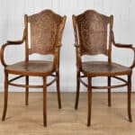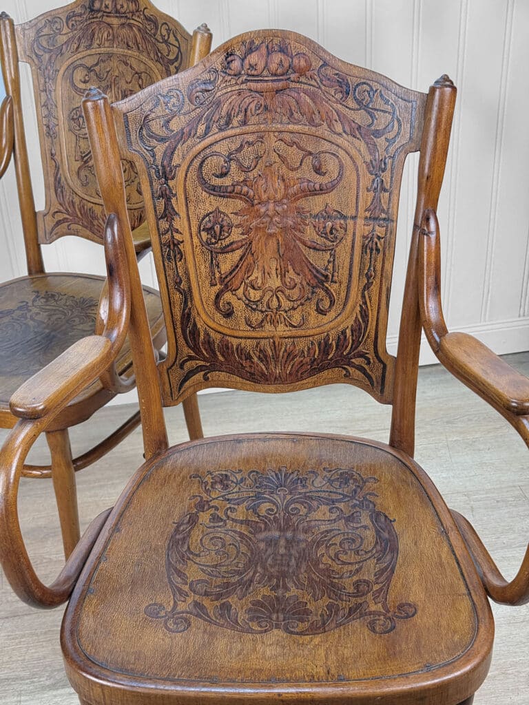 Each Chair shows a moderate amount of surface scratches and blemishes from age. Areas of the bentwood seams along the leg rail shows previous repair. Each chair makes a good daily seat.