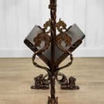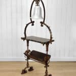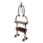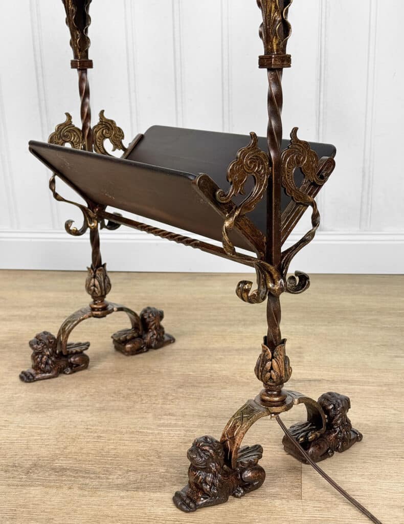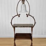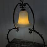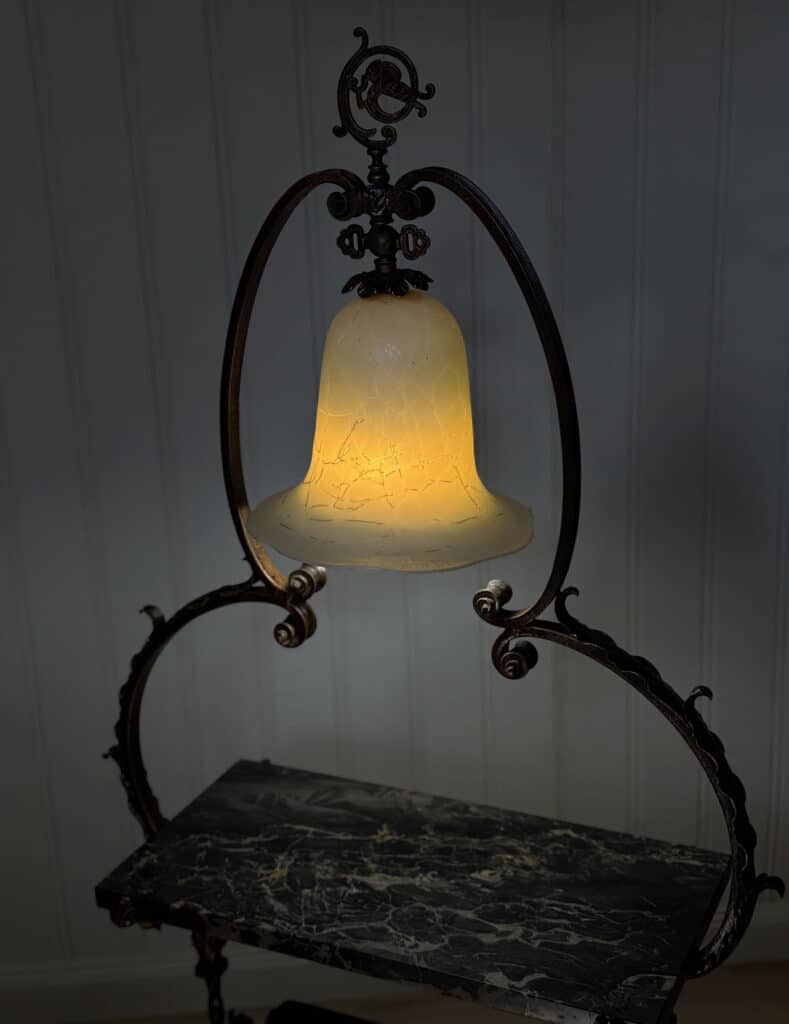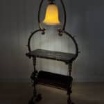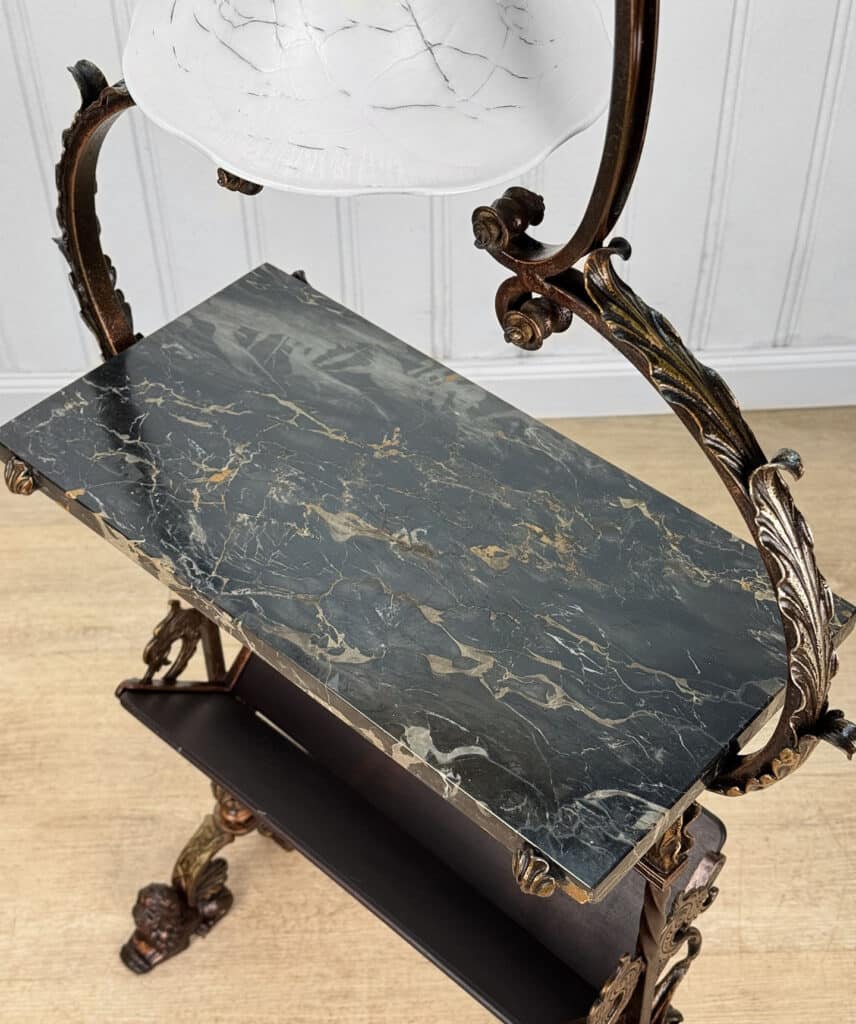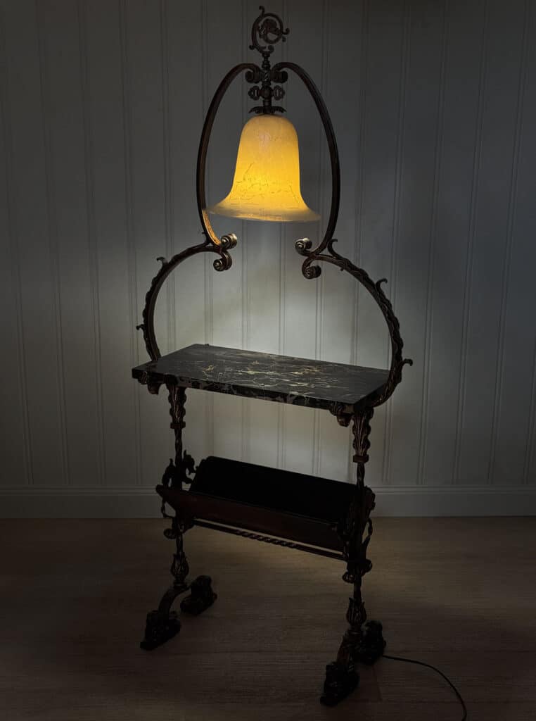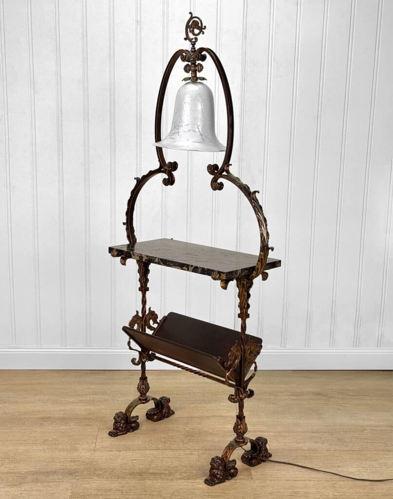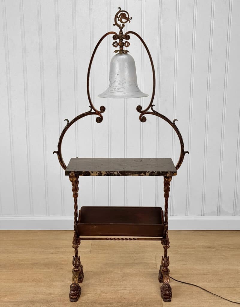 The Oscar Bach Library Lamp Table was exceptionally well made. The piece is so unique and looks great within an entryway, library or hallway. The marble does not show any cracks or chips. Mild surface scratches to the finish can be seen. The Steuben Glass shade does not show any chips or repairs. The lamp is fully tested and works as it should, it does not require rewiring.