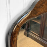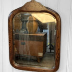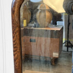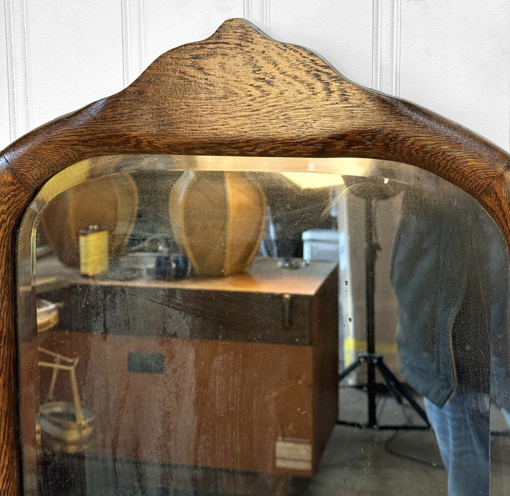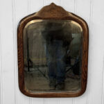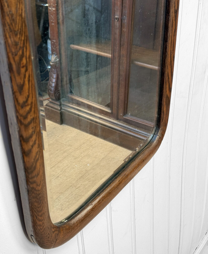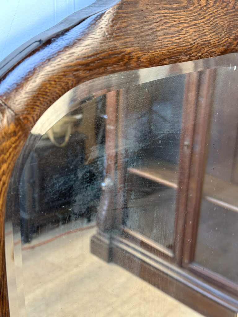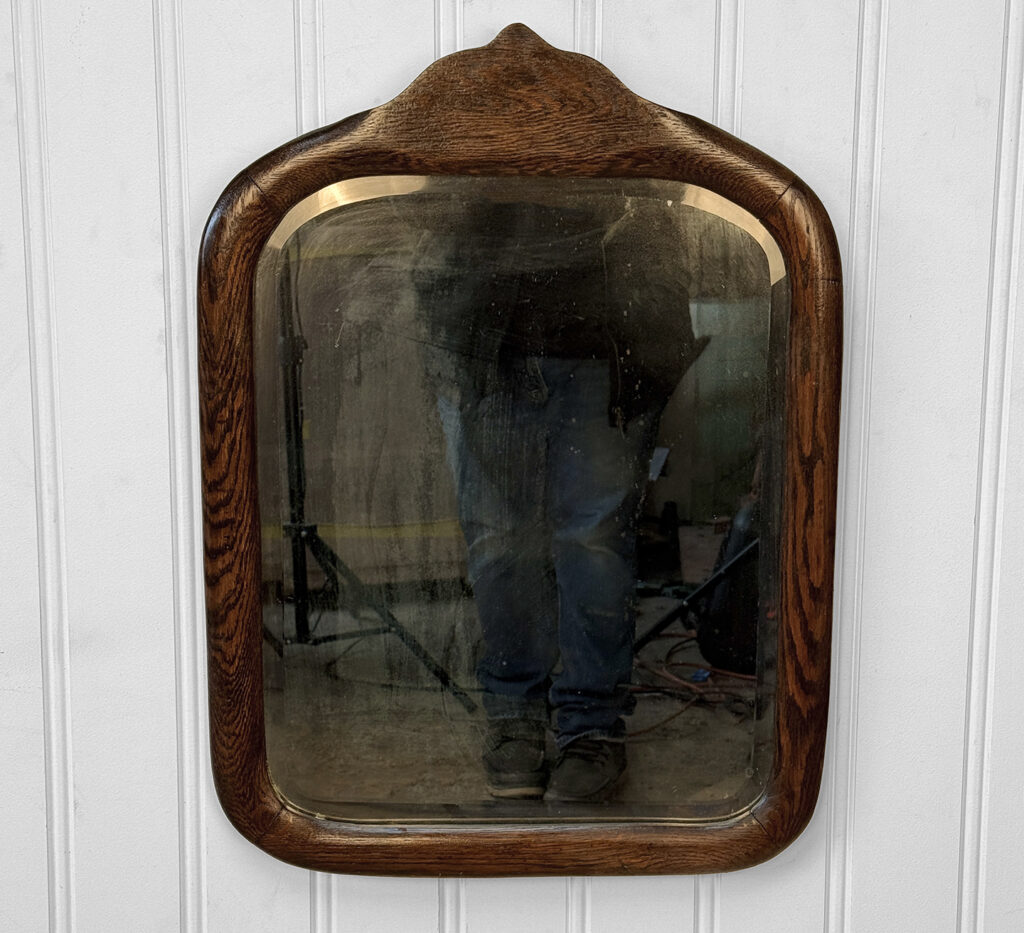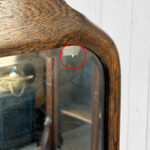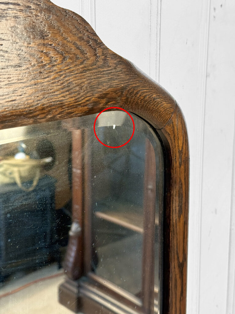 Mild hazing to the original glass can be seen, as well as a small area of silverloss. We’ve circled this area in our photo gallery to reference. The oak frame is in overall nice condition.