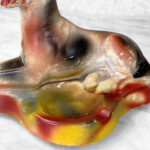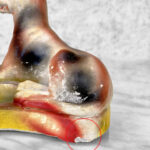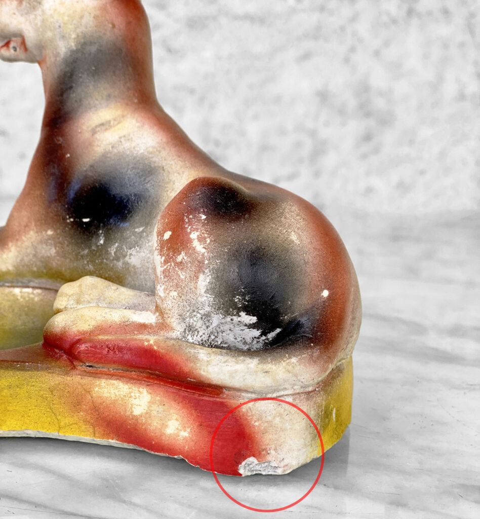 This Chalkware Ashtray shows wear to the finish as well as a chip shown along the bottom right side. This area is circled in our photo gallery to reference.