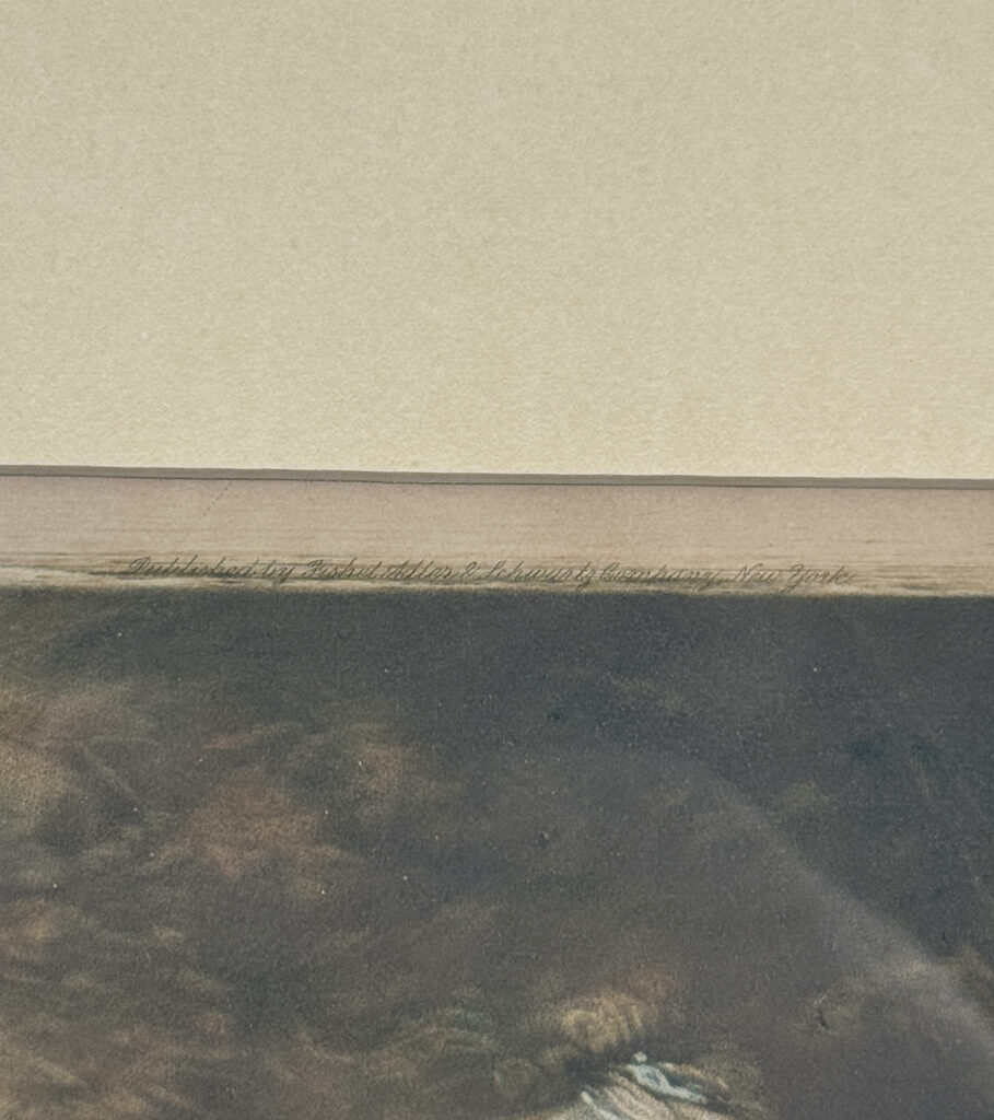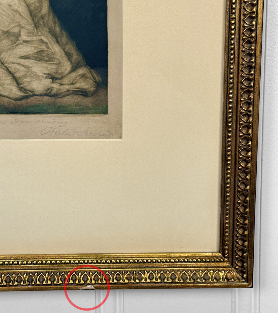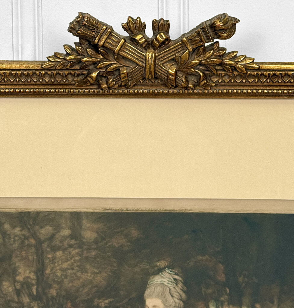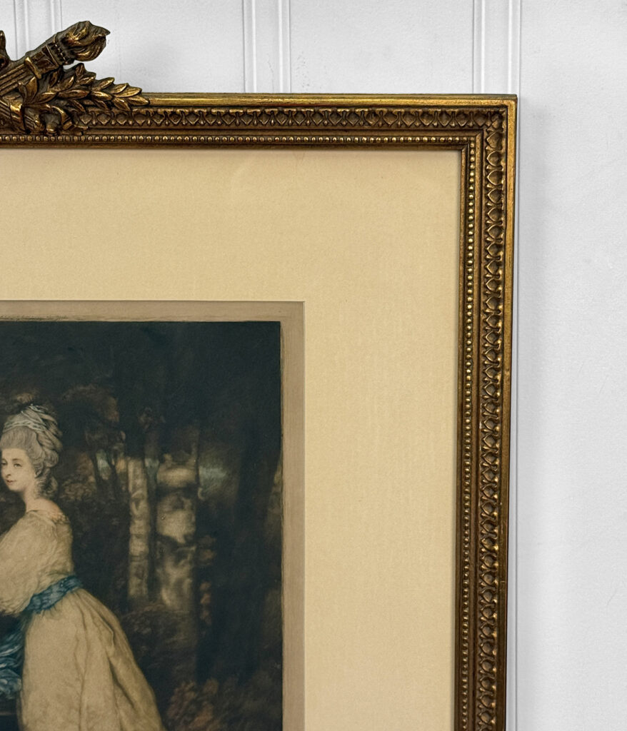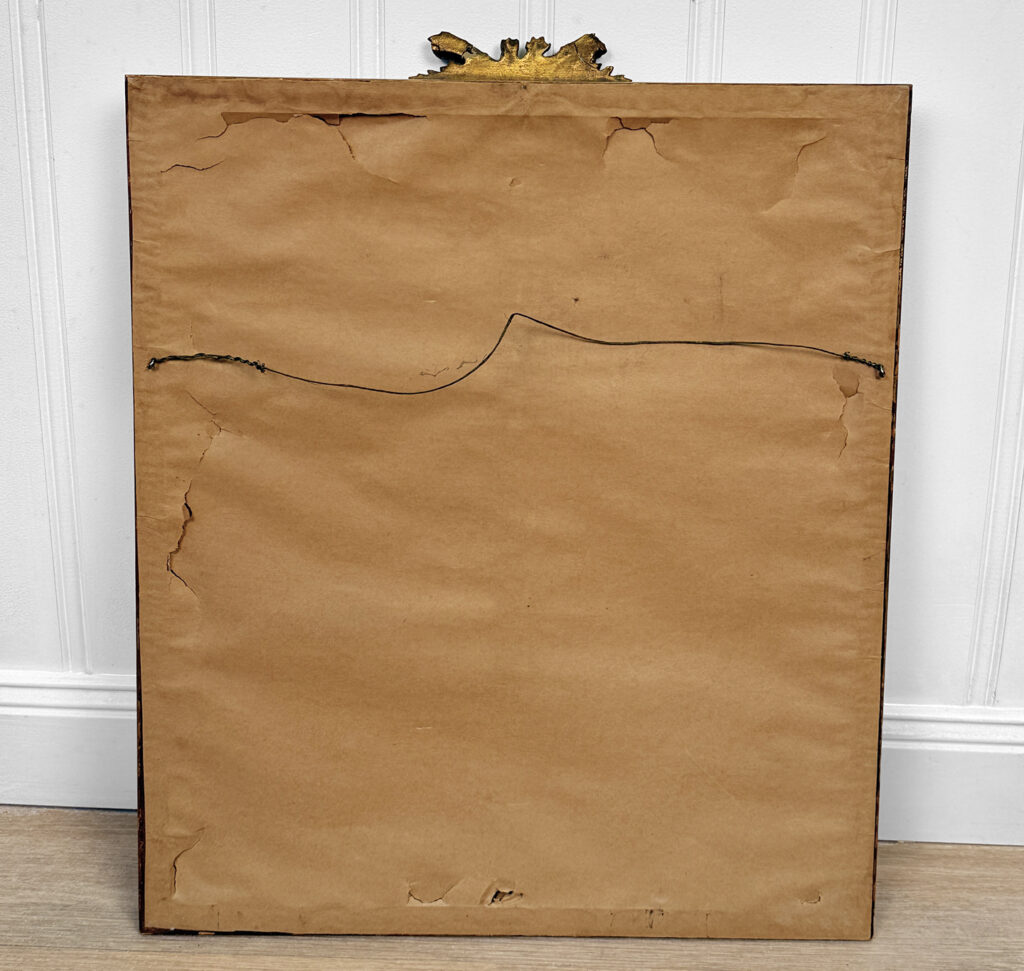 Areas of the frame show wear, including a stress crack to the upper crown. The print is in overall good condition with great colors. Arrives ready to hang.