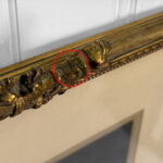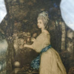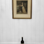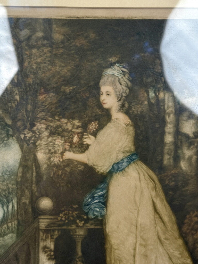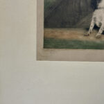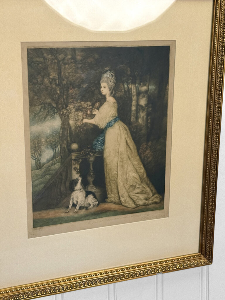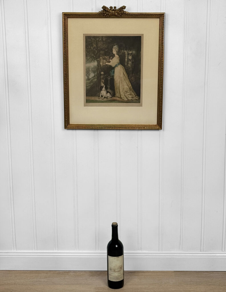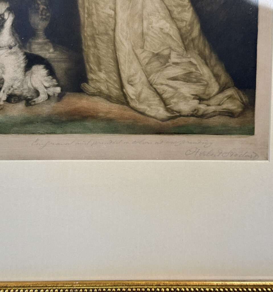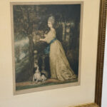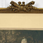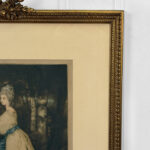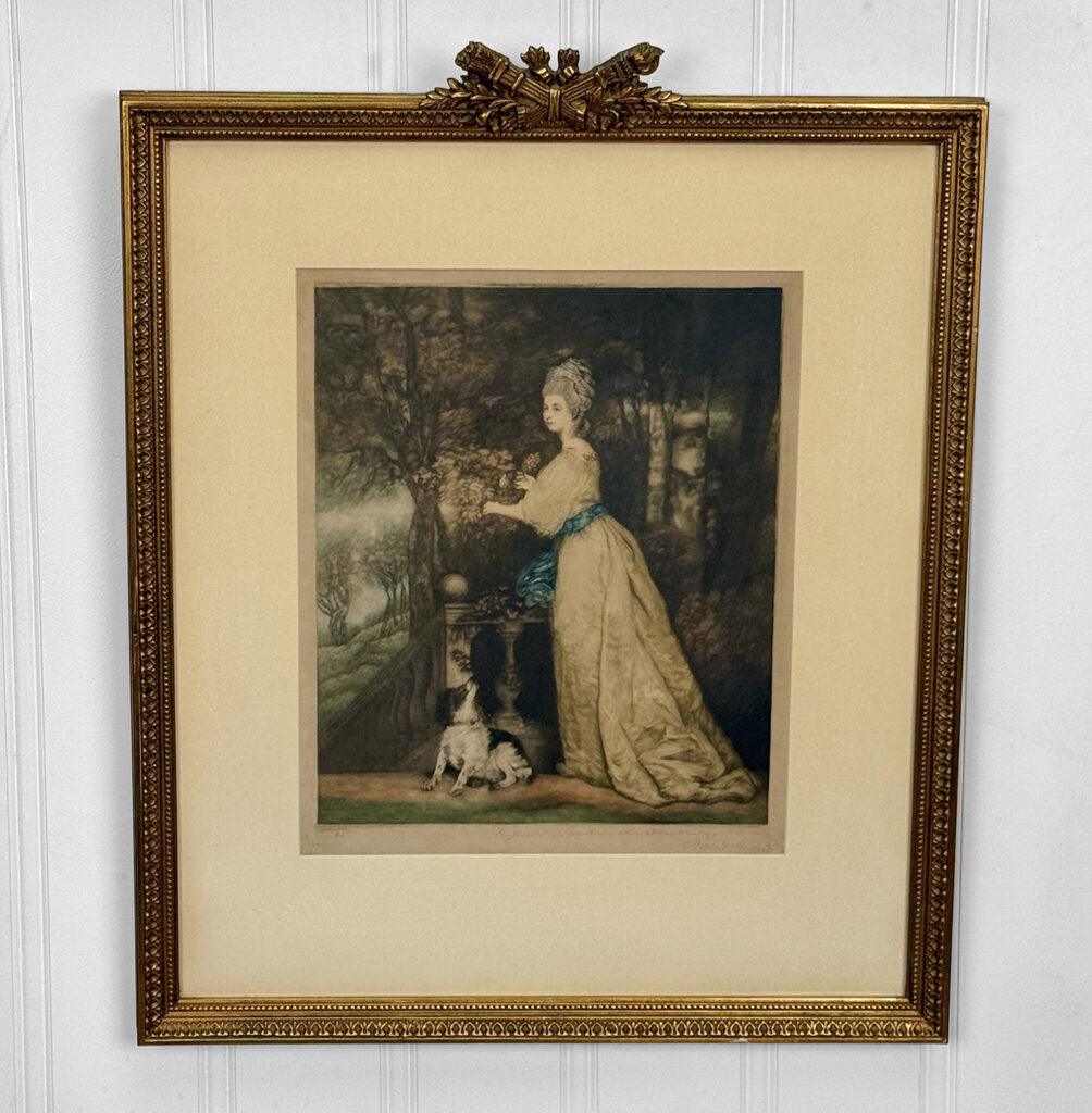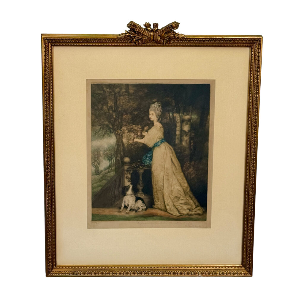 Areas of the frame show wear, including a stress crack to the upper crown. The print is in overall good condition with great colors. Arrives ready to hang.