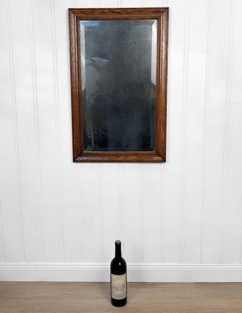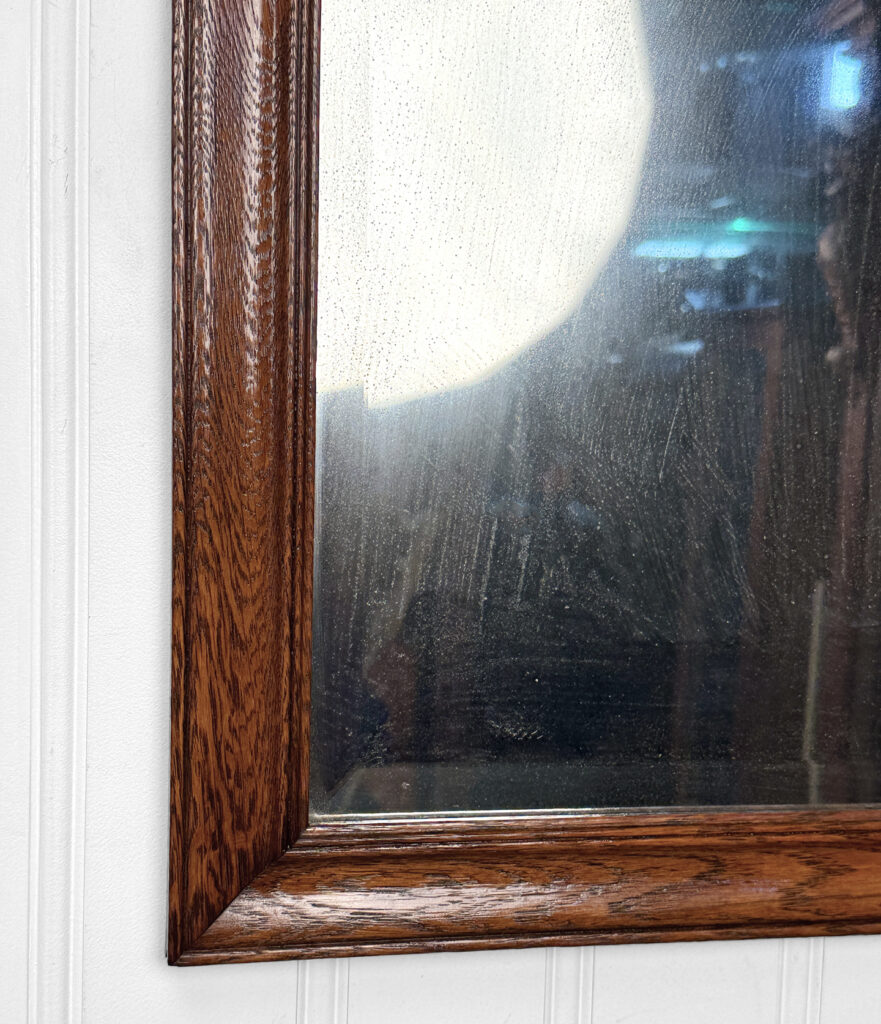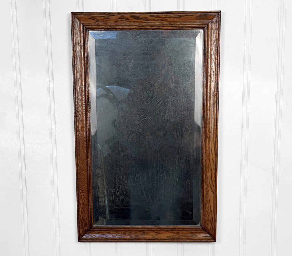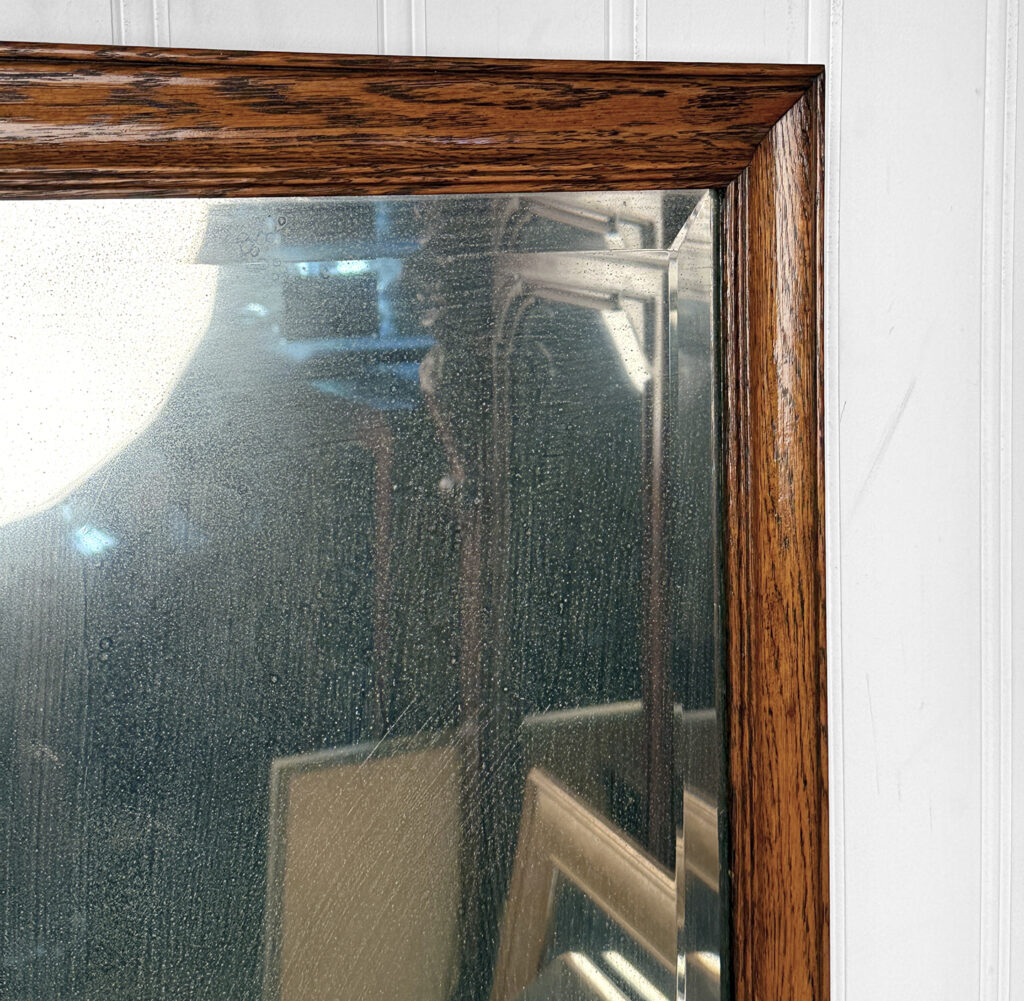 The oak frame is in really nice condition. The glass shows heavy hazing, but still reflects fine. If you’d like a new non-beveled glass panel, please message us.