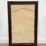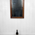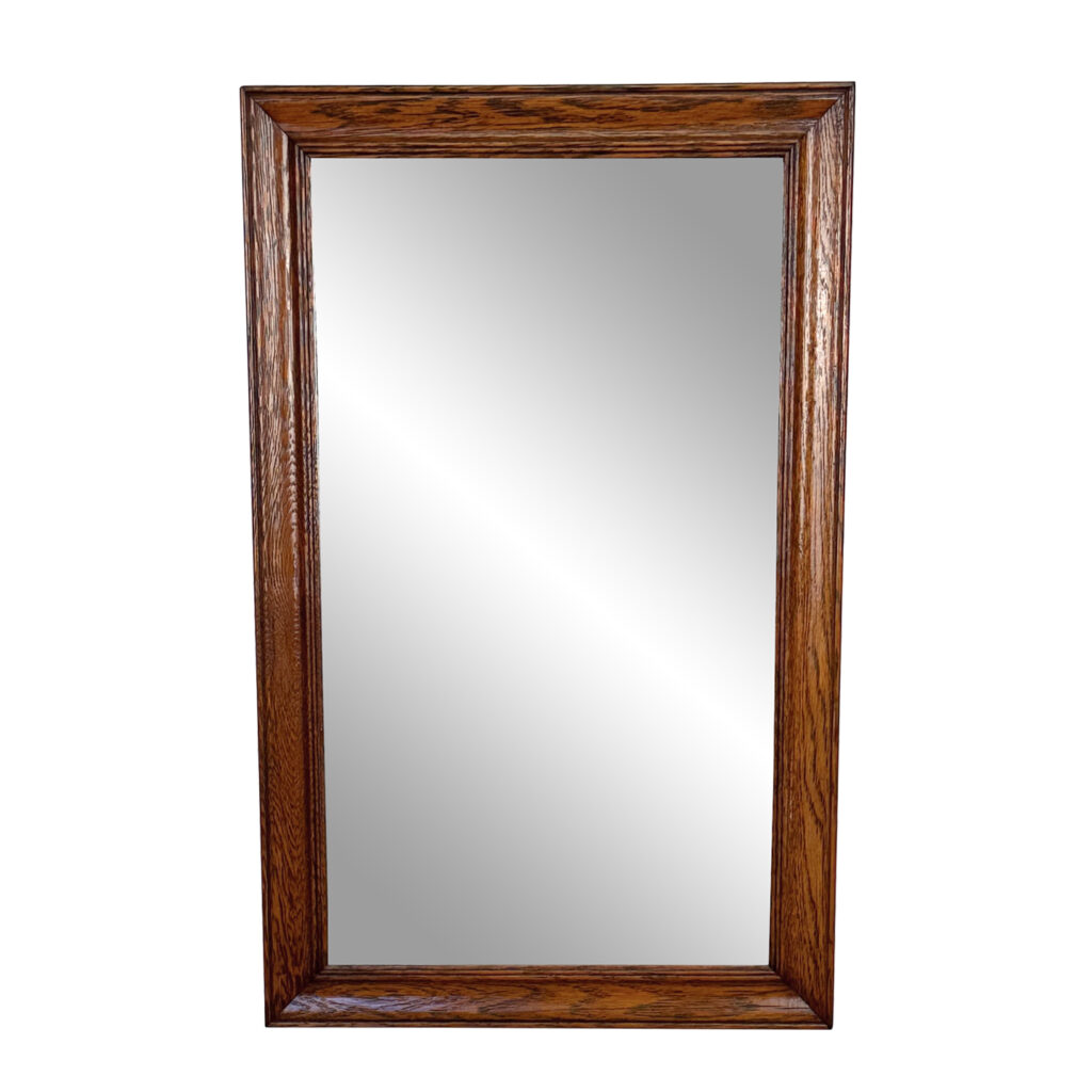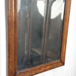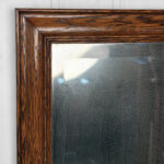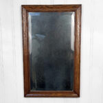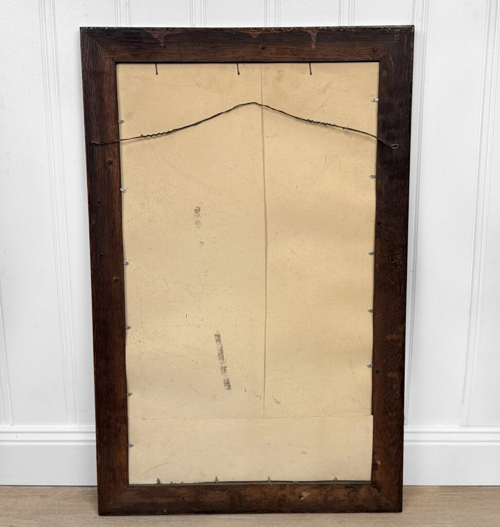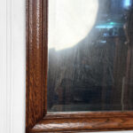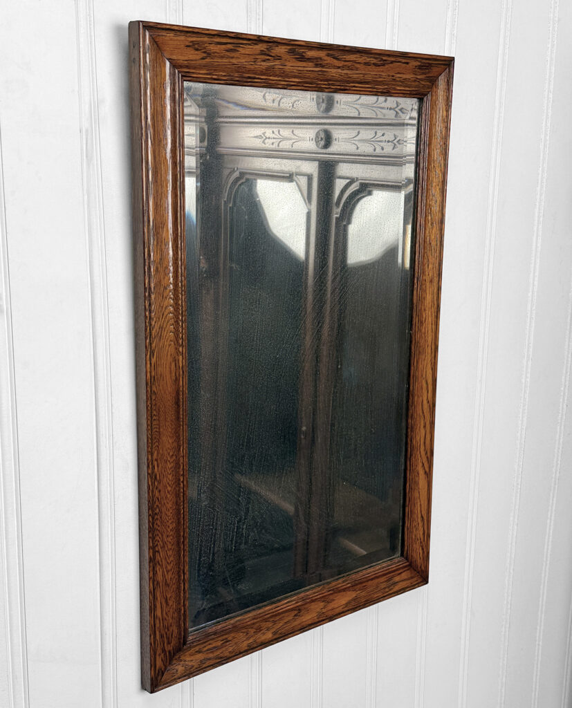 The oak frame is in really nice condition. The glass shows heavy hazing, but still reflects fine. If you’d like a new non-beveled glass panel, please message us.