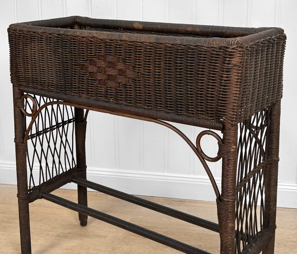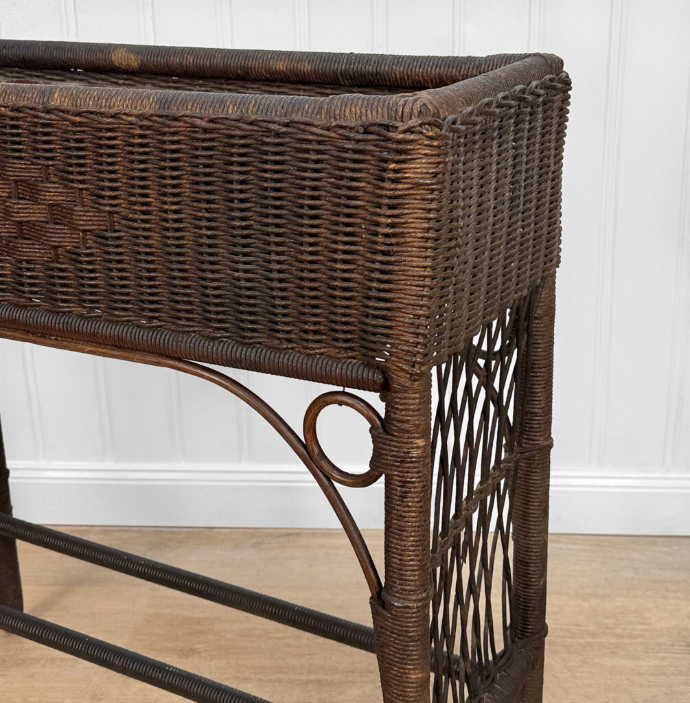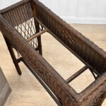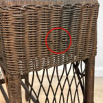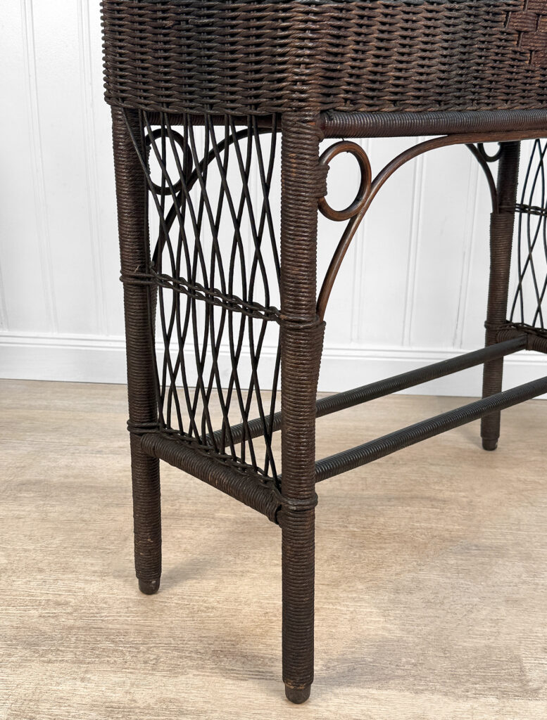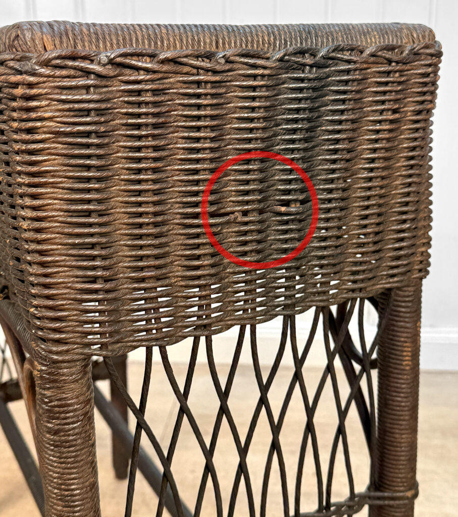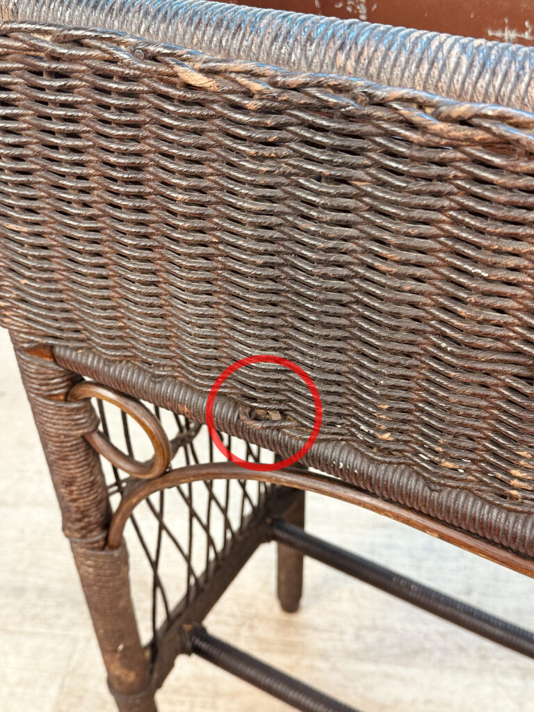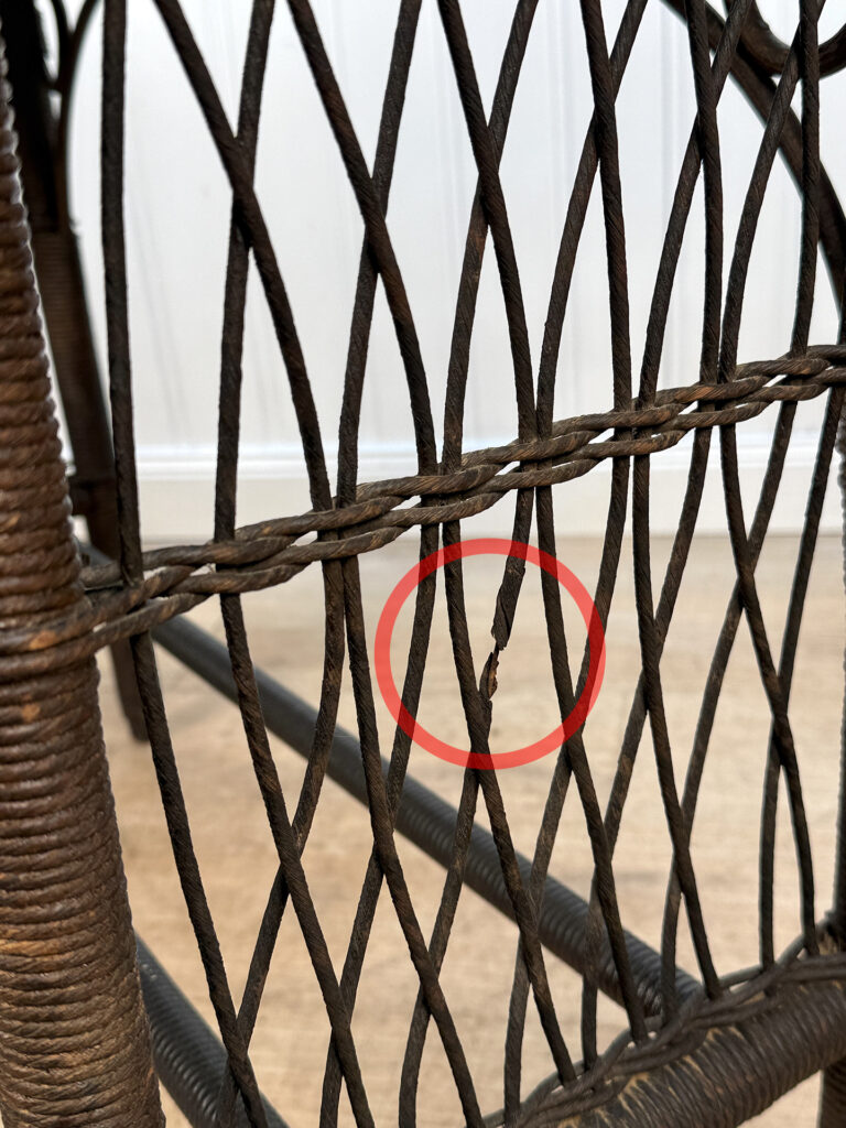 Overall good condition, solid, extremely sturdy and well made. Areas of worn finish and scratches adds to its character. There are 2 areas of woven wicker that broke, as well as an area of lattice work. These areas are circled in our photo gallery to reference.