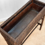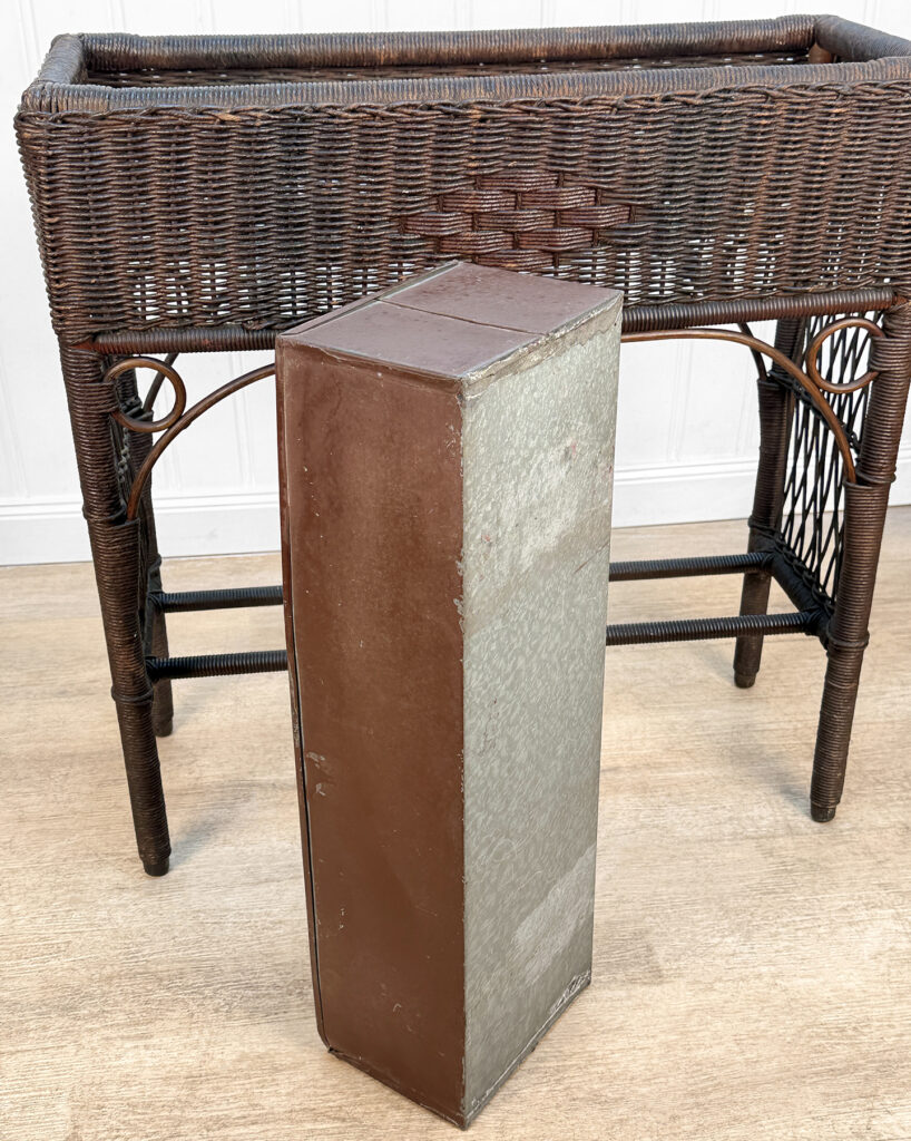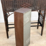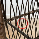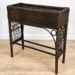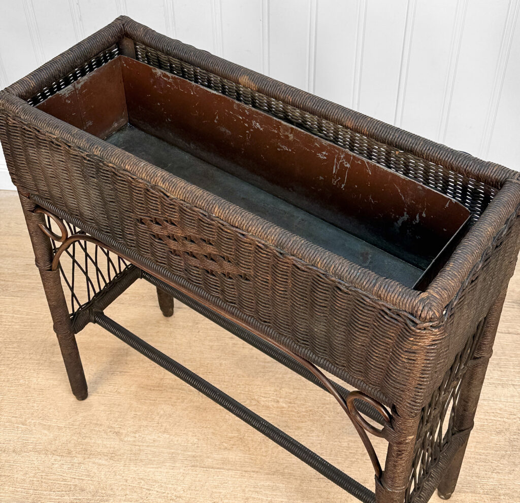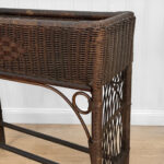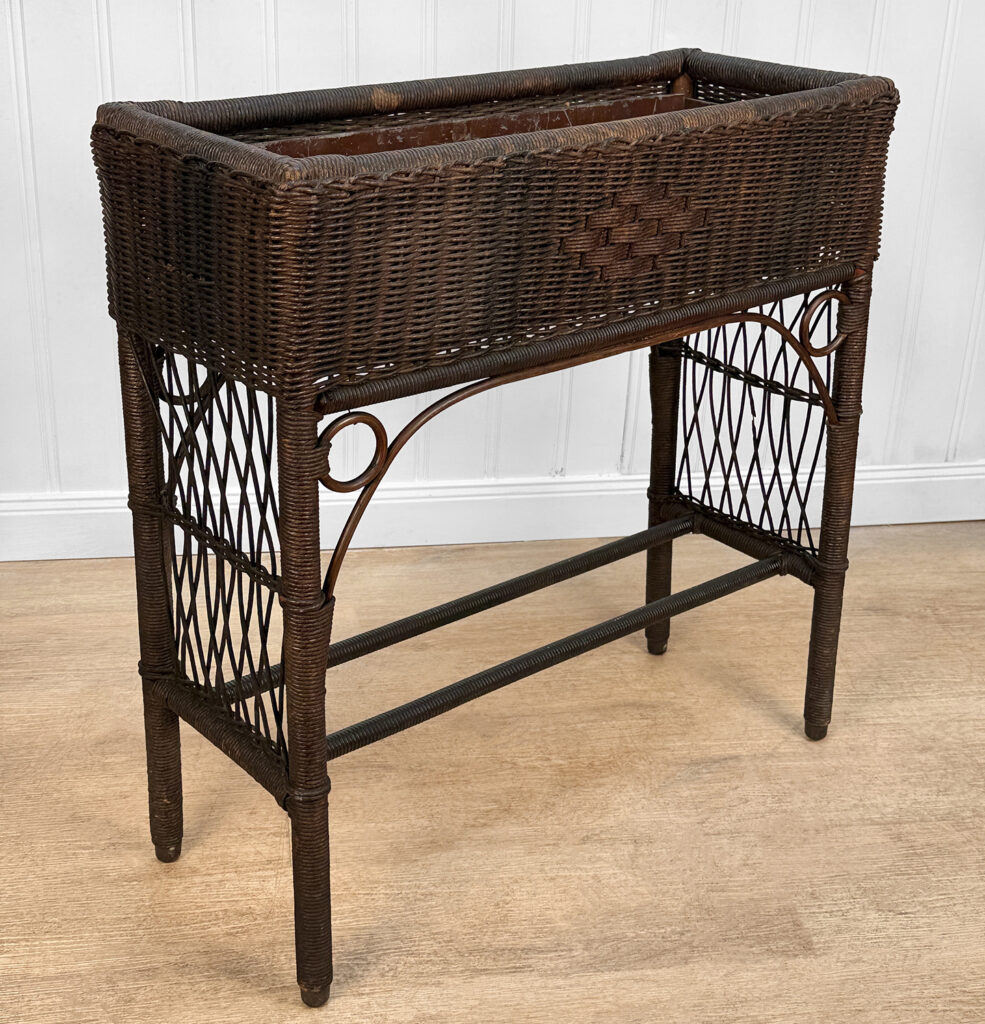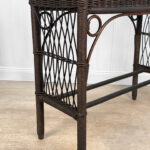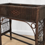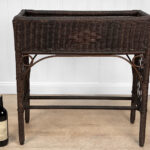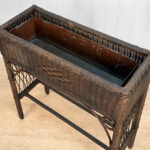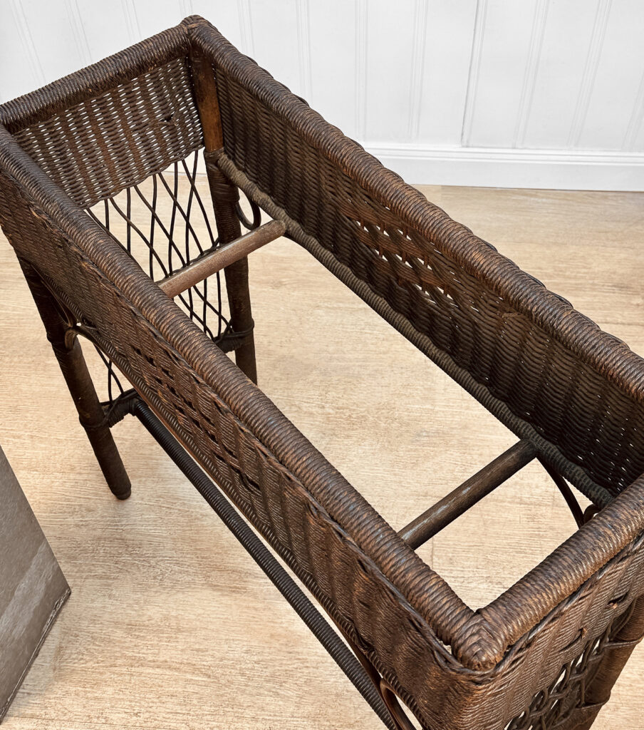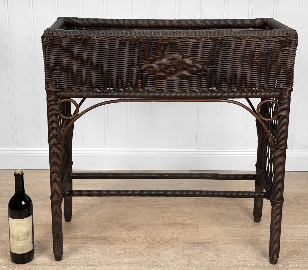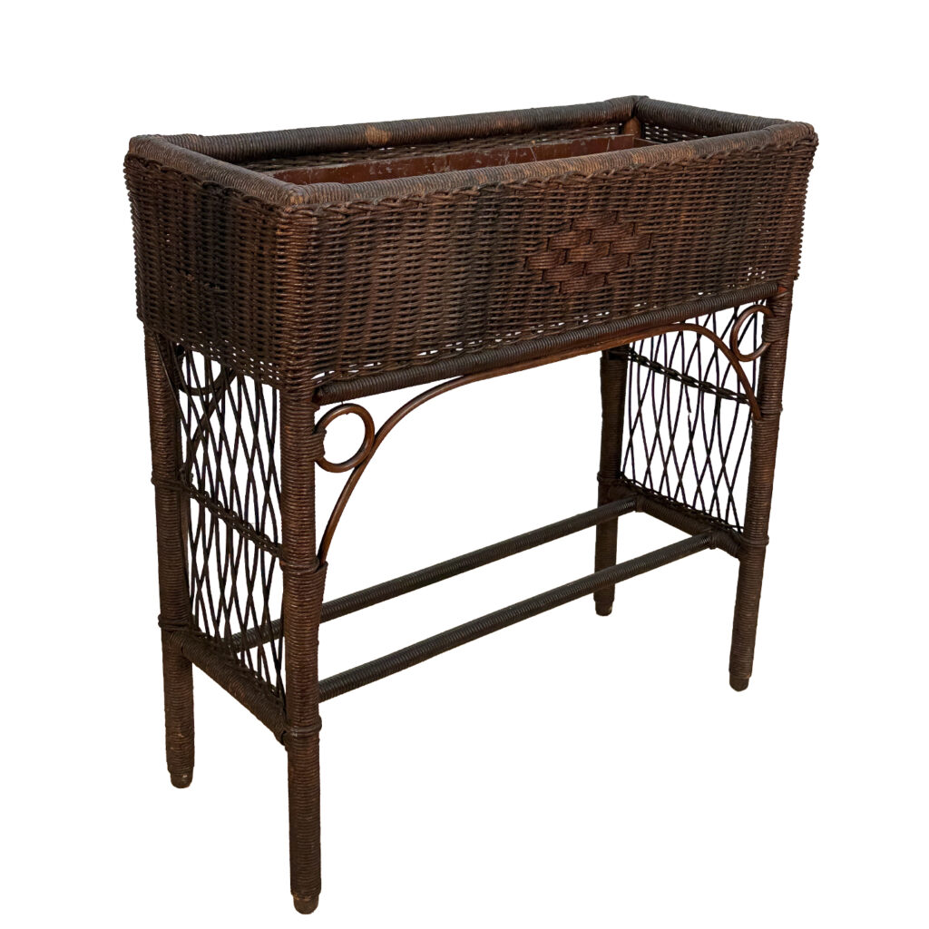 Overall good condition, solid, extremely sturdy and well made. Areas of worn finish and scratches adds to its character. There are 2 areas of woven wicker that broke, as well as an area of lattice work. These areas are circled in our photo gallery to reference.