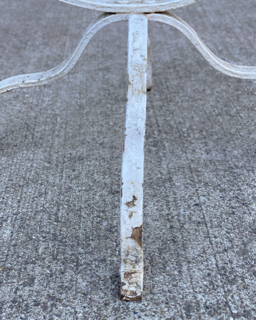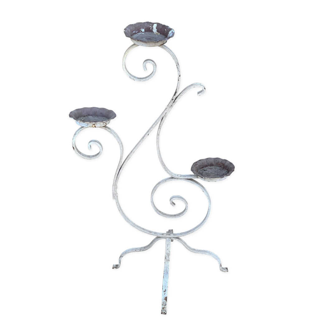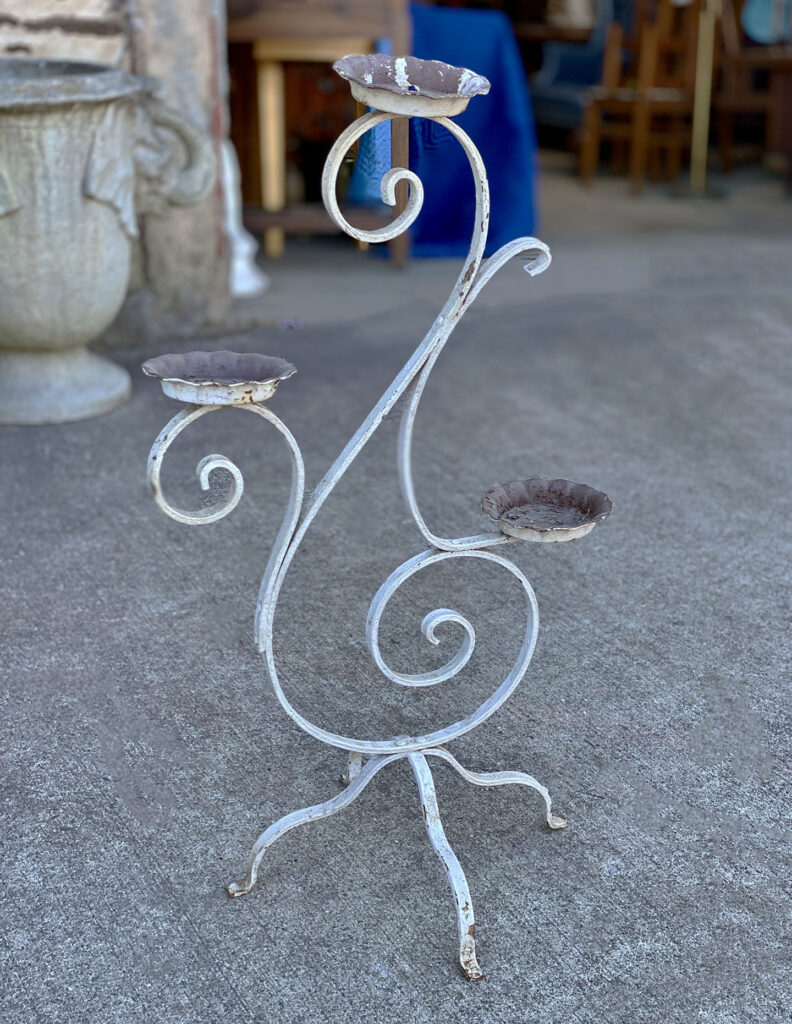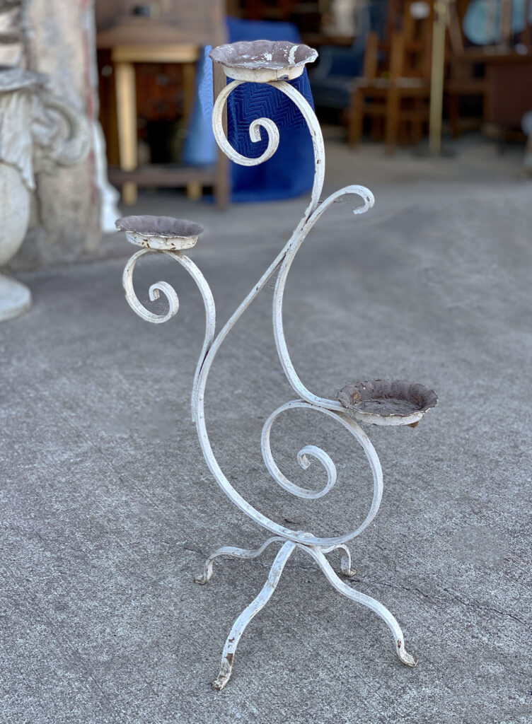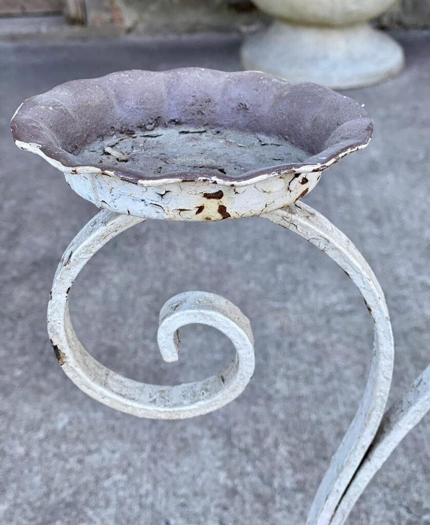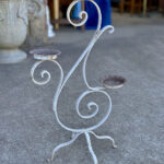 This Wrought Iron Garden Stand was exceptionally well made, it stand solid and sturdy. This piece was used outdoors and was exposed to the elements, you’ll find surface scratches, finish blemishes and surface rust. The Plant Holder Tiers shows pitting to the bottom with a series of small holes. These areas are circled in our photo gallery to reference.