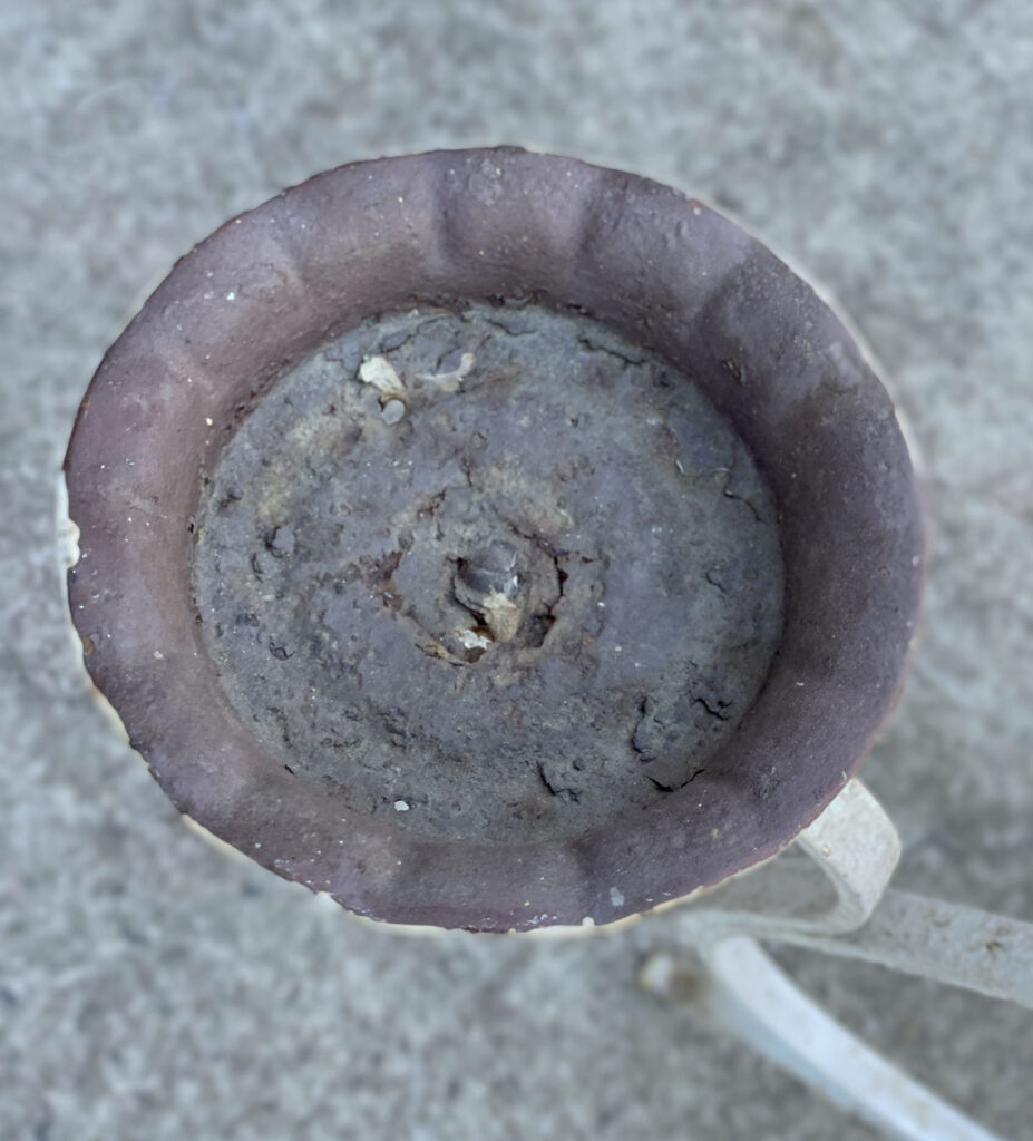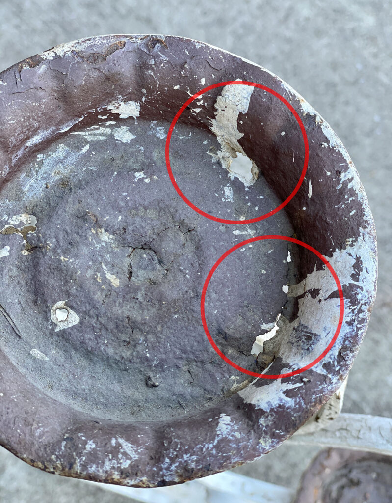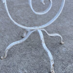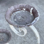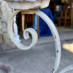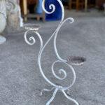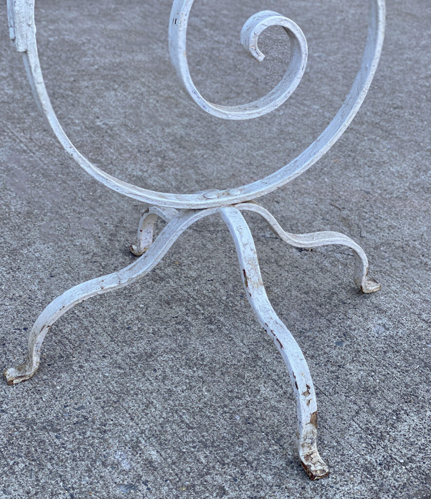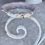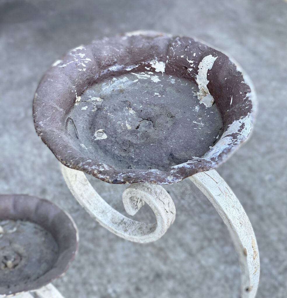 This Wrought Iron Garden Stand was exceptionally well made, it stand solid and sturdy. This piece was used outdoors and was exposed to the elements, you’ll find surface scratches, finish blemishes and surface rust. The Plant Holder Tiers shows pitting to the bottom with a series of small holes. These areas are circled in our photo gallery to reference.