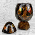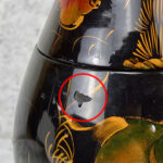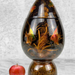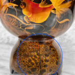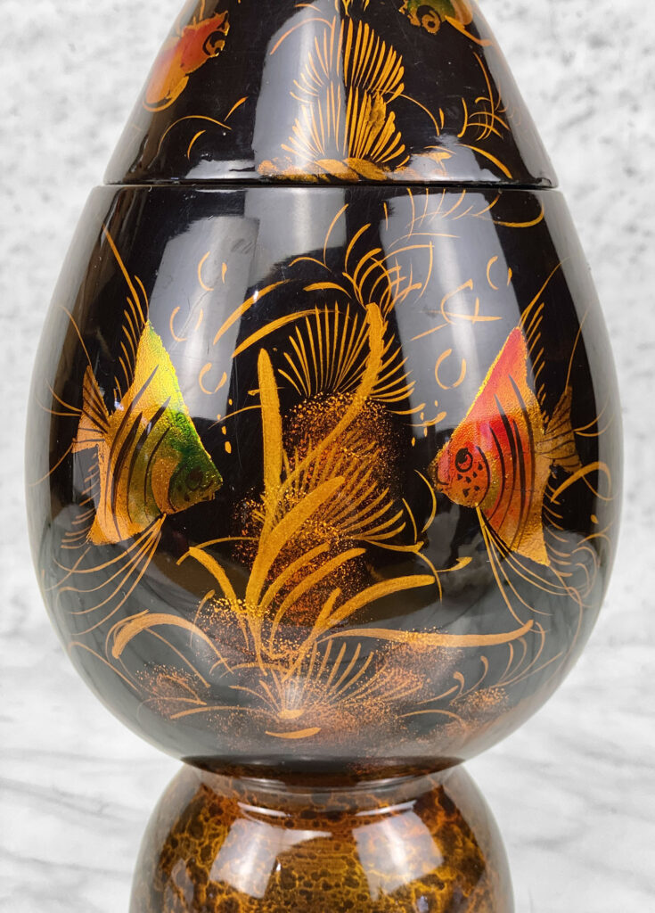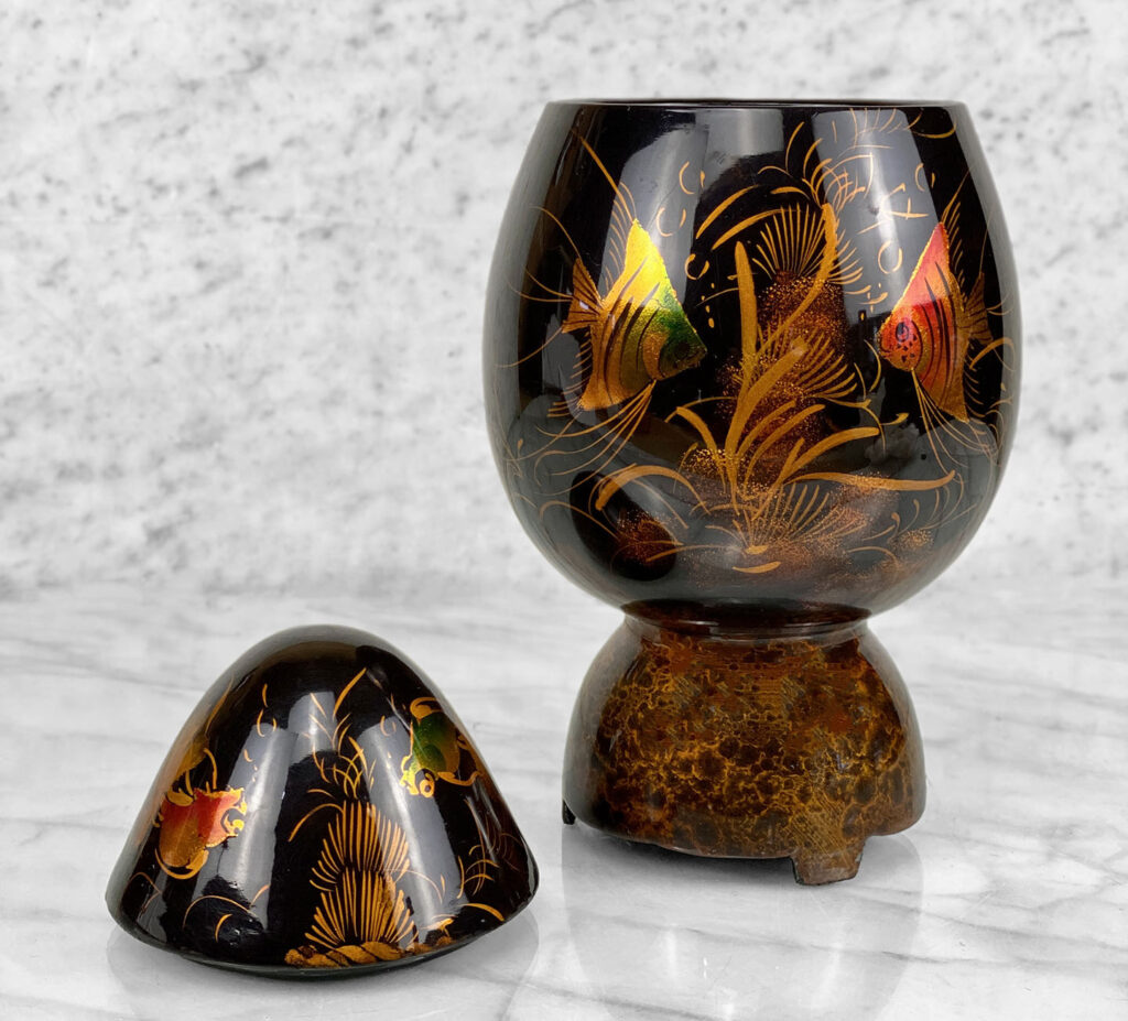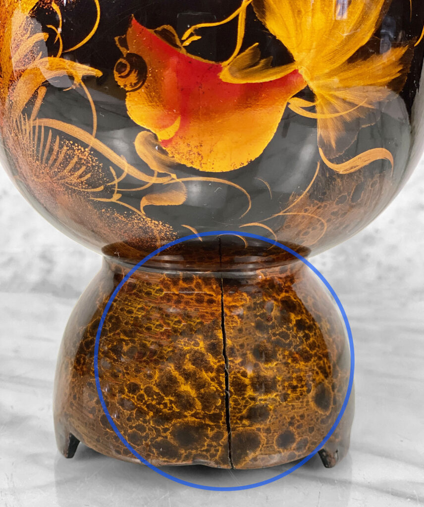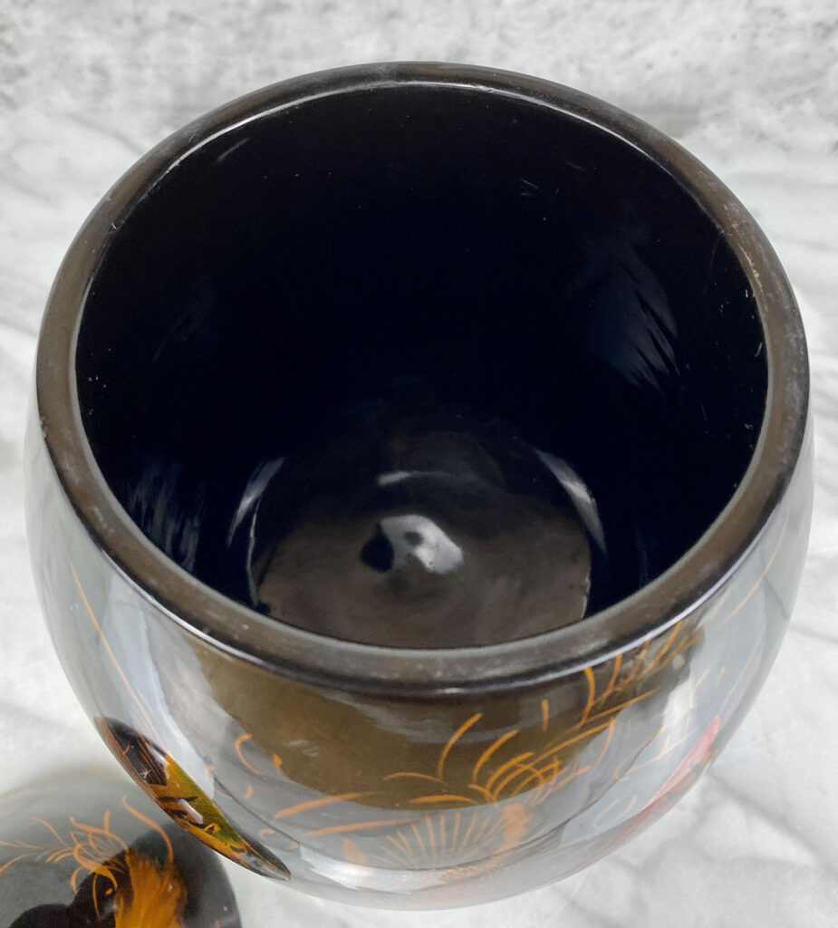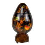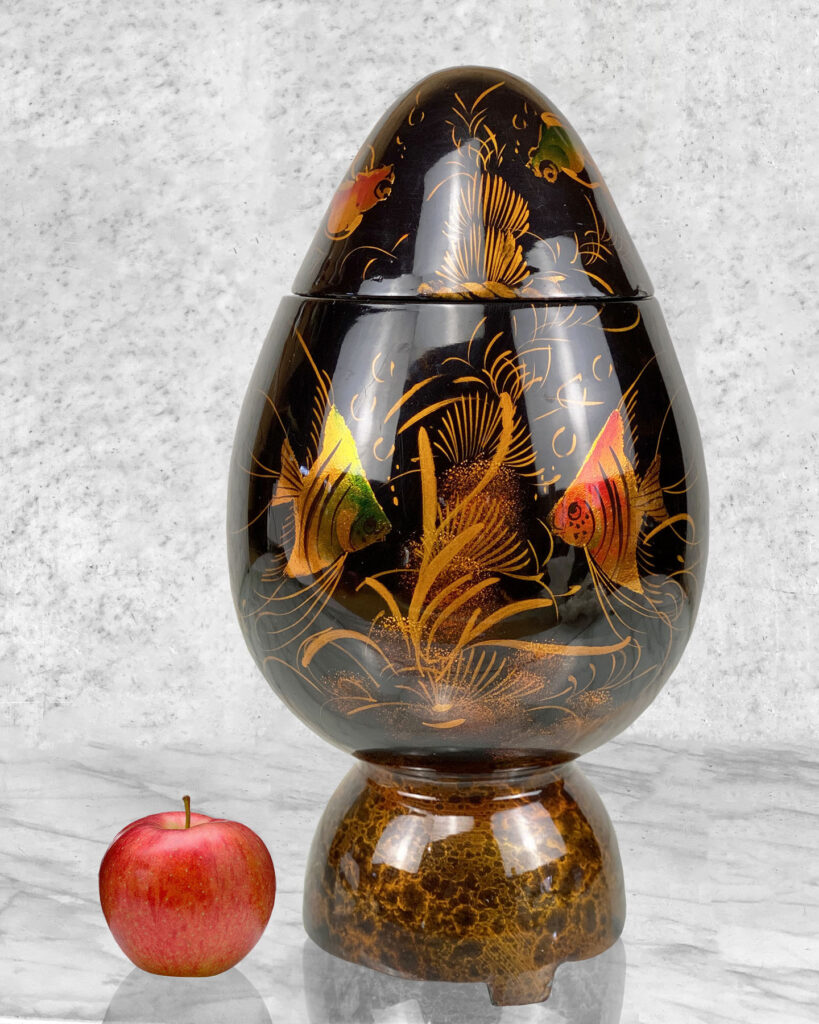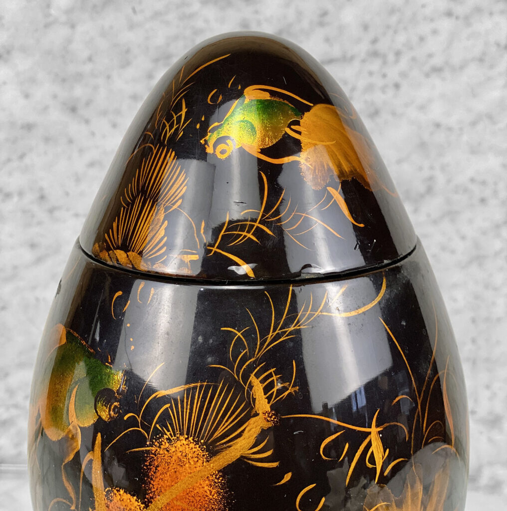 This Asian Lacquered Storage Egg is in overall good condition. A crack along the bottom base can be seen. This area does not effect the way the piece stands, it also doesn’t appear to have movement. Mild blemishes to the lacquer finish can be seen from age. The piece is in overall nice condition and looks lovely while staged.