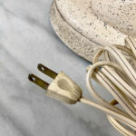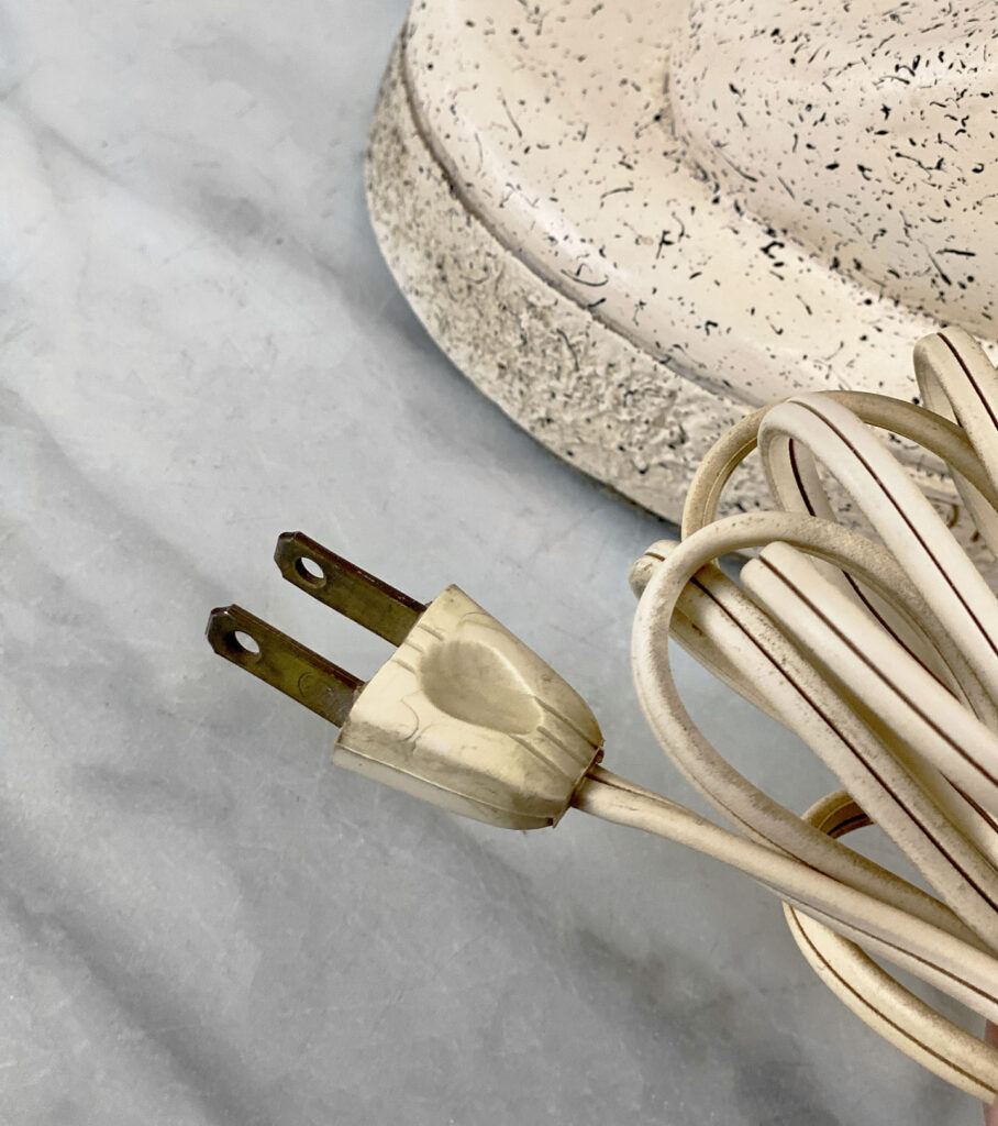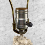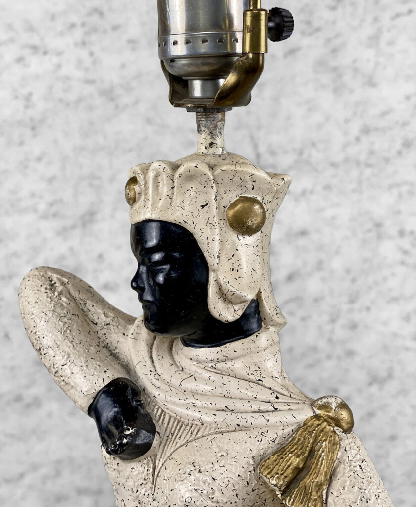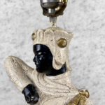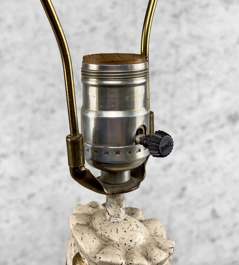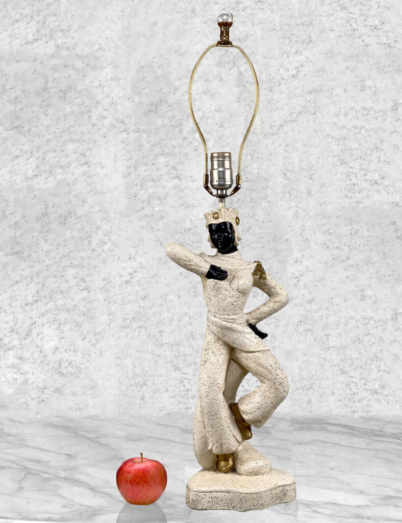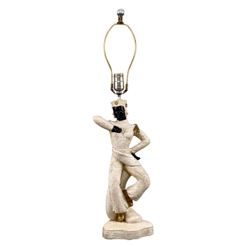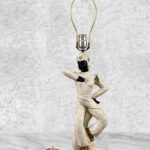 This Atomic Figural Chalkware Lamp is fully tested and works as it should, it does not require rewiring. The chalkware lamp is free of any cracks or repairs. Mild scratches and blemishes to the lacquered finish can be seen from age. There is not a shade included.