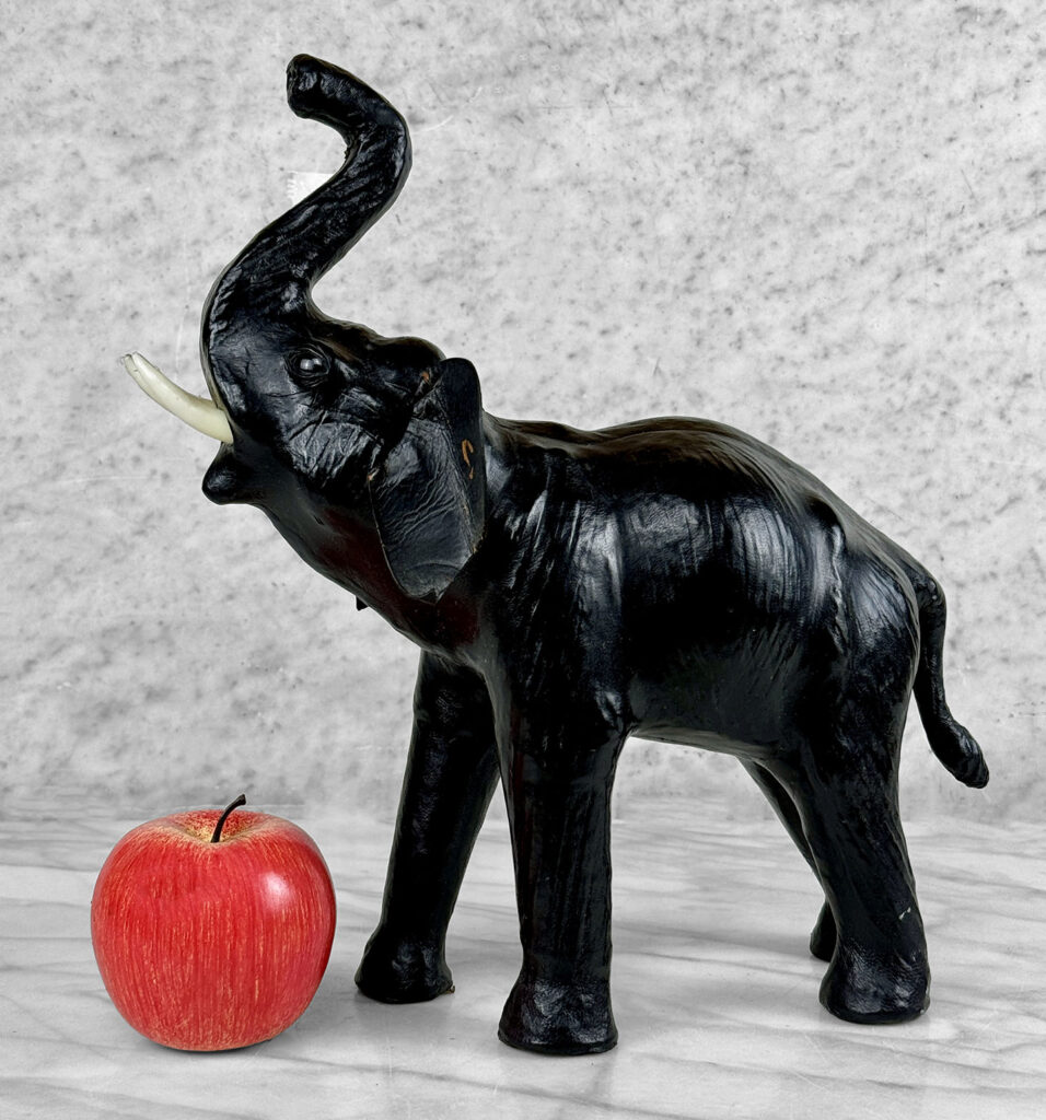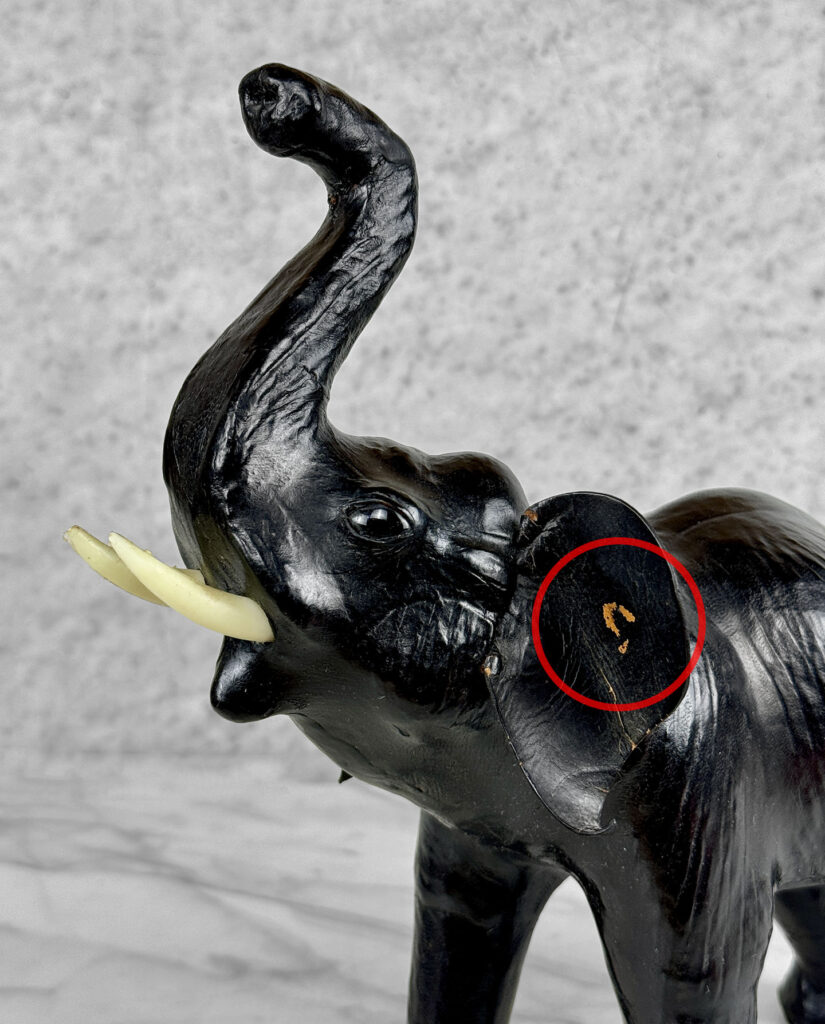 This Leather Wrapped Elephant Sculpture is in overall good condition without any repair shown. Surface scratches to the leather can be seen from age, most notably along the elephants ear. We’ve circled this area in our photo gallery to reference.