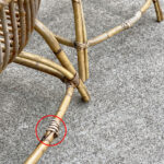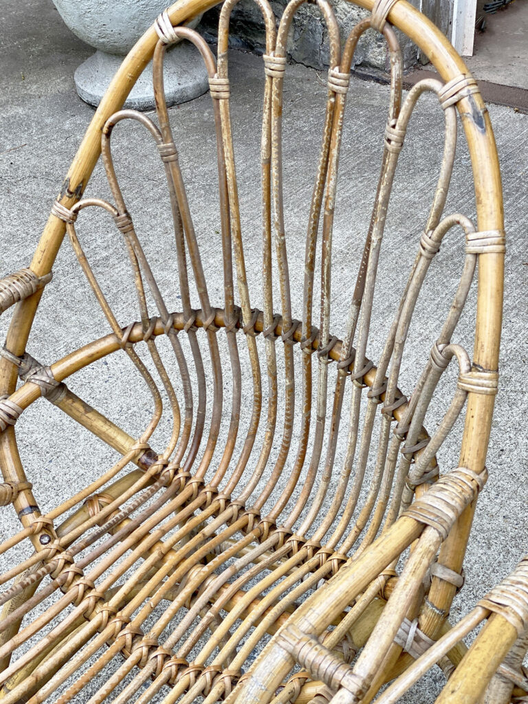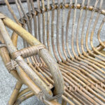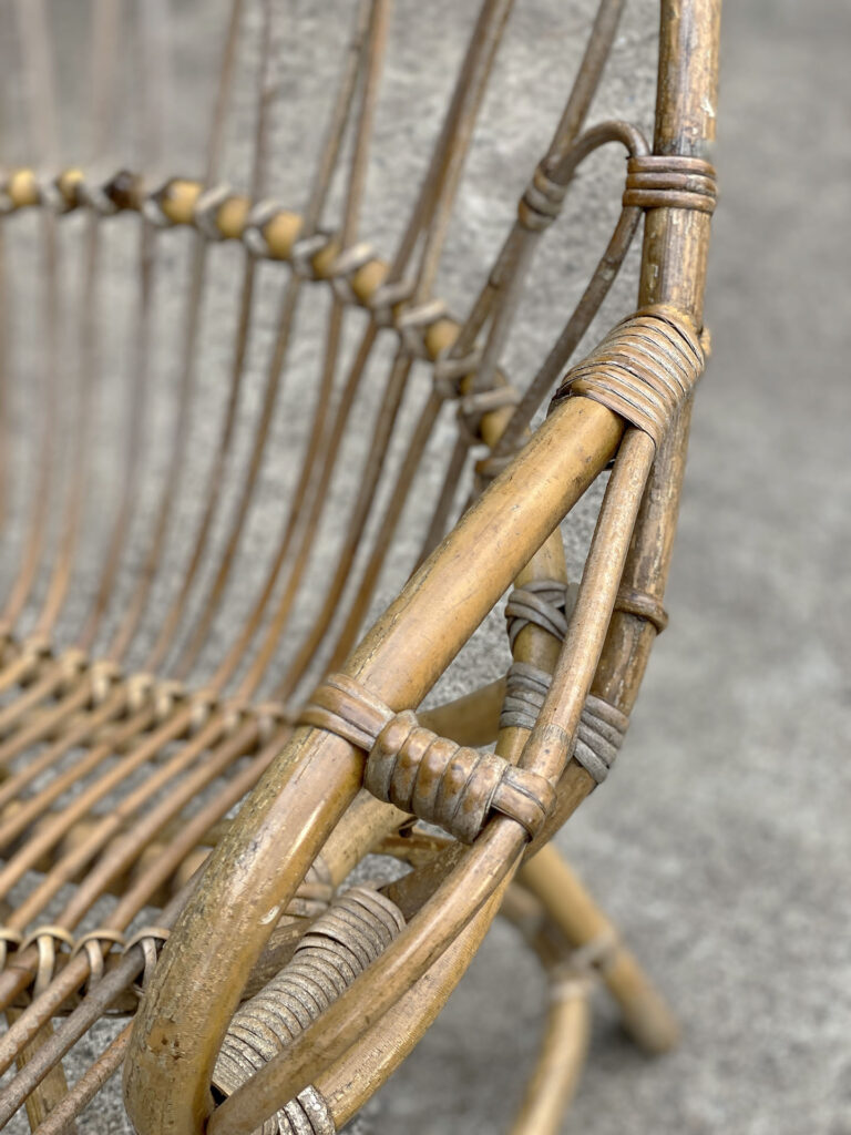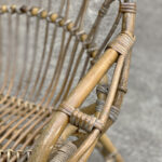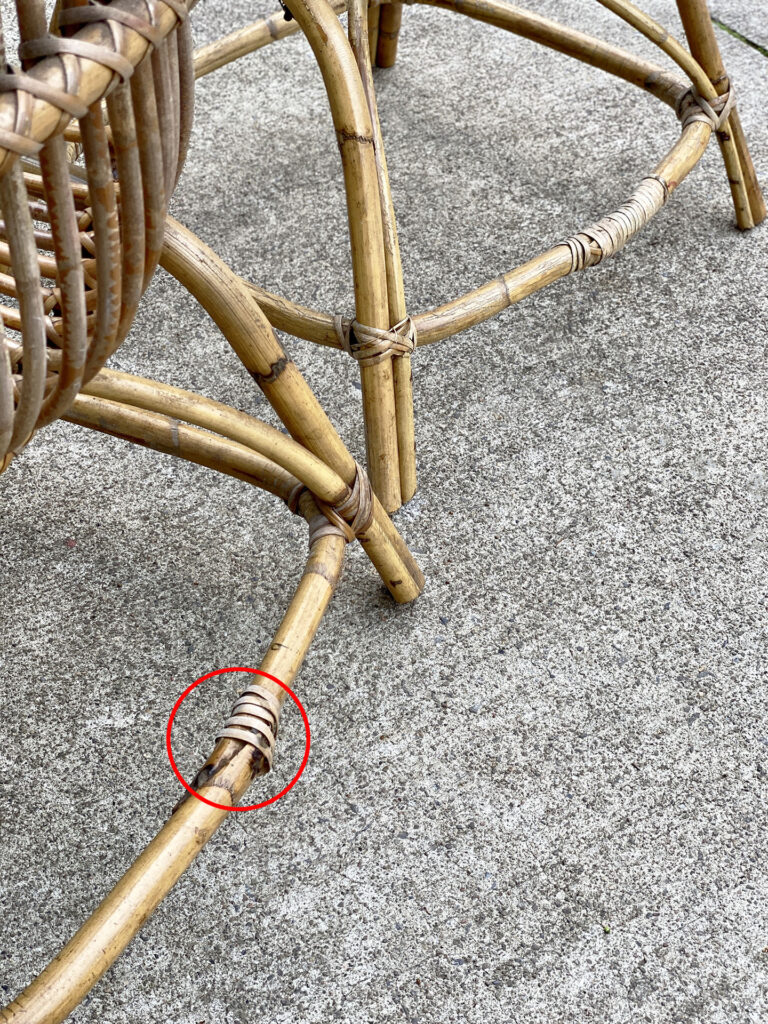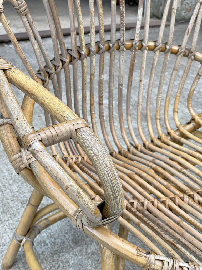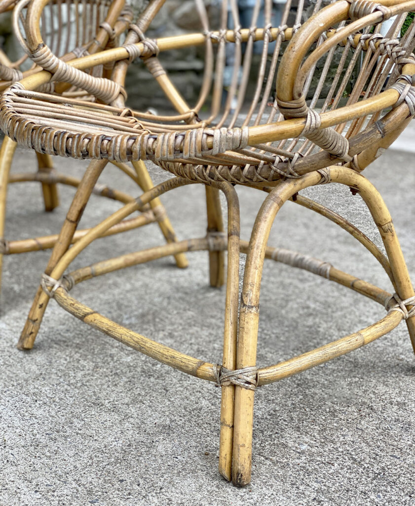This Pair of Rattan Accent Chairs were exceptionally well made. Each Chair is solid and sturdy and makes for a comfortable seat. Fading to the natural rattan can be seen in areas, although each shoot is fully intact. Wear along the natural caning can be seen.