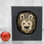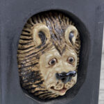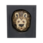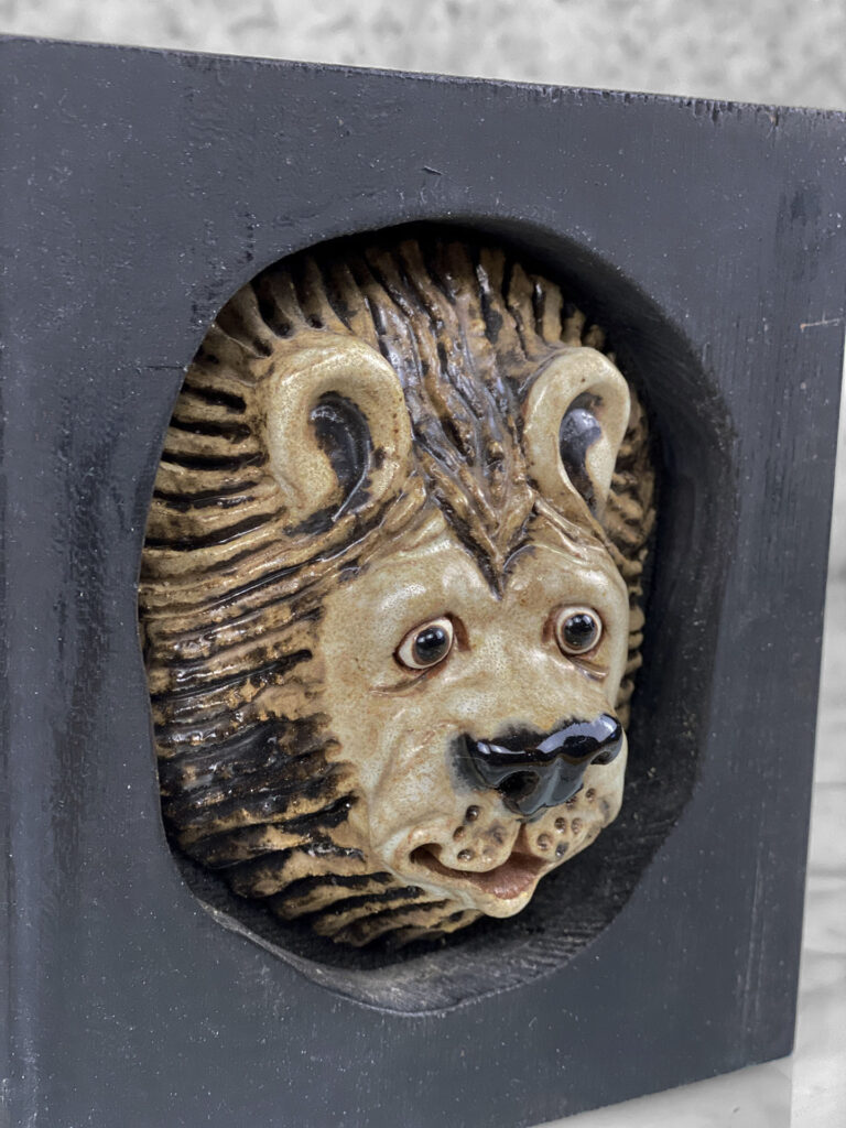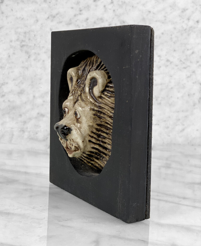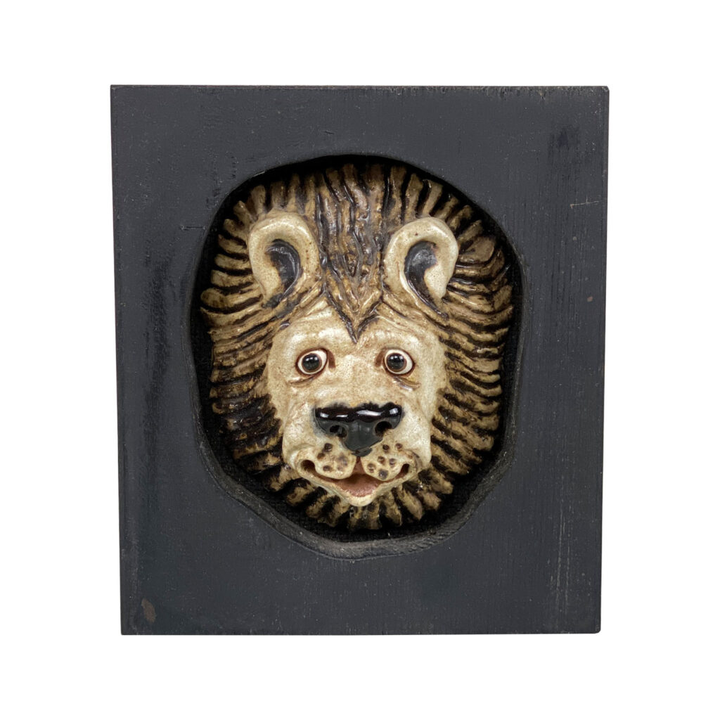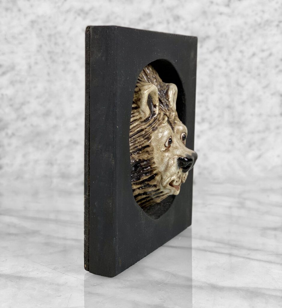 This Pottery Lion Sculpture Plaque is in overall good condition without any cracks, chips or repairs shown. Mild surface scratches can be seen along the wooden plaque frame.