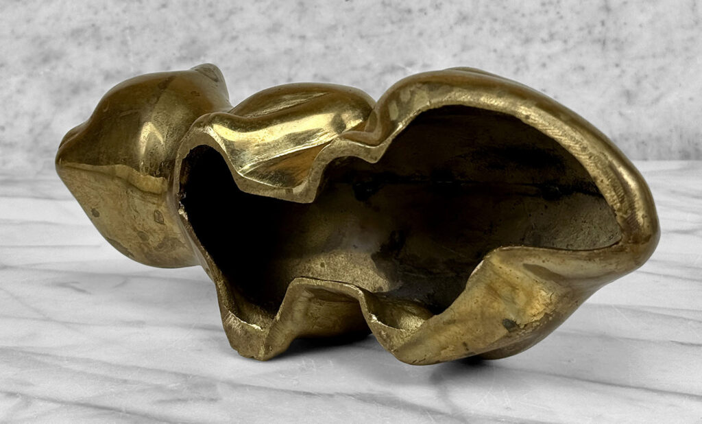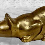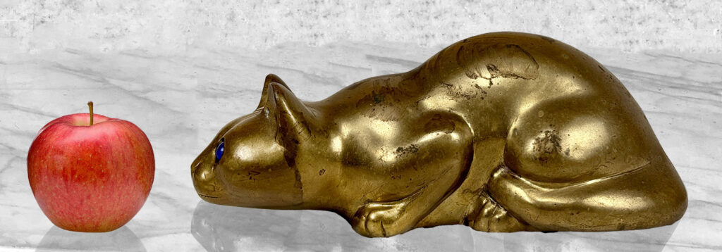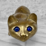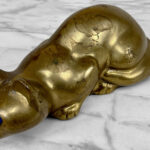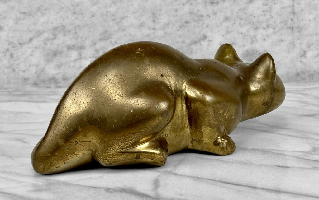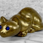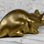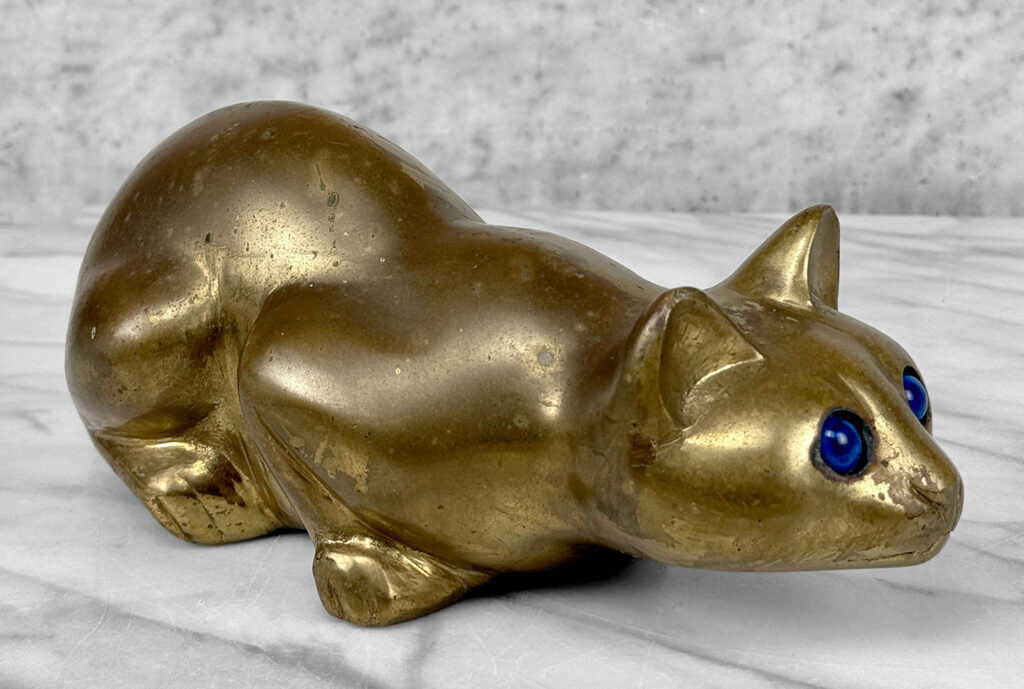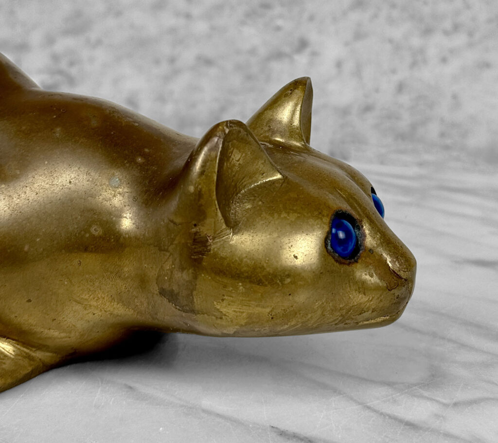 This Brass Cat Sculpture is in overall good condition. The brass is nicely aged, showing a fair amount of tarnishing and patina to the surface. The brass is unpolished or heavily cleaned – It shows great character. The eyes are fully intact.