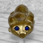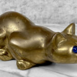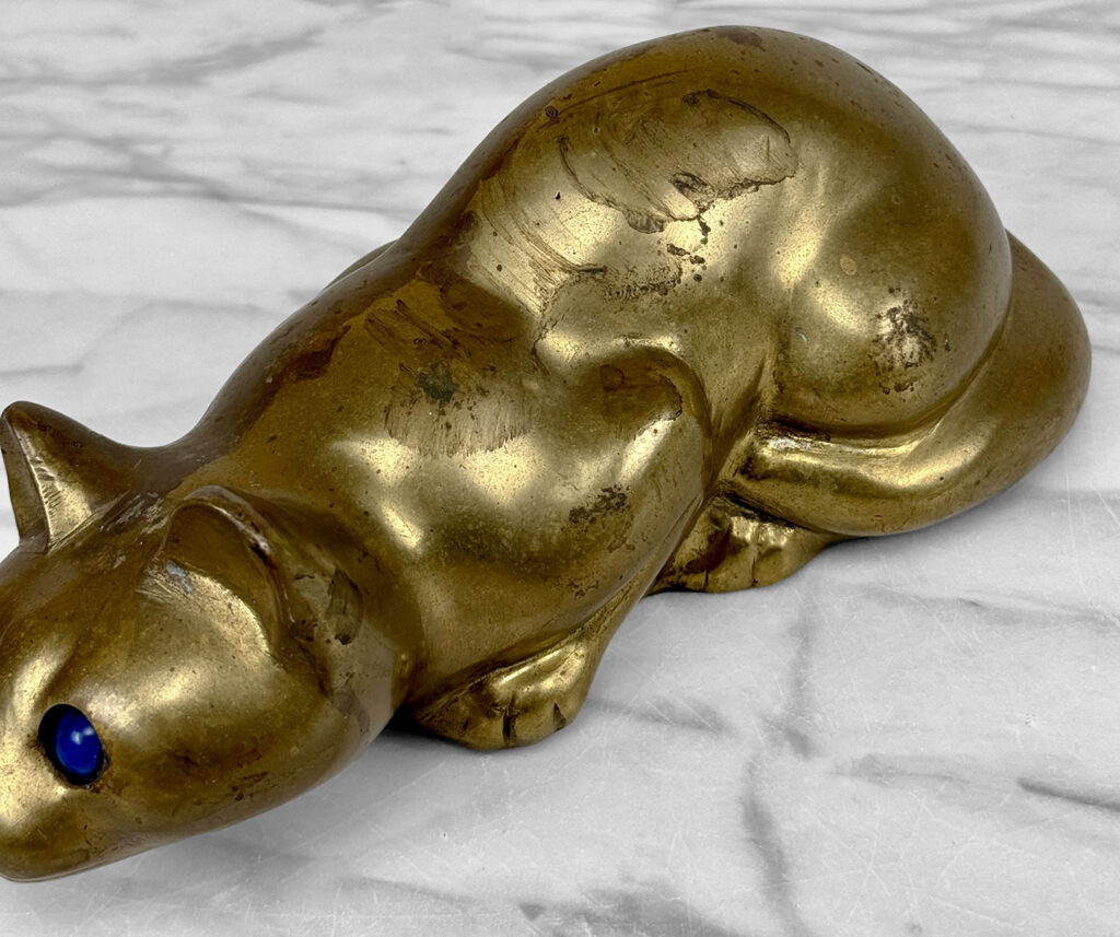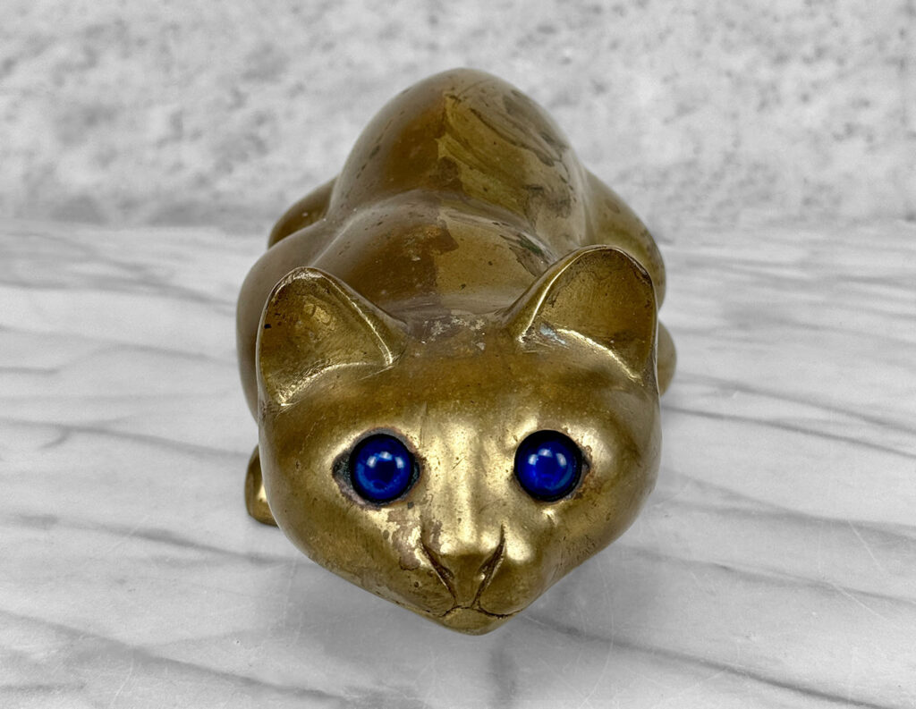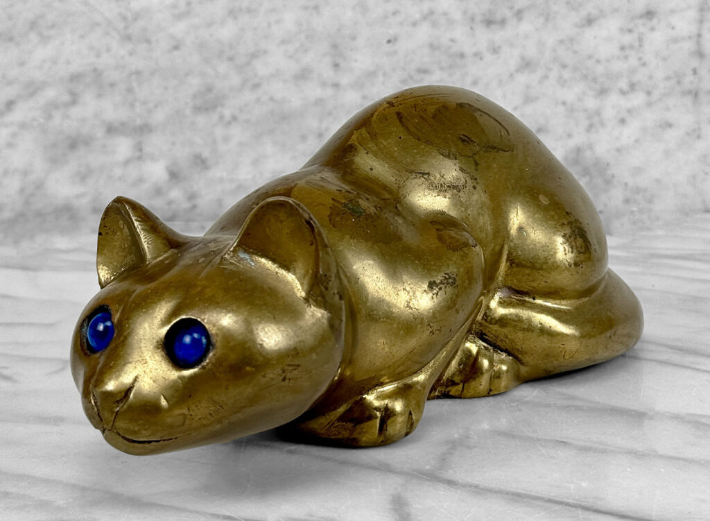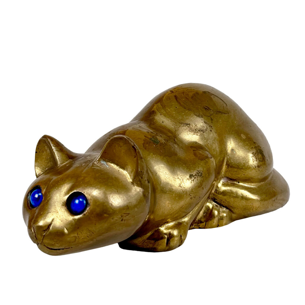 Vintage Traditional Brass Crouching Blue Eyed Cat Sculpture, c. Mid 20th Century