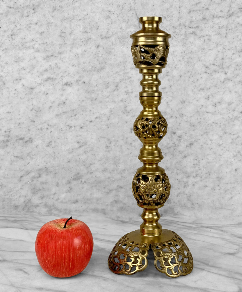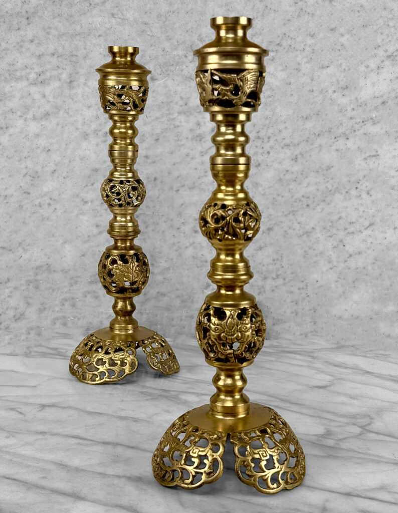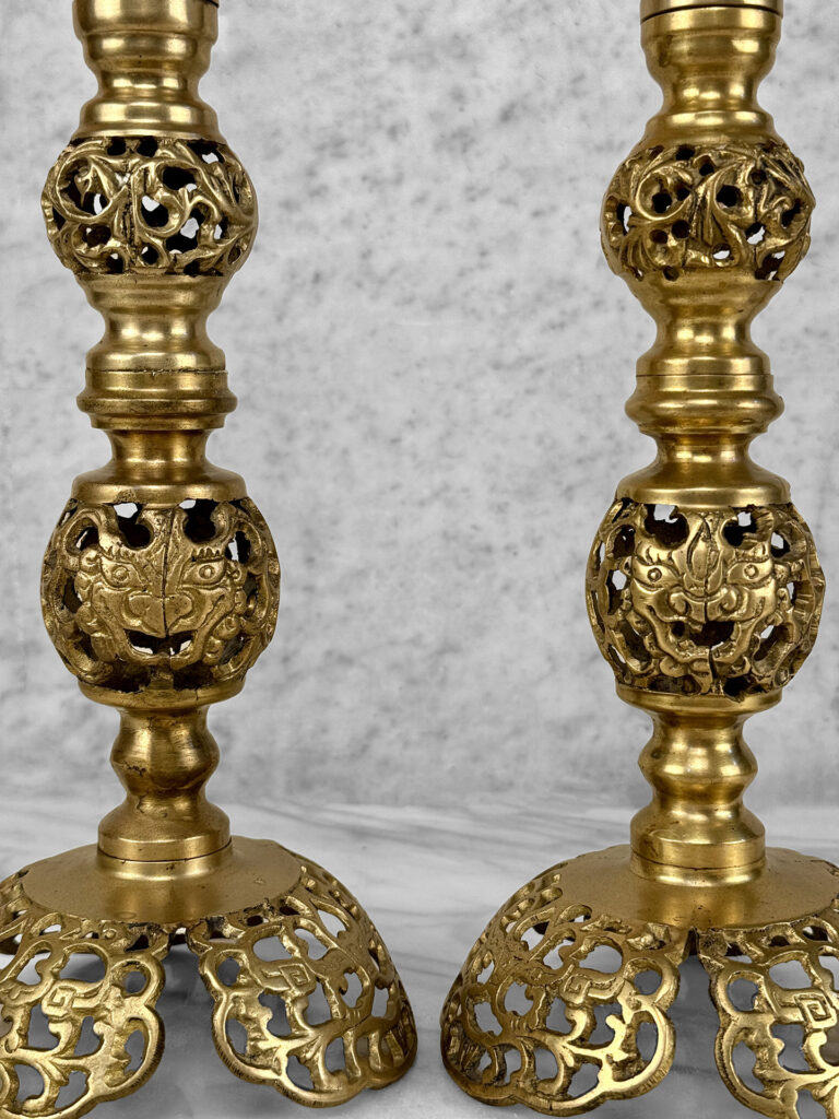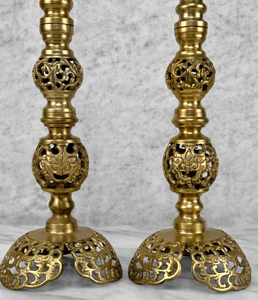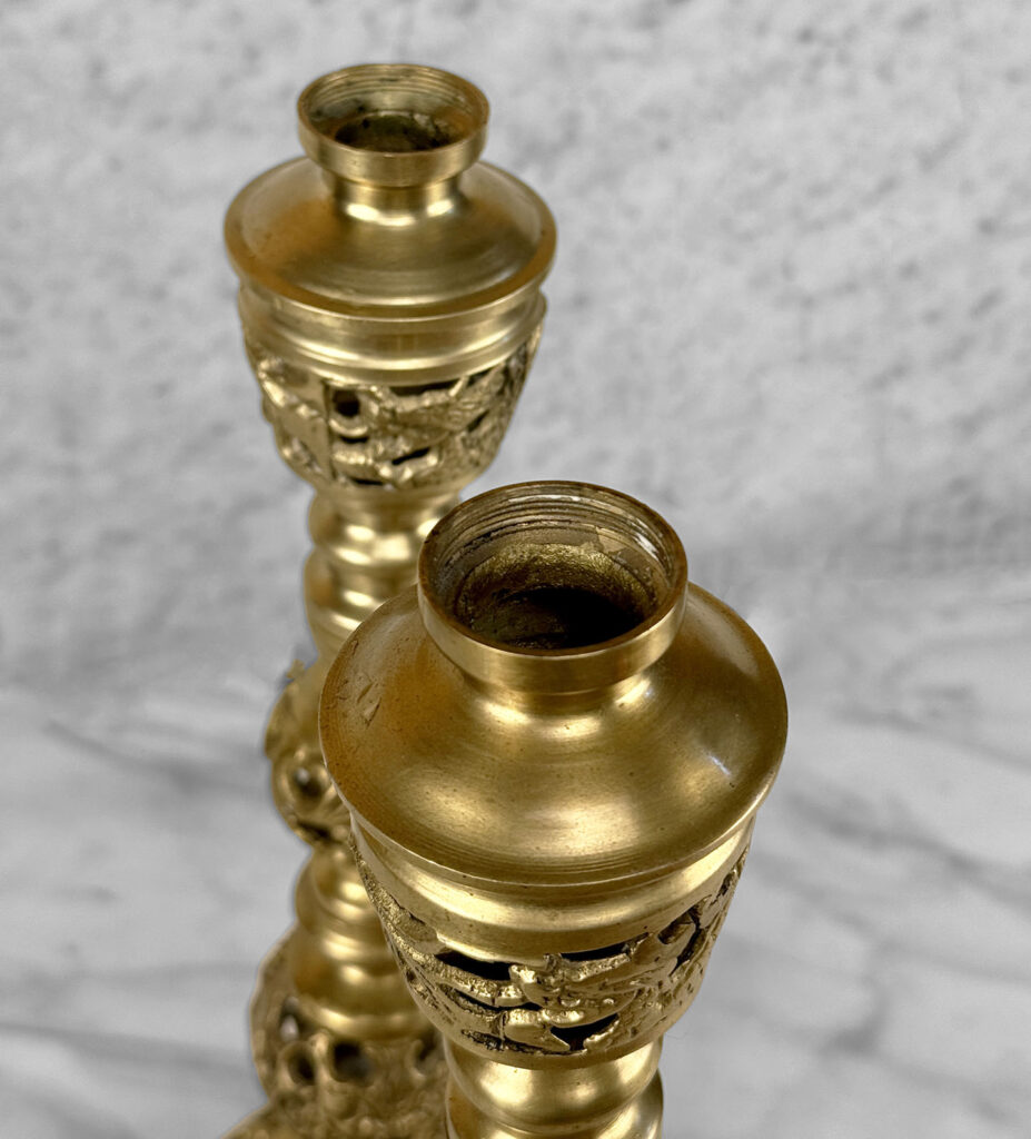 Vintage Large Chinese Brass Dragon Motif Candlestick Holders, A Pair, c.1970’s