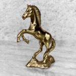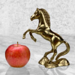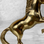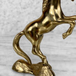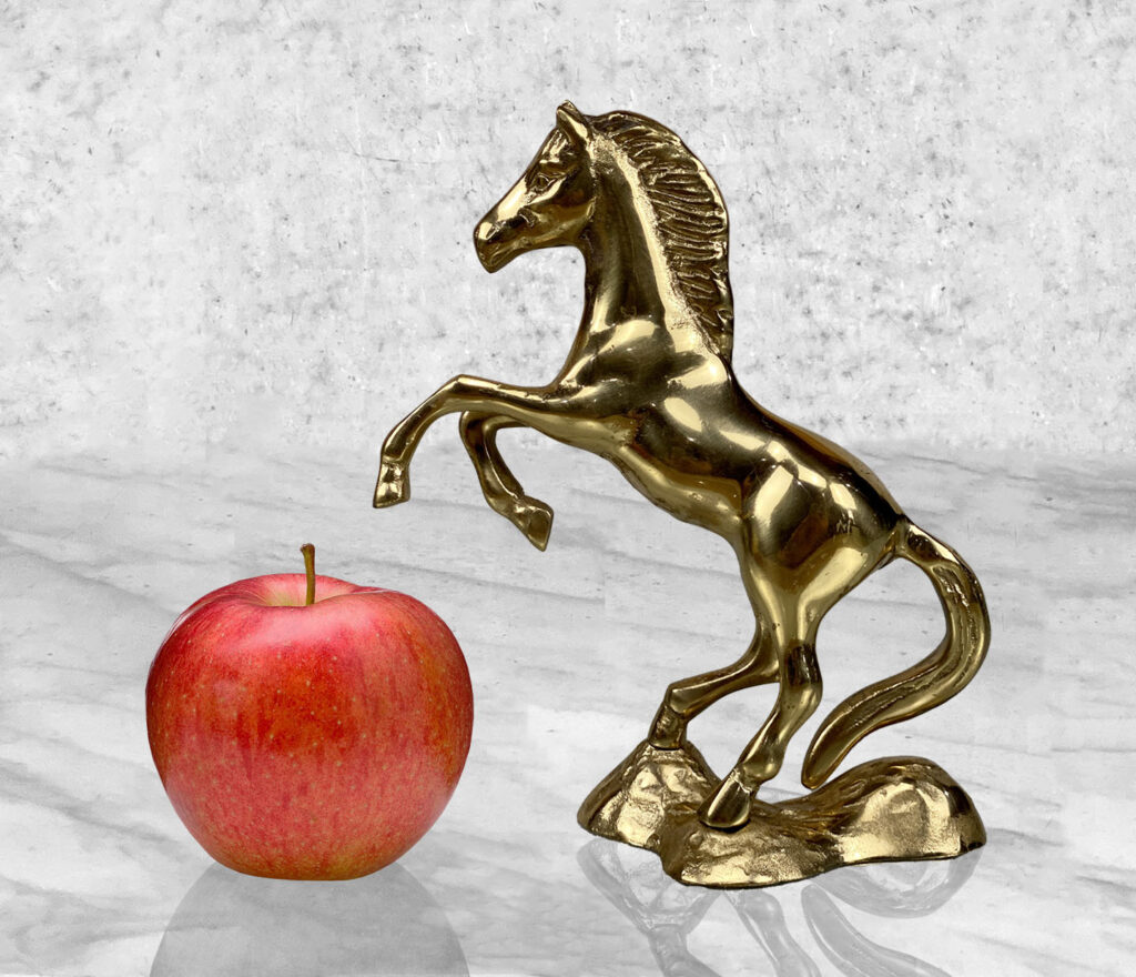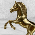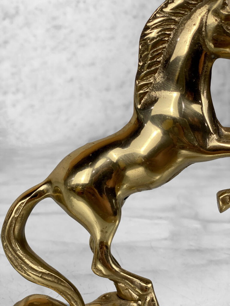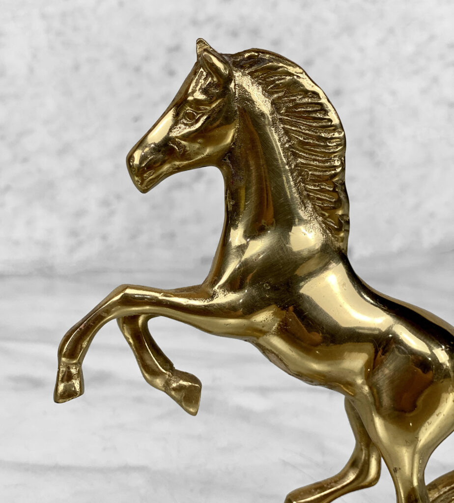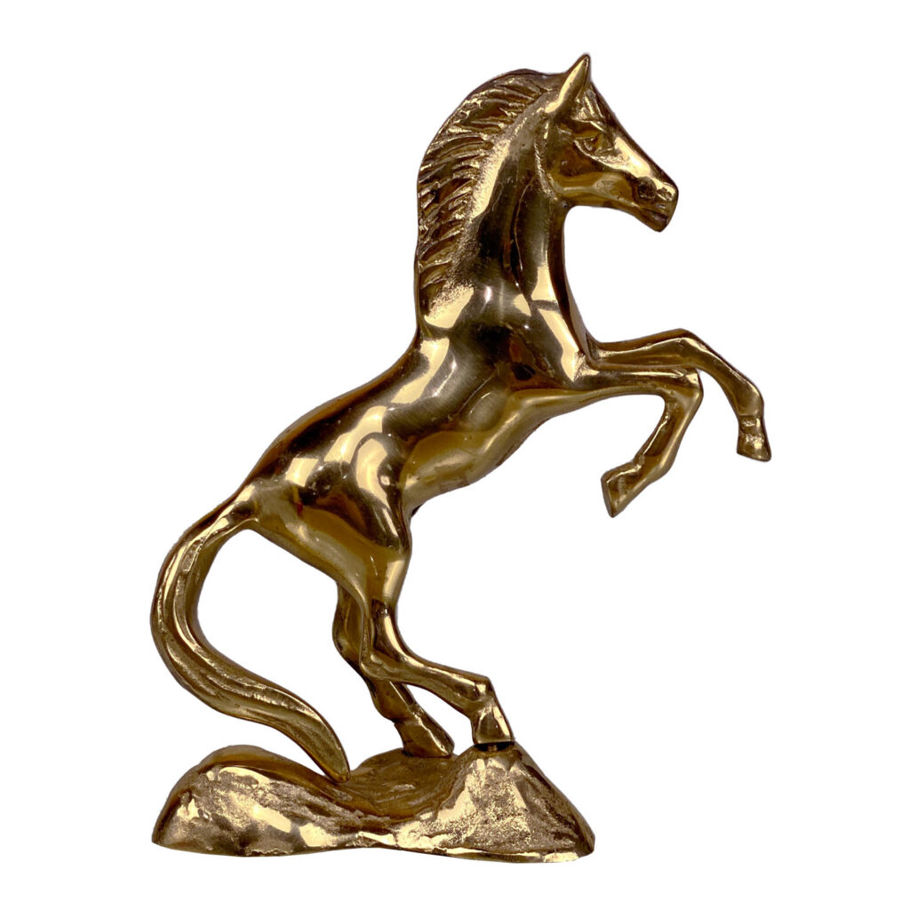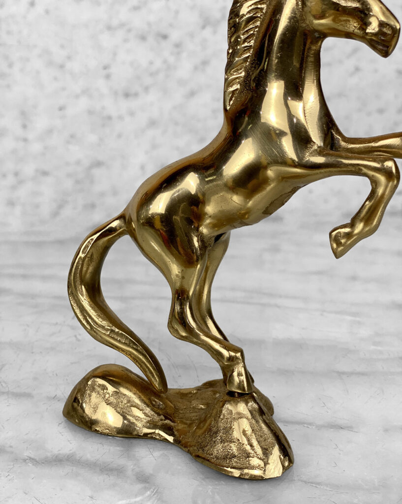 This Traditional Brass Horse Sculpture is in overall good condition. The Brass is nicely aged, showing mild tarnishing and surface scratches to the finish; This makes a great display piece.