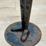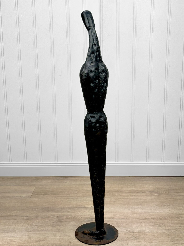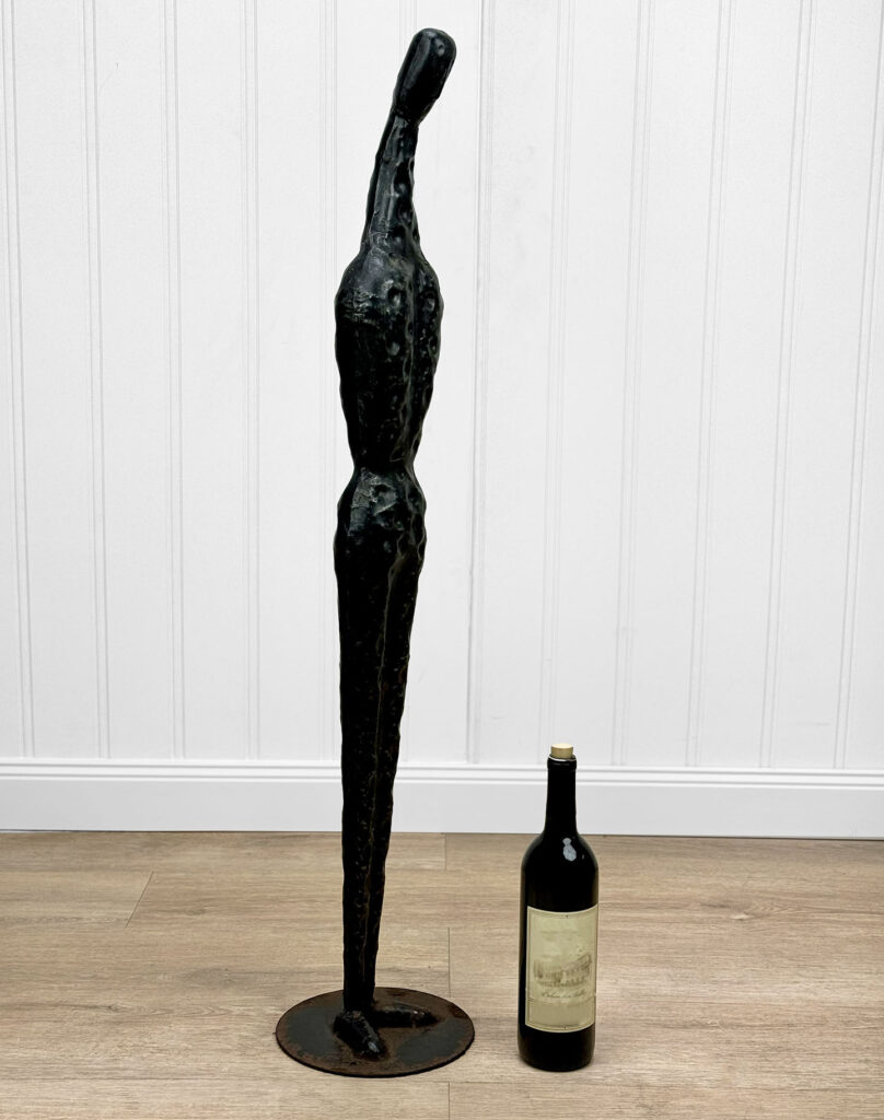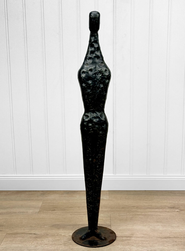 This Brutalist Metal Art Sculpture was exceptionally well made. Despite the sculptures unusual proportions, it stands upright as it should. Surface rust along the bottom base can be seen from age. There aren’t any repairs shown.