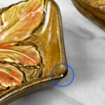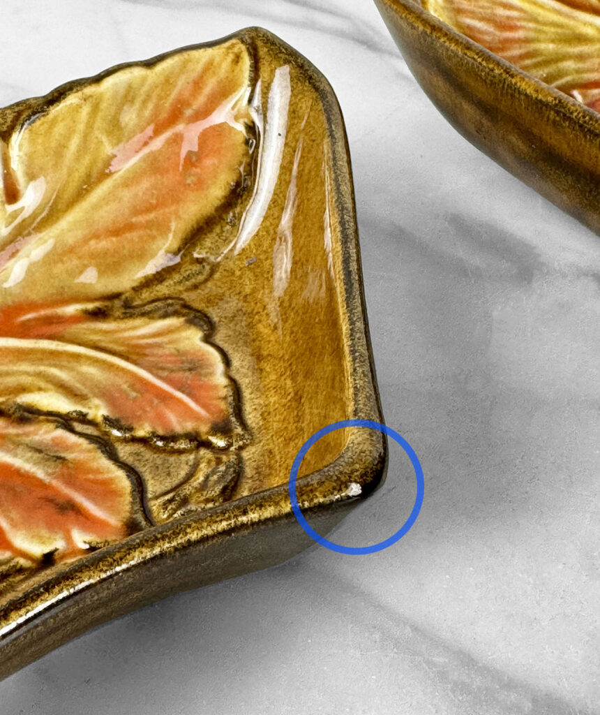 This Centerpiece Serving Set is in overall good condition. A fleabite can be seen along the corner of 1 curved bowls. This area has been circled in our photo gallery to reference. There aren’t any cracks or repairs shown.