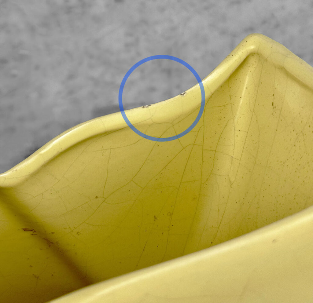This Vase is in overall good condition and looks nice while displayed. A series of fleabites can be seen along the upper rim. We’ve circled these areas in our photo gallery to reference. Crazing to the glaze is shown throughout.