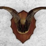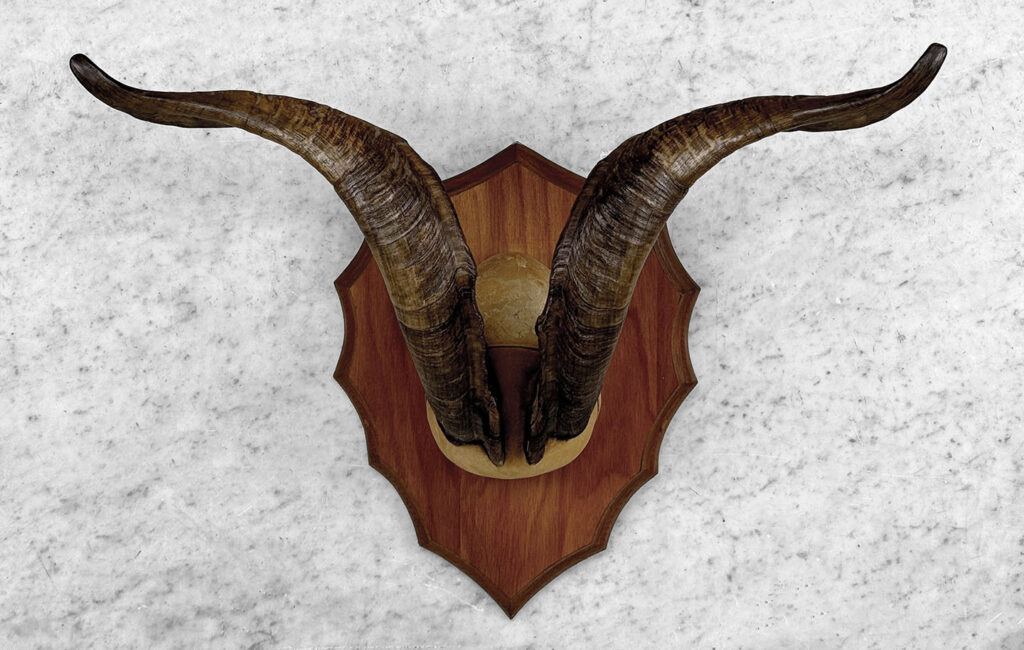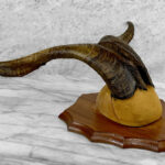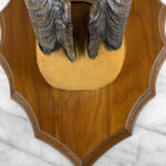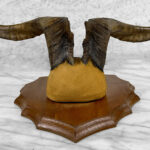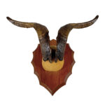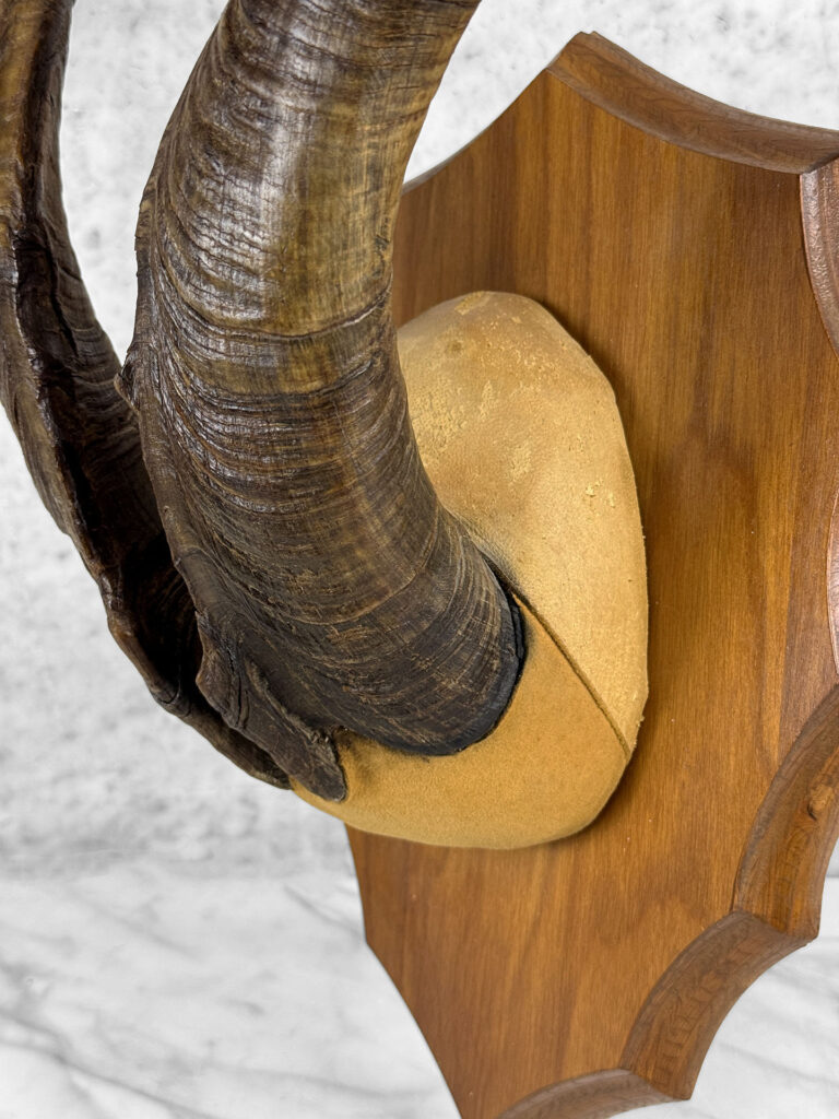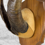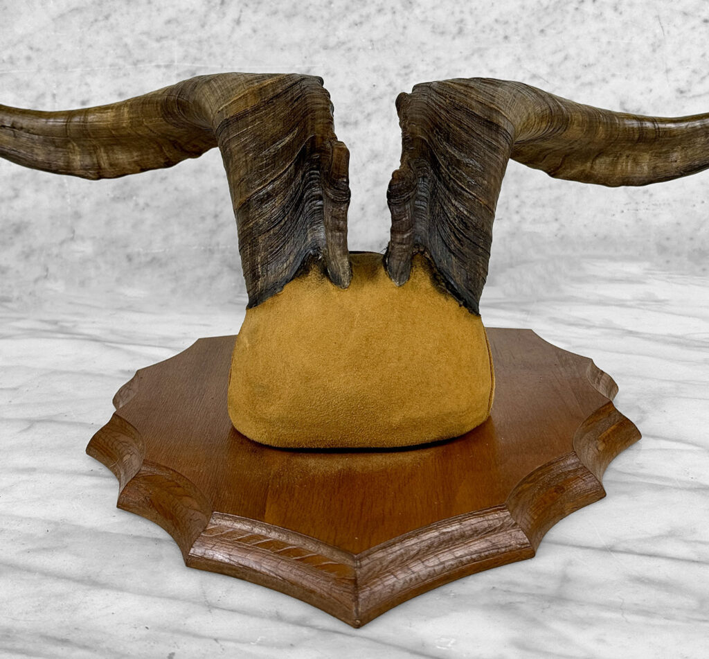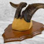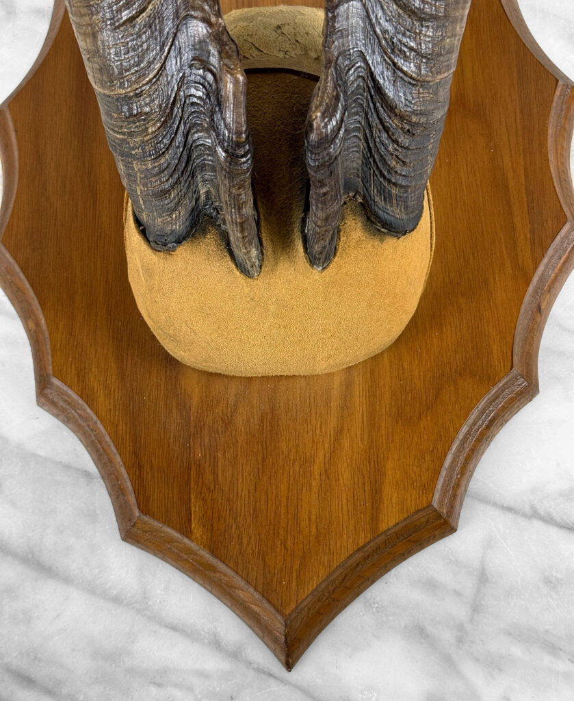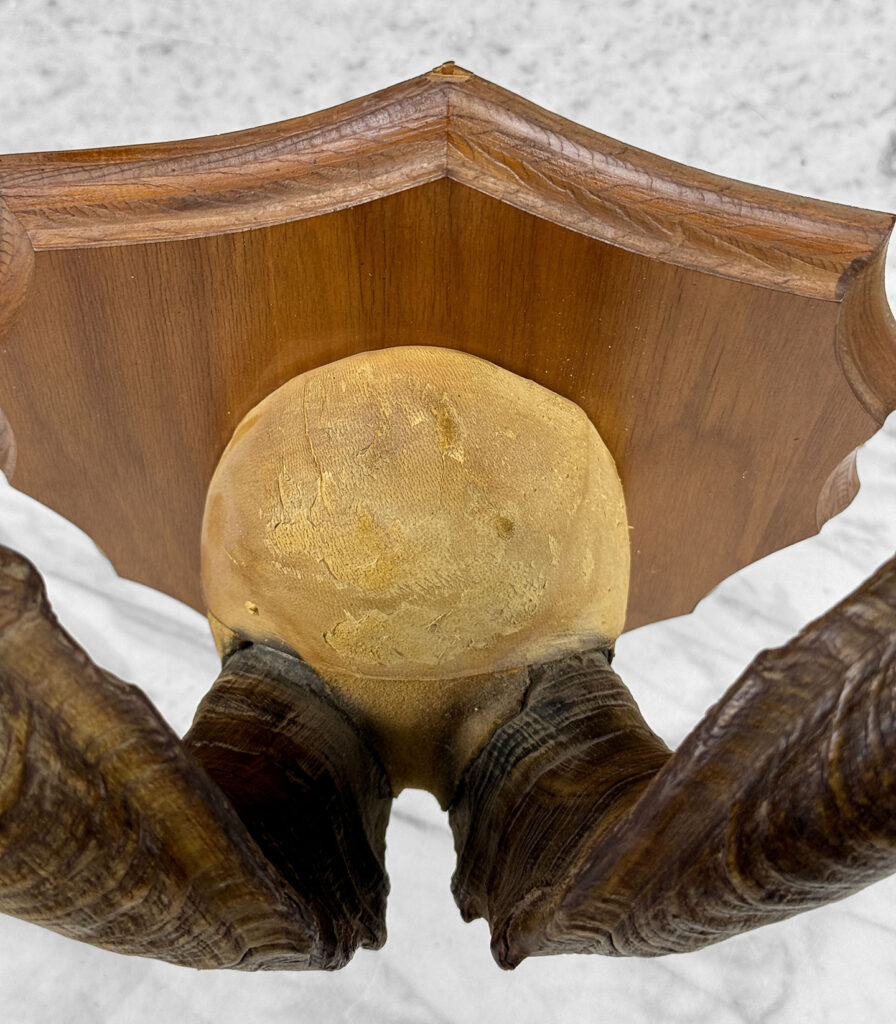 This Catalina Goat Horn Taxidermy Mount was very well done by a master taxidermist. The horns were very well preserved and shows little to no flaws. The leather shows mild worn areas along the top, but no holes or rips. The solid maple plaque offers amazing contrast. A small fleabite along the top of the plaque can be seen. We’ve circled this area in our photo gallery to reference.