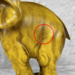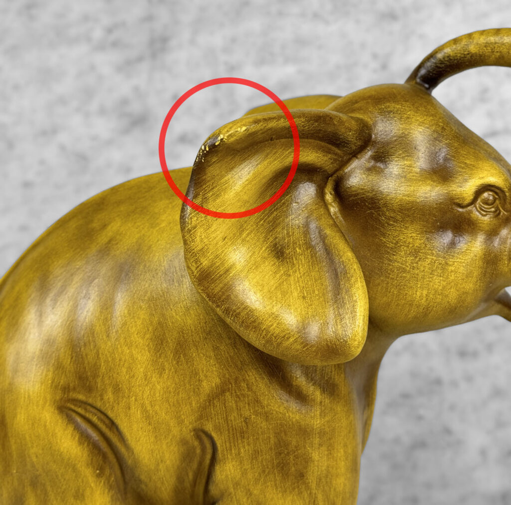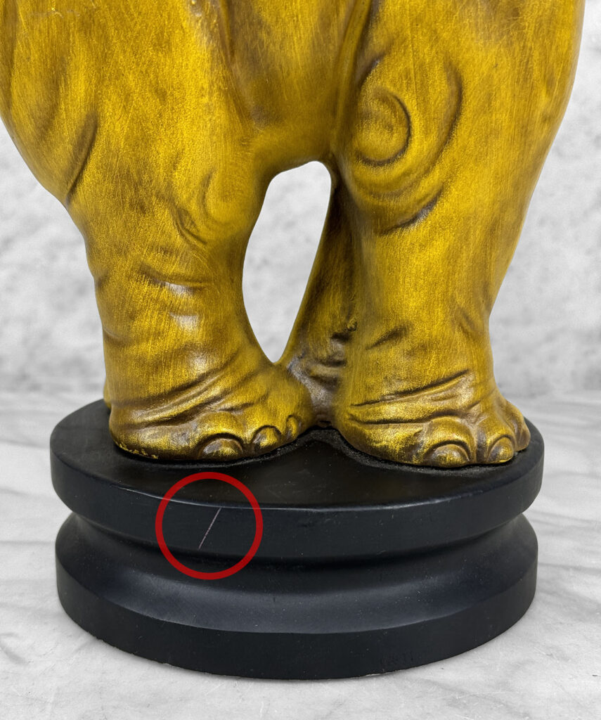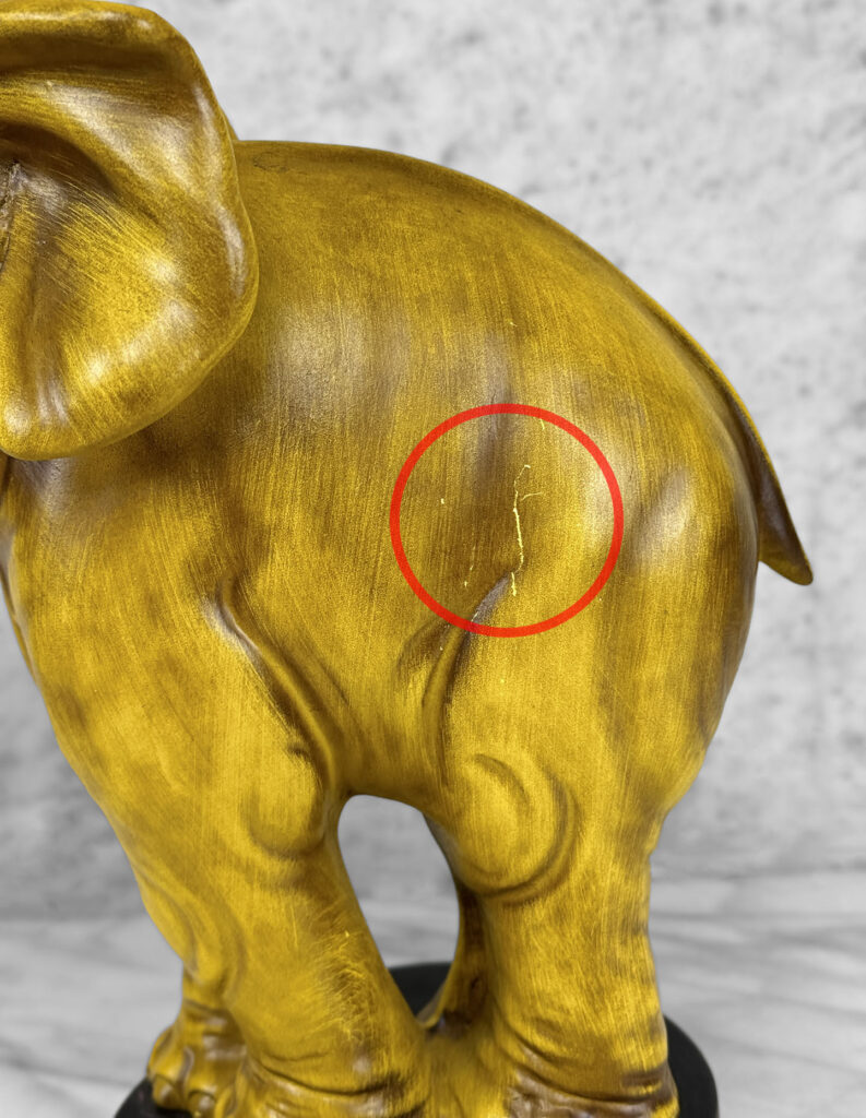 This Elephant Sculpture is in overall good condition without any cracks, chips or repairs shown. A series of surface scratches can be seen, we’ve circled these areas in our photo gallery to reference.