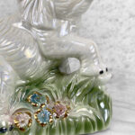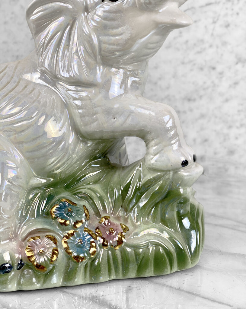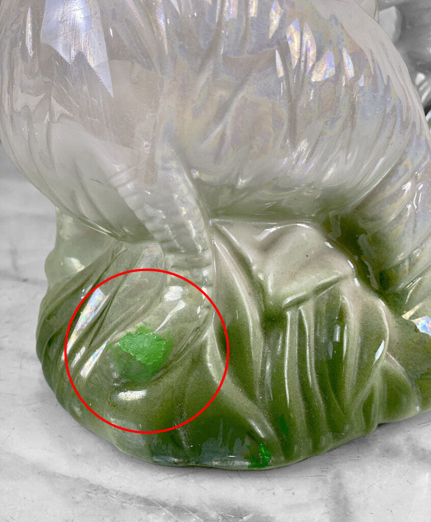 This Chinese Lusterware Porcelain Elephant is in overall good condition without any cracks shown. A chip/touch up is shown along the backside. This area is circled in our photo gallery to reference.