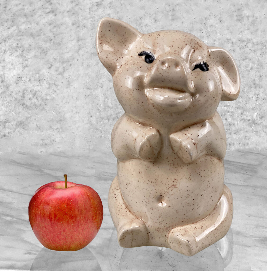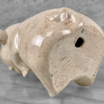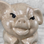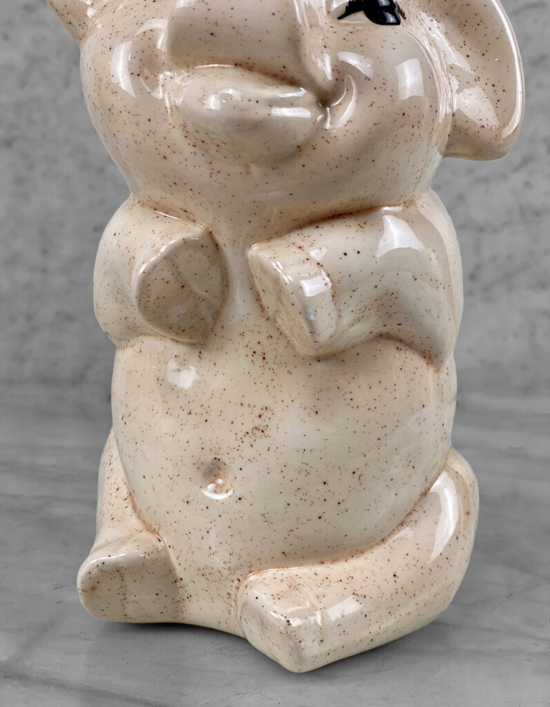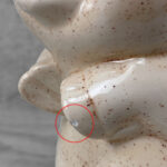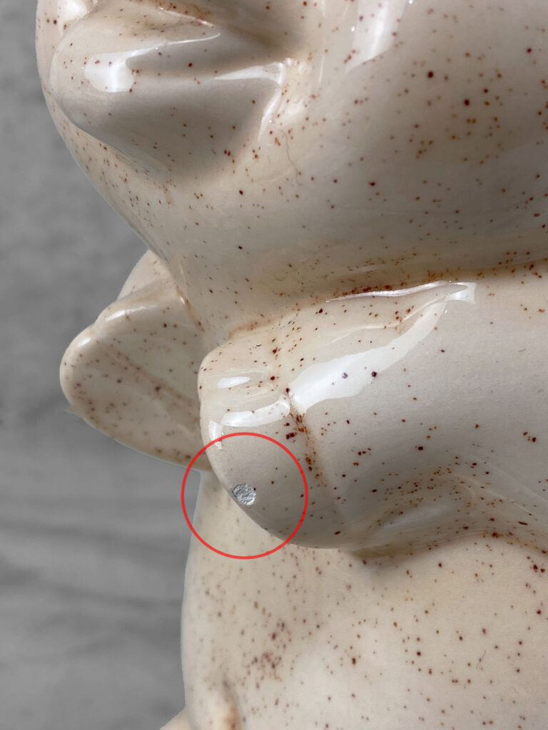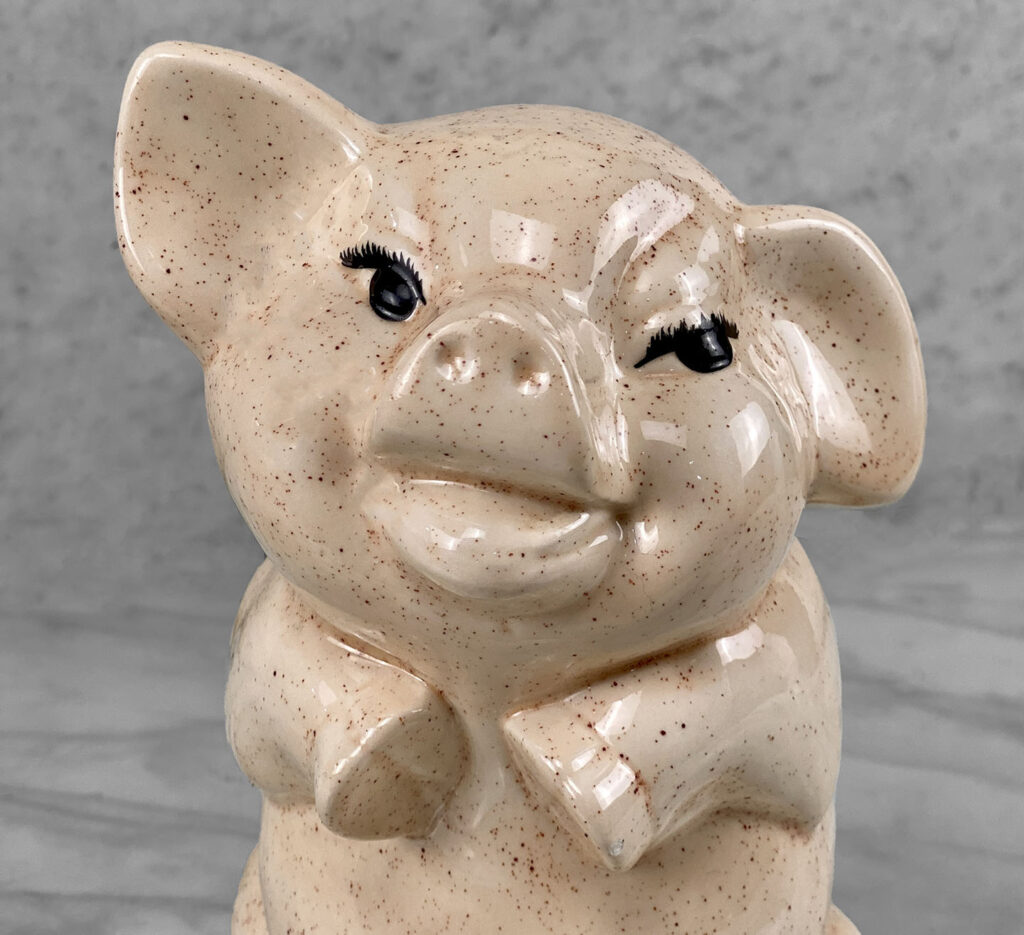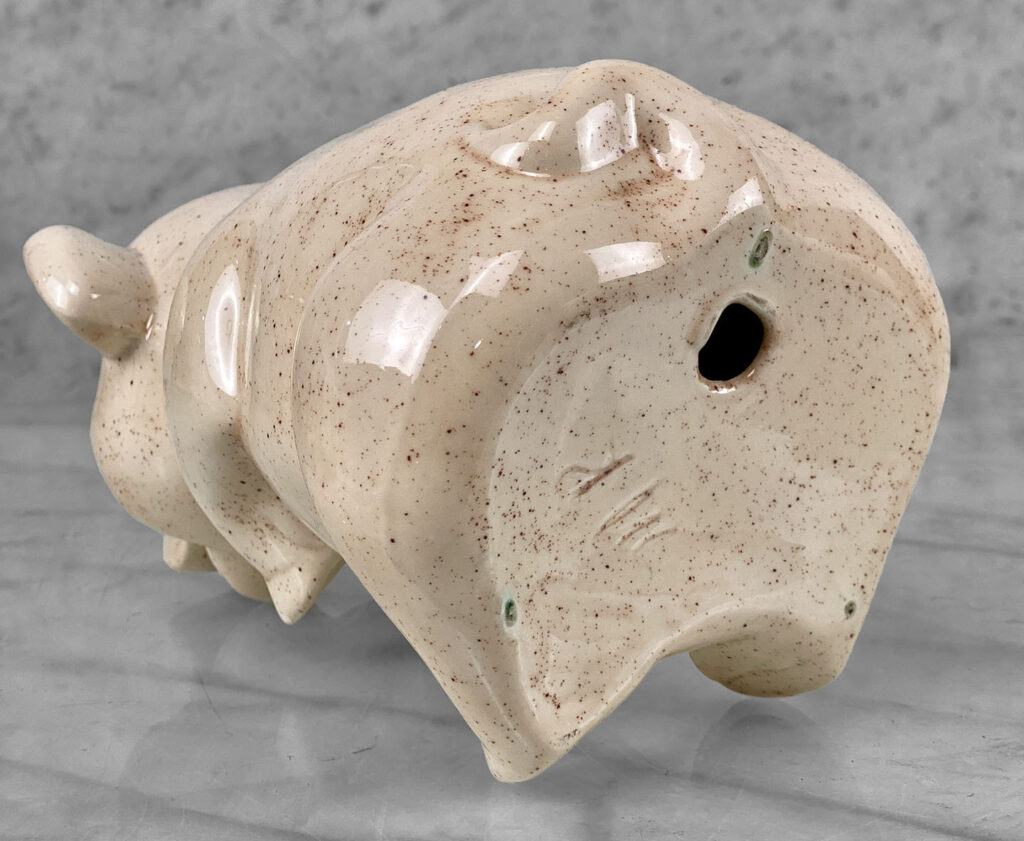 This Vintage Porcelain Pig is in overall good condition without any cracks or repairs. A fleabite is shown along one of the pigs hoofs. We’ve circled this area in our photo gallery to reference.