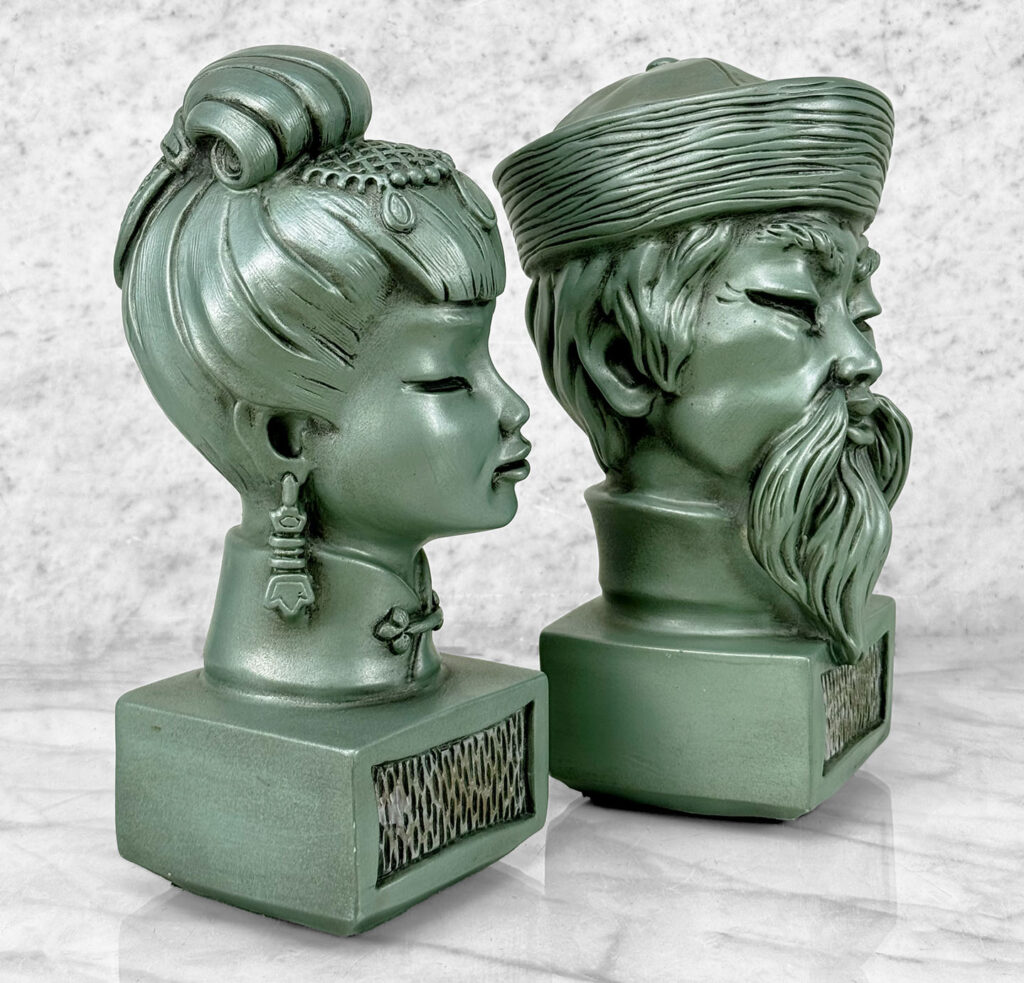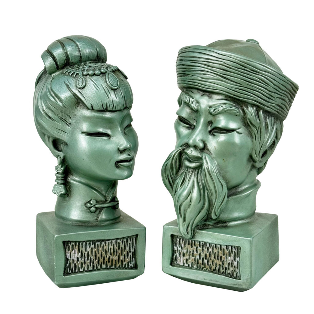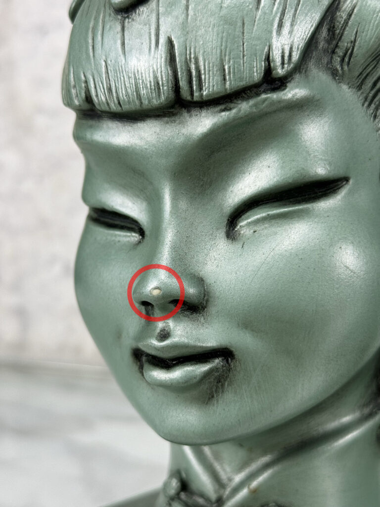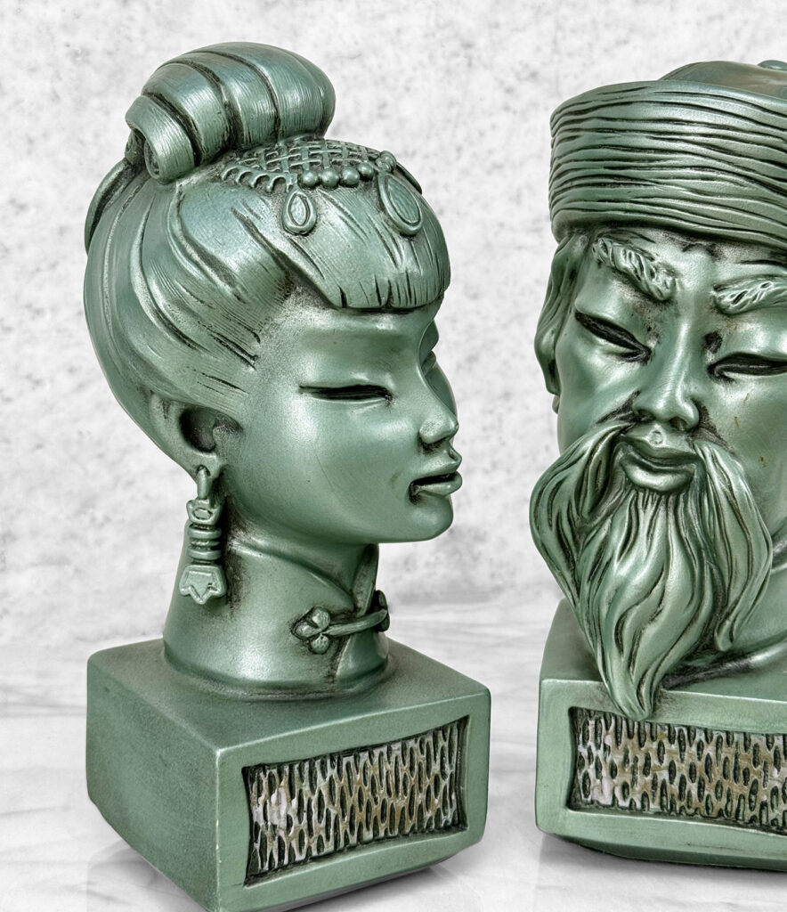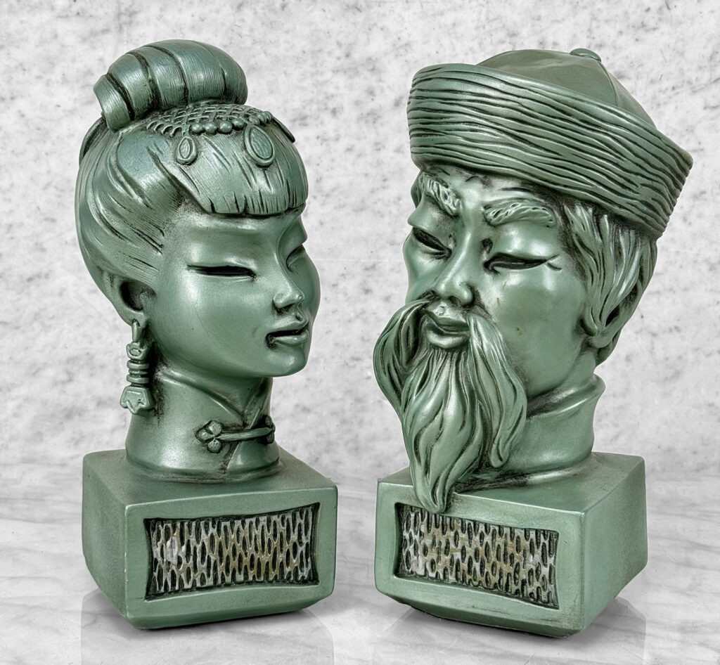 This Pair of Chalkware Asian Bust Sculptures are in overall good condition without any cracks or repairs shown. A flea bite along her nose can be seen. We’ve circled this area in our photo gallery to reference.
