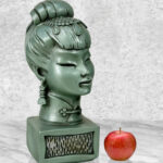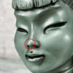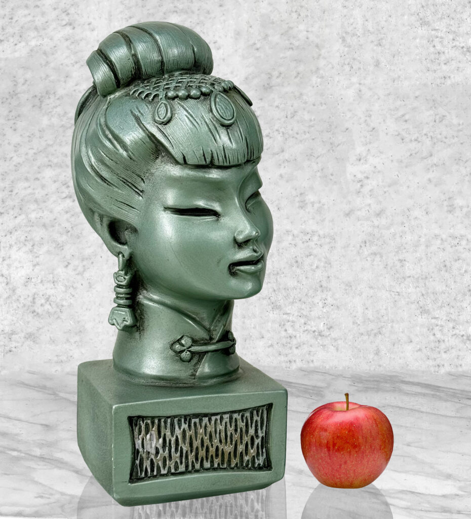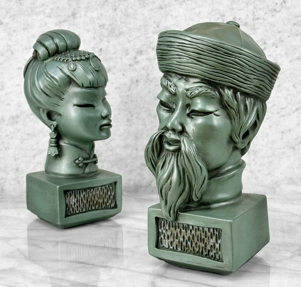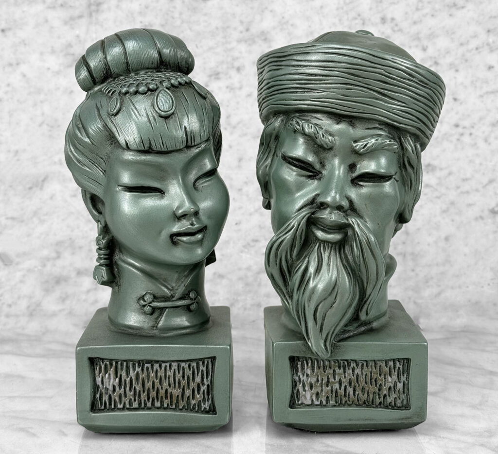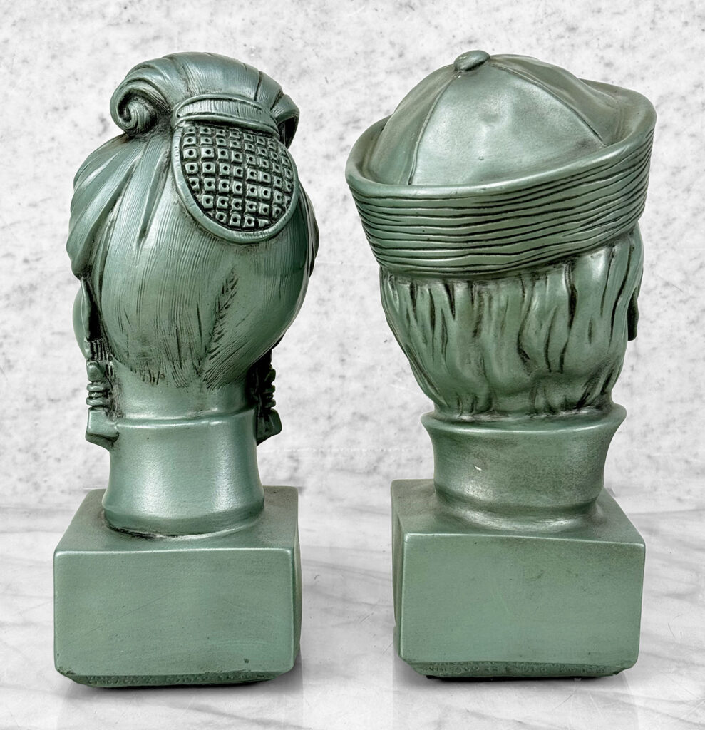 This Pair of Chalkware Asian Bust Sculptures are in overall good condition without any cracks or repairs shown. A flea bite along her nose can be seen. We’ve circled this area in our photo gallery to reference.