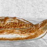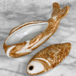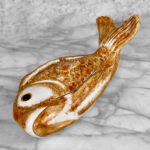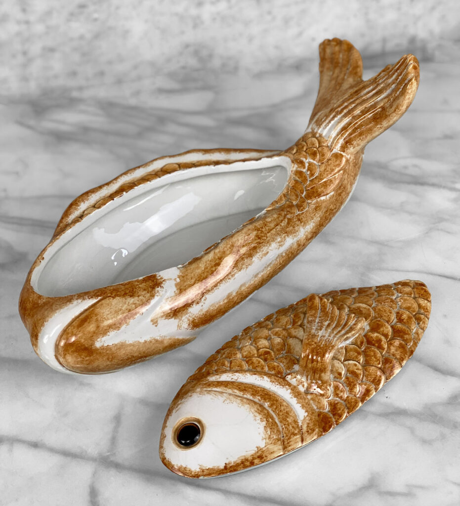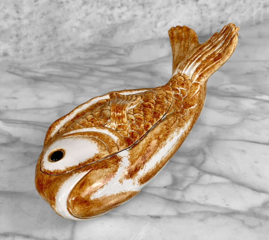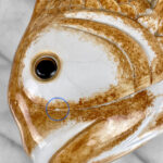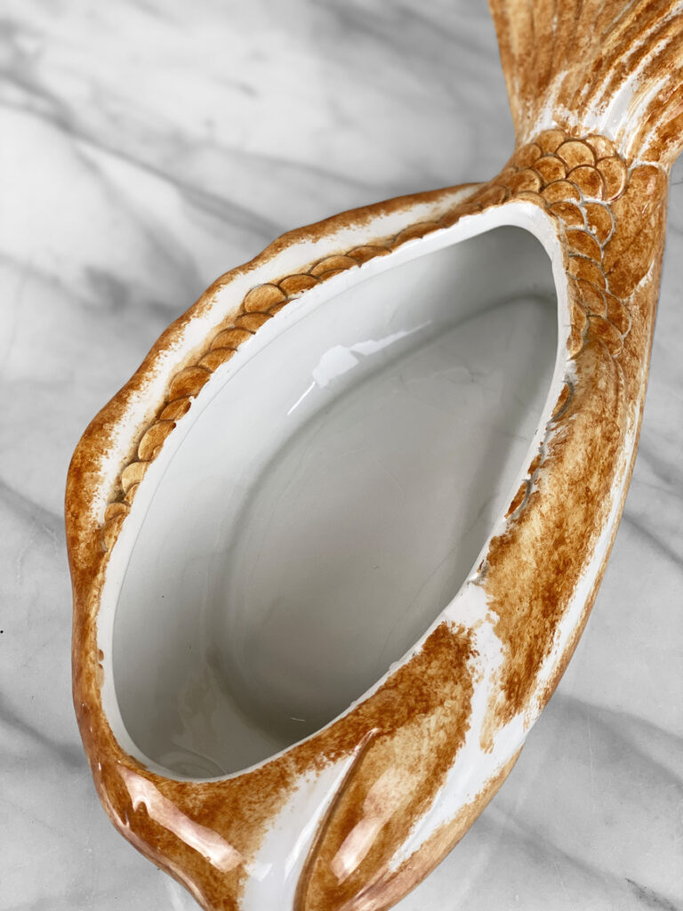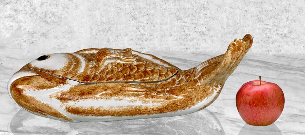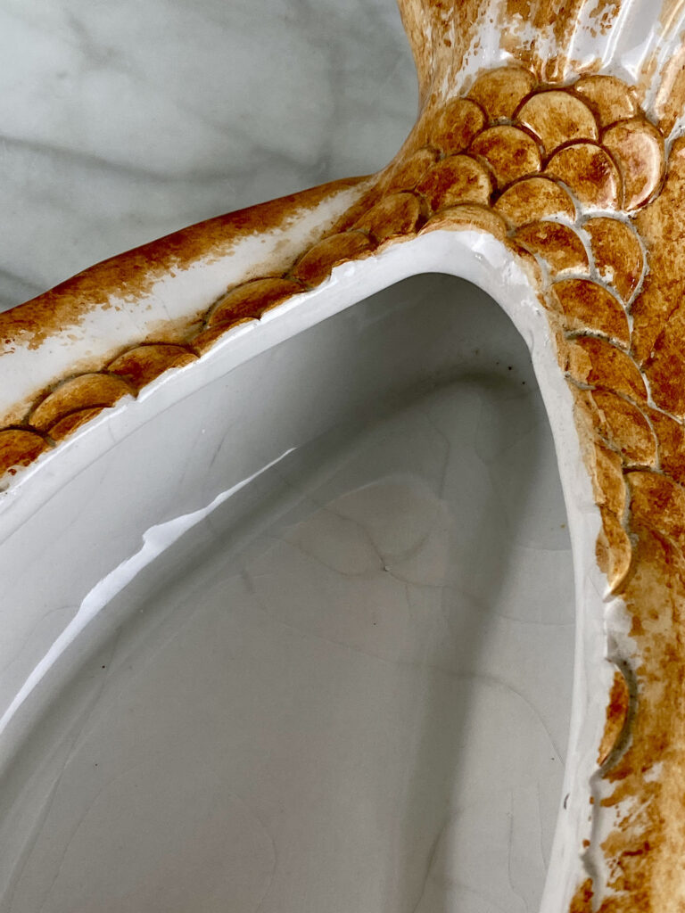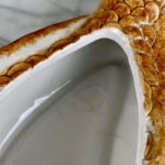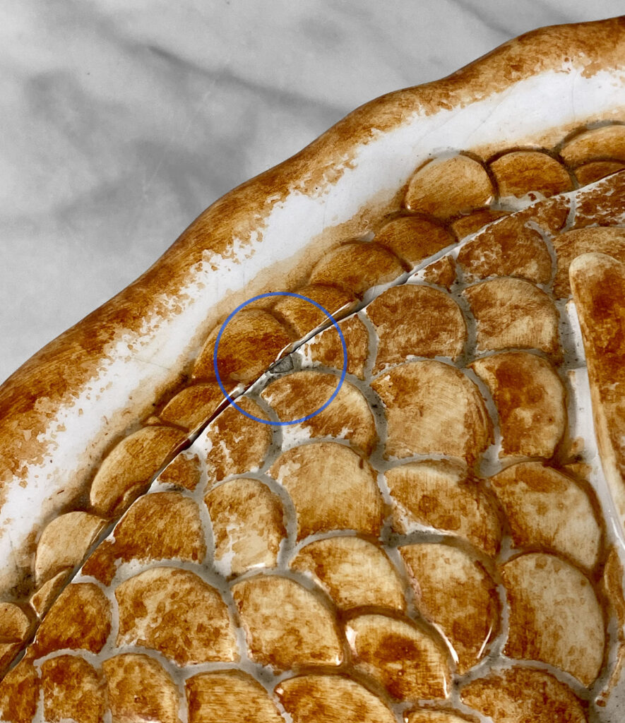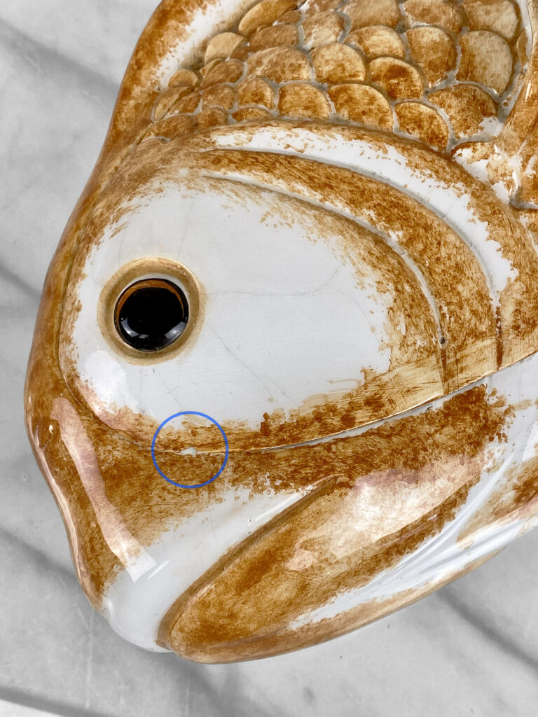This Porcelain Fish Tureen Bowl is in overall good condition. Mild crazing to the glazed finish is shown in select areas. 2 Flea bites can be felt along the upper rim. We’ve circled these areas in our photo gallery to reference.