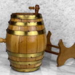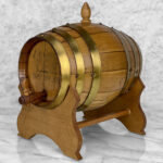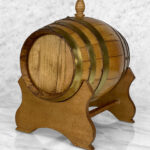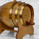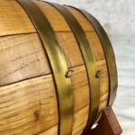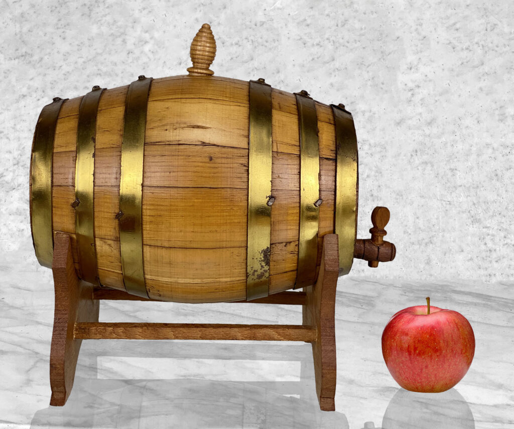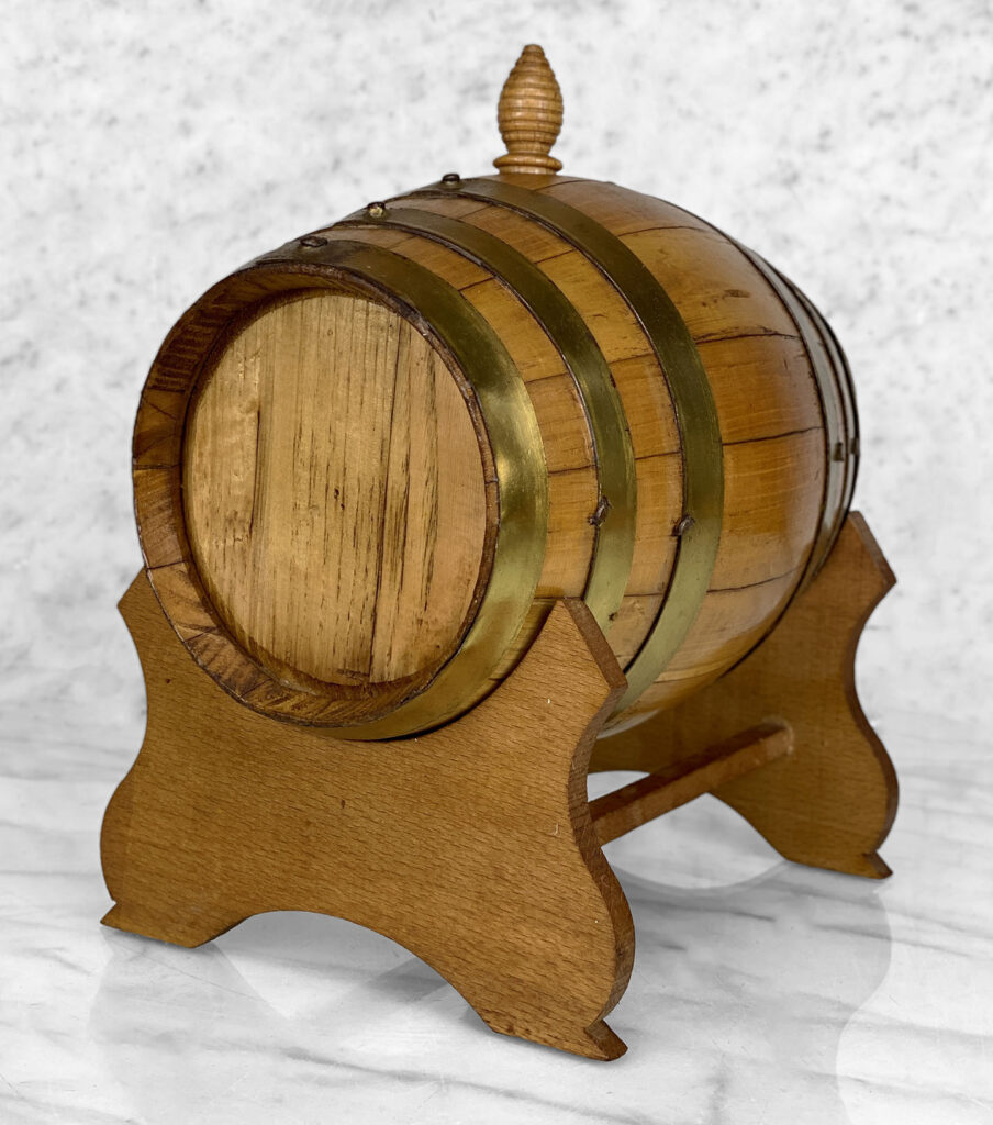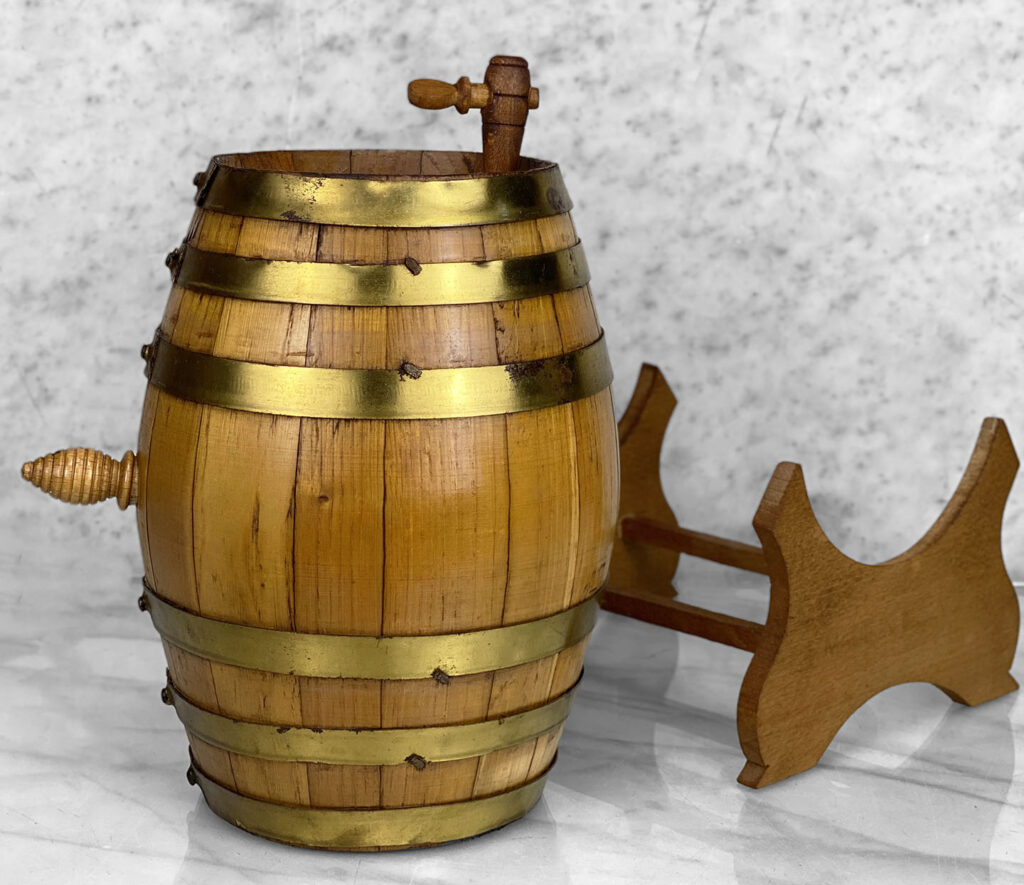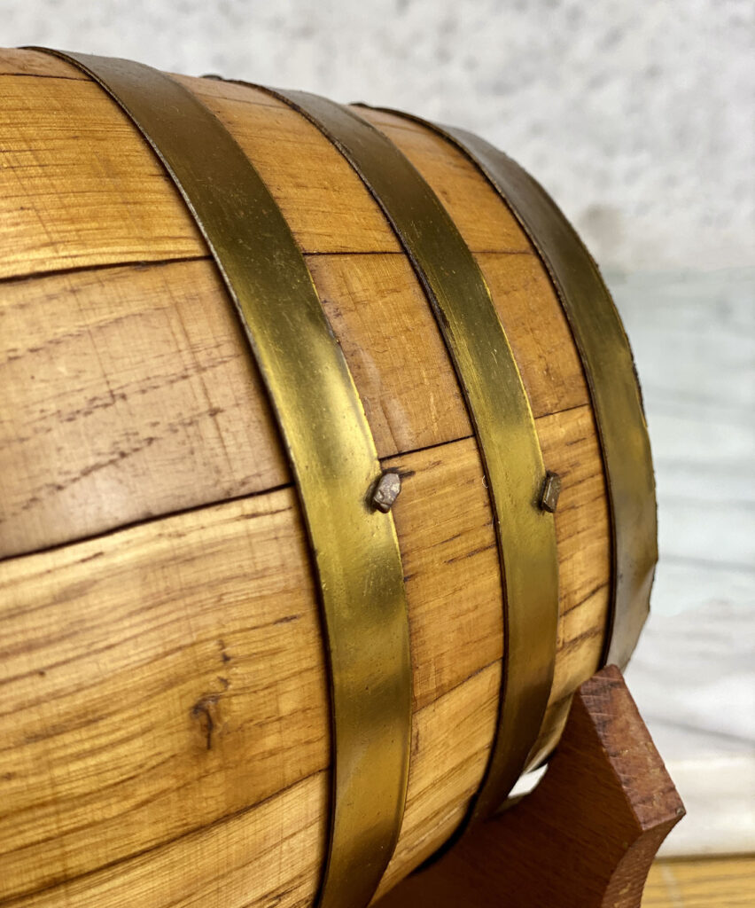 This Table Top Wine Cask is in overall good condition. The piece is fully functional and makes a great display piece. Tarnishing and patina can be seen along the brass strapping from age.