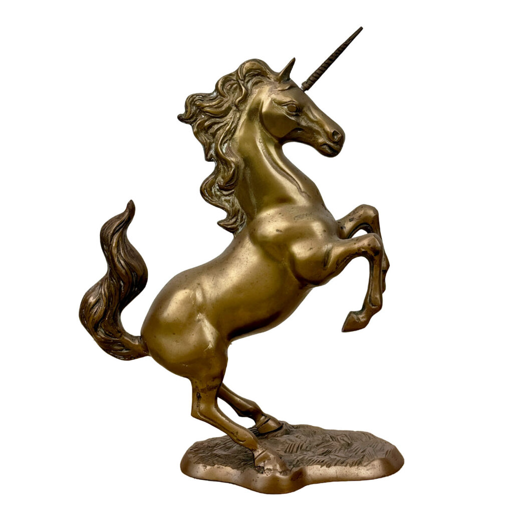 Vintage 2ft Hollywood Regency Brass Rearing Unicorn Sculpture, c.1970’s
