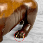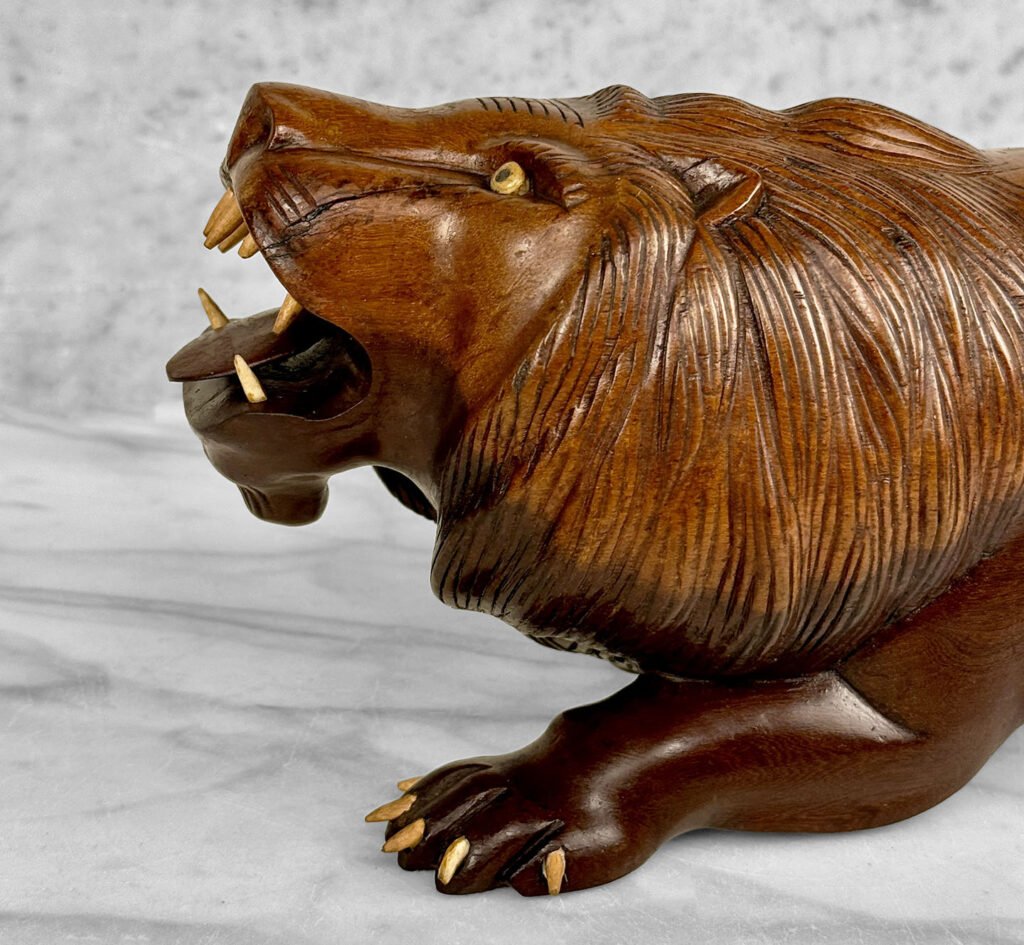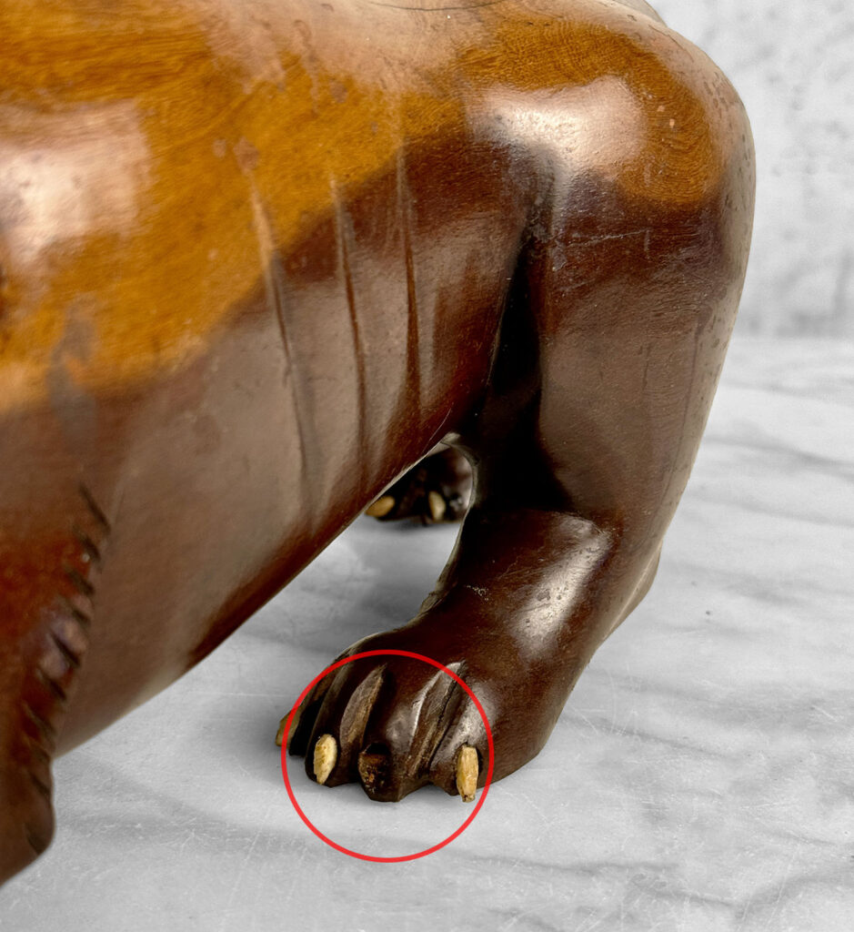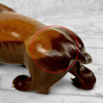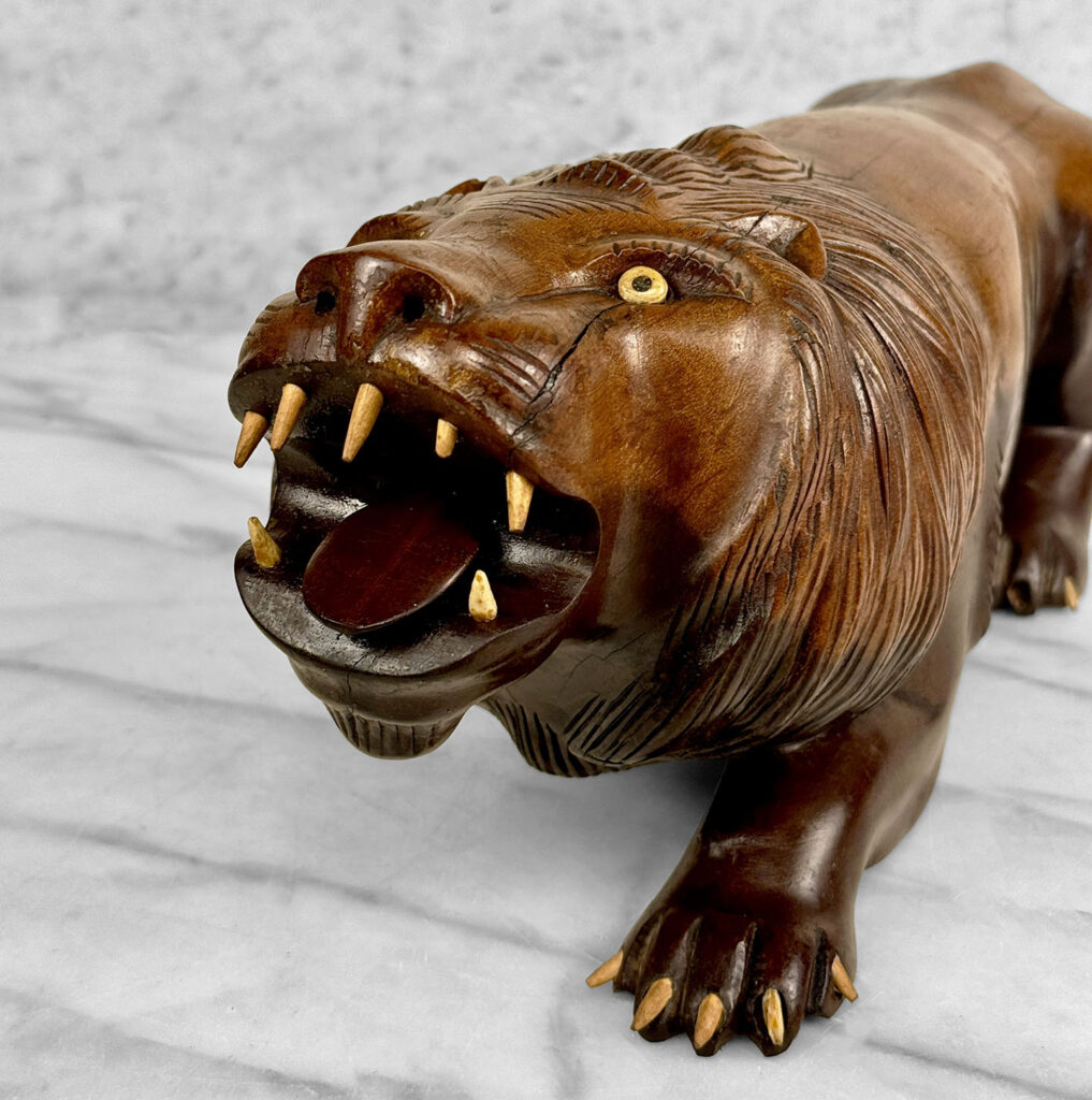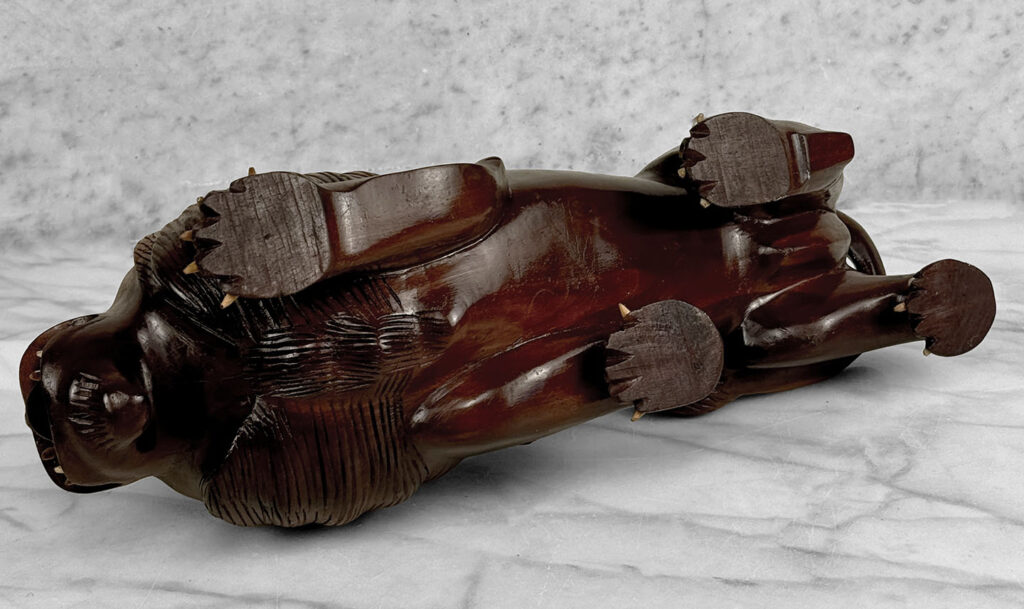This Large Wood Lion Sculpture is in overall good condition without any repairs shown. Mild blemishes to the mahogany could be seen from age, most notable along the backside of the cat. Some of the Lions nails are missing, all of the teeth are present and fully intact. These areas have been circled in our photo gallery to reference.