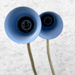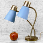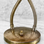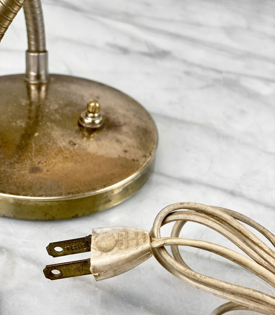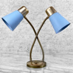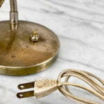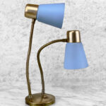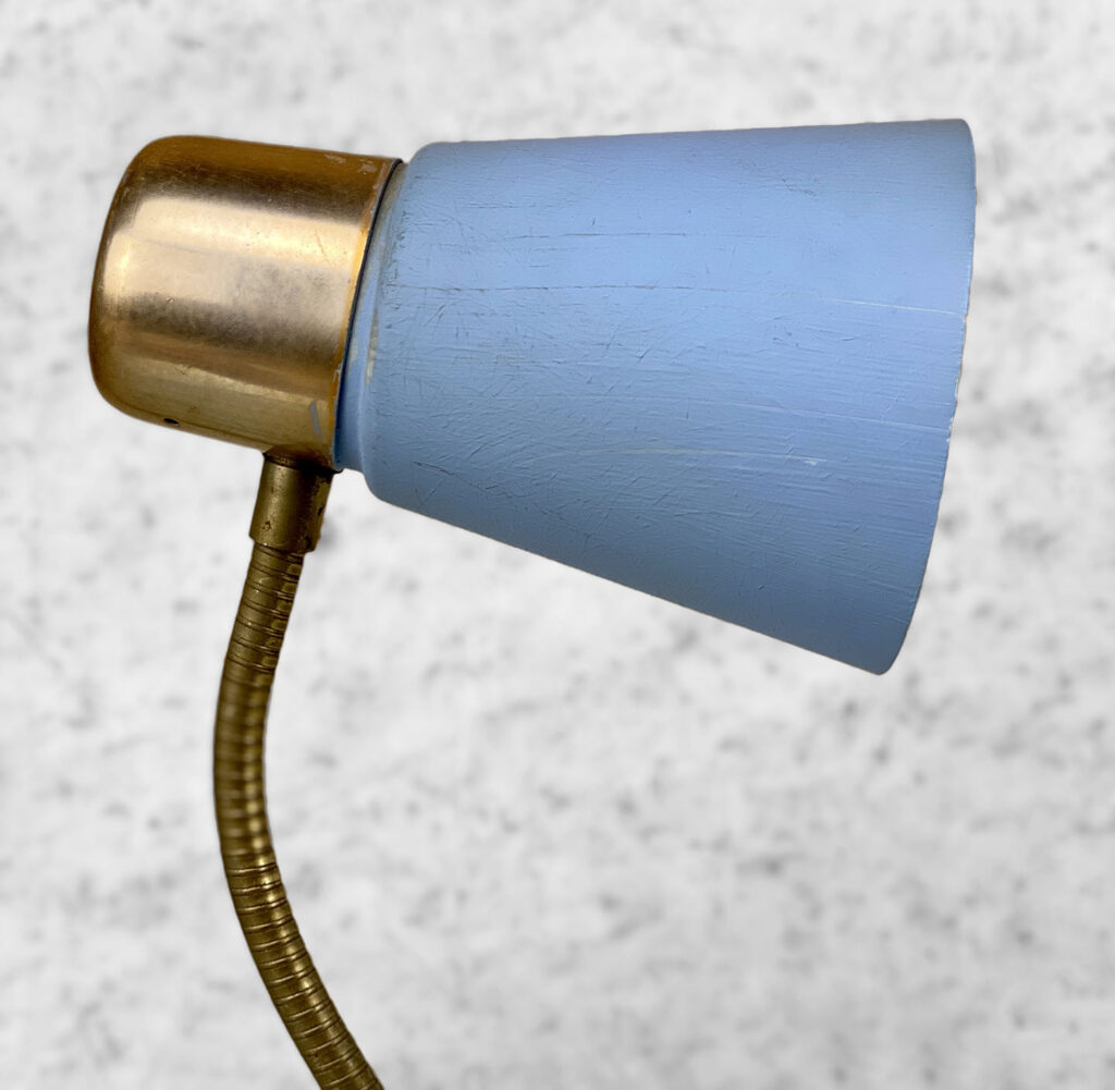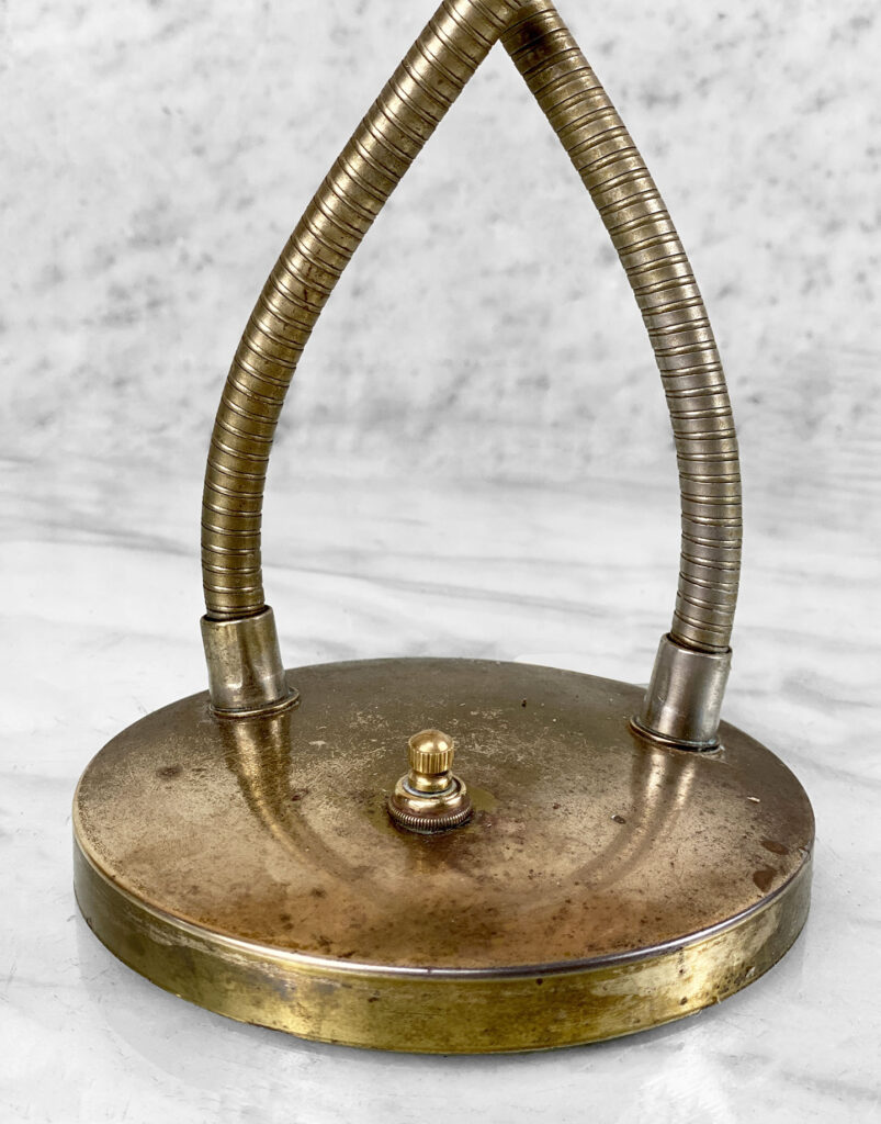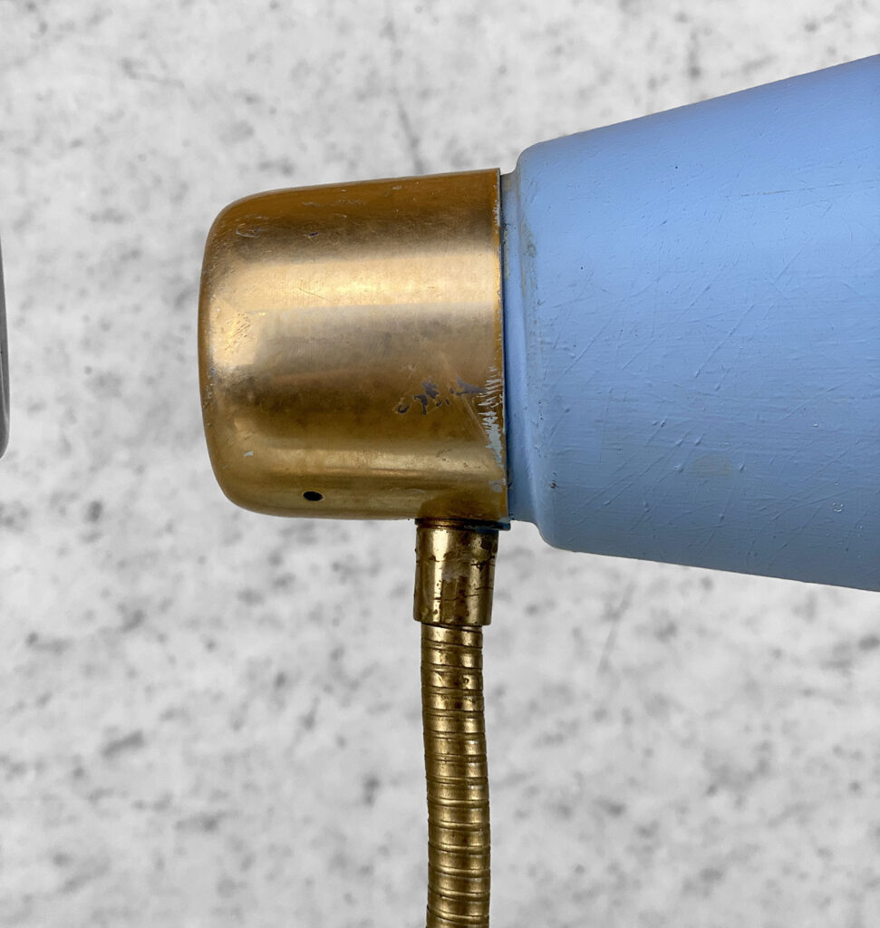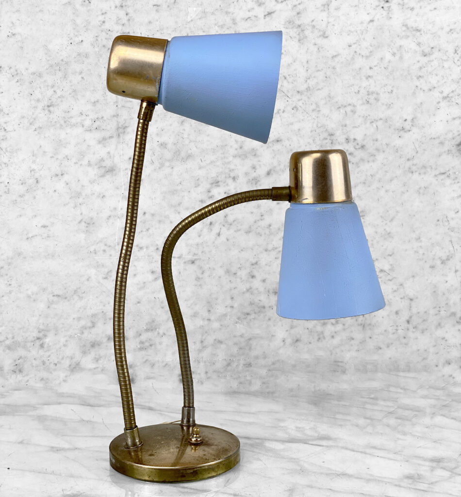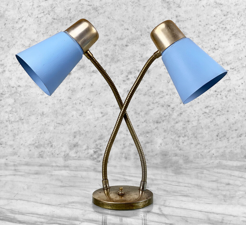 This Mid-Century Double Gooseneck Desk Lamp is fully tested and works as it should. The Lamp does not require rewiring. The wiring shows discoloration from age. Mild surface scratches can be seen along the shades, they’re free of any cracks or repairs. The brass base shows tarnishing and blemishes.