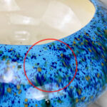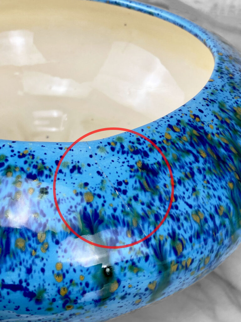 This Art Pottery Jardiniere is free of any chips. A hairline is shown along the upper side of the jardiniere. This area does not appear to have any movement and would not leak water. This area is circled in our photo gallery to reference.