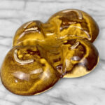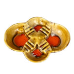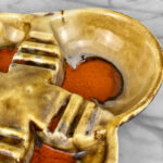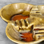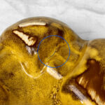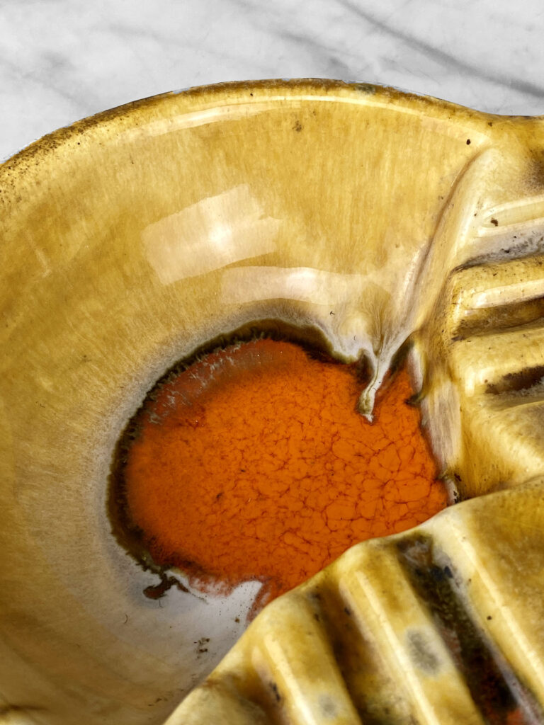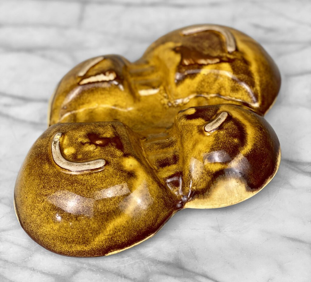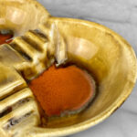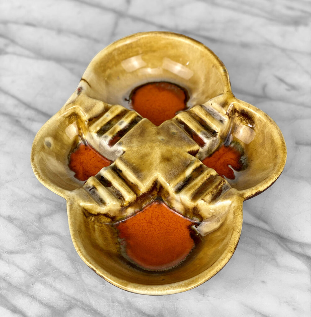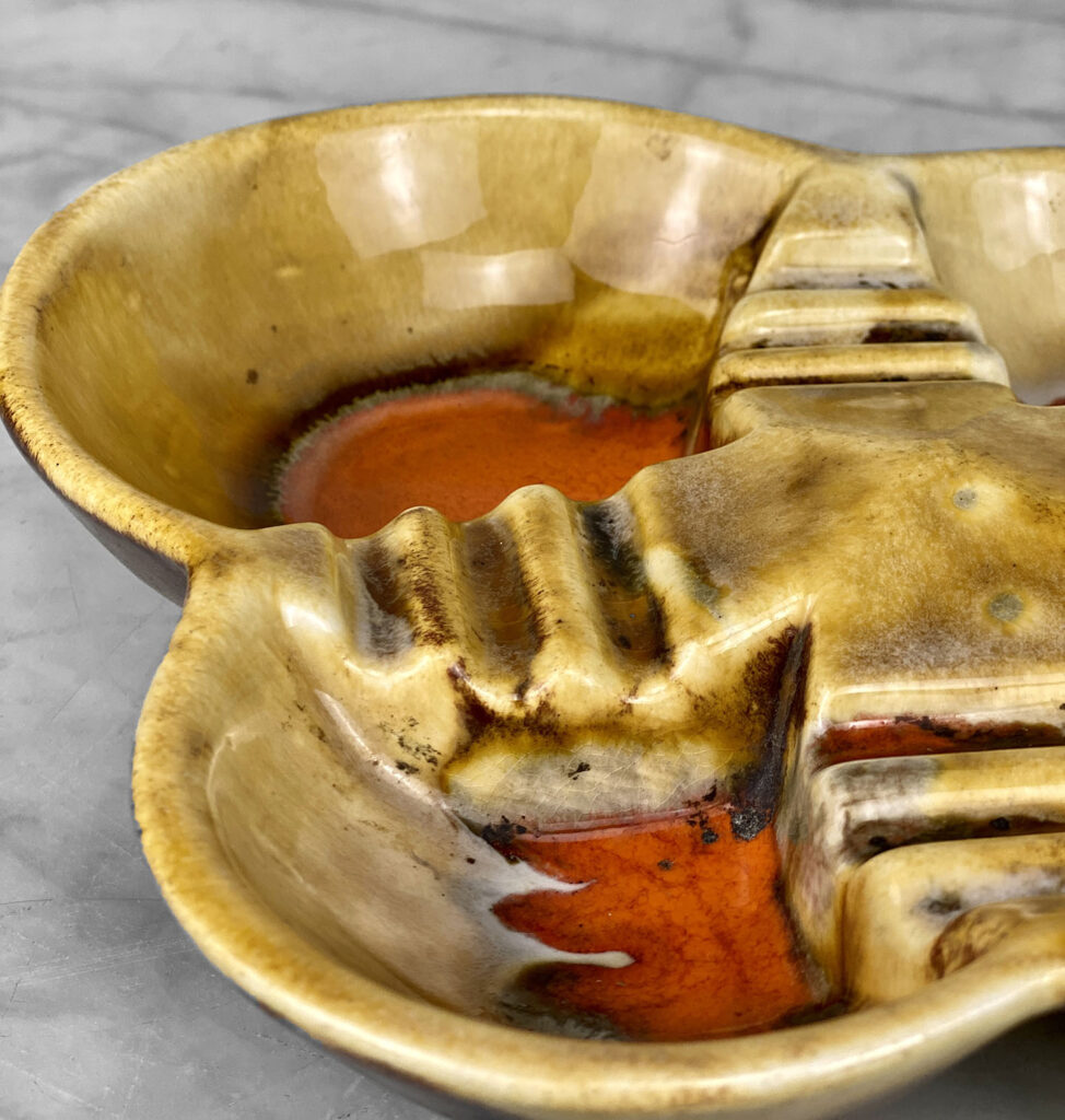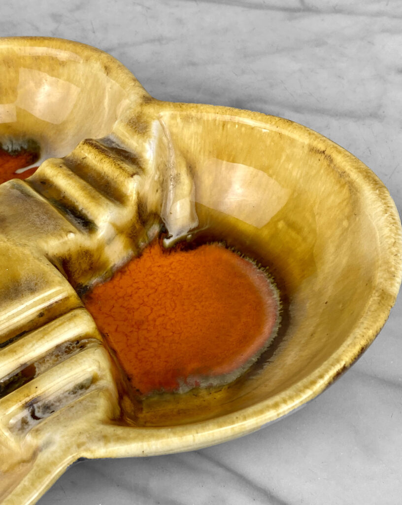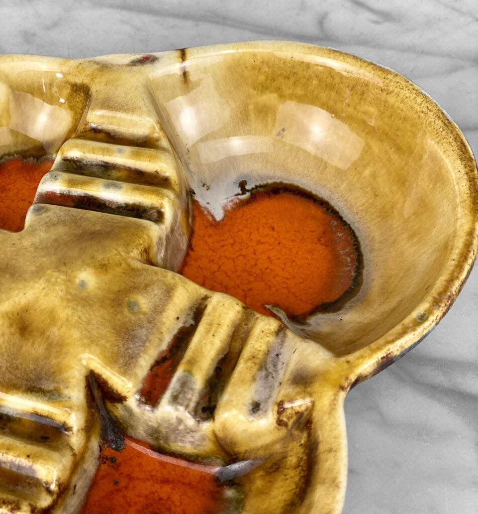 This Atomic Porcelain Ashtray is in overall good condition. A crack is shown along the bottom of the ashtray – This area appears to be an imperfection during the Pottery Sculpting process. This area does not show any movement and does not translate to the upper side, this is circled in our photo gallery to reference.