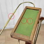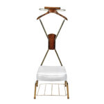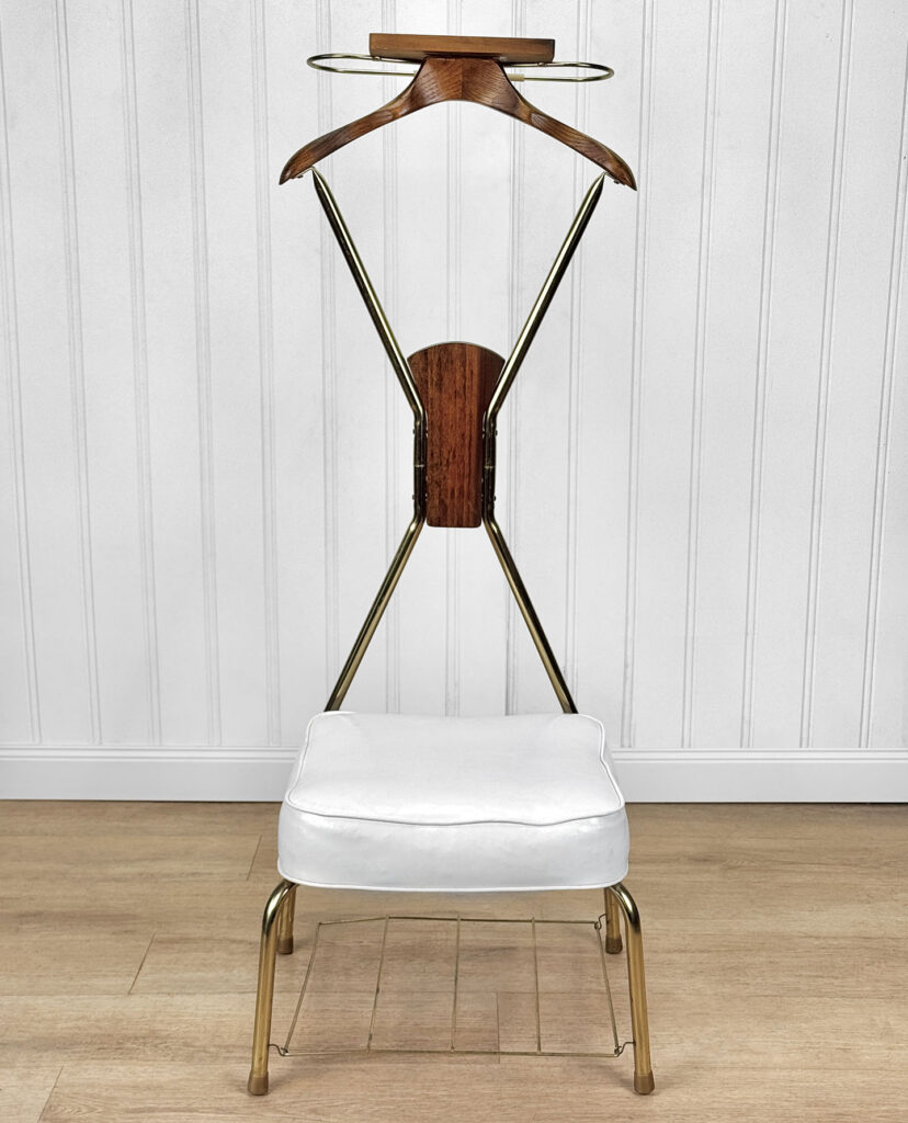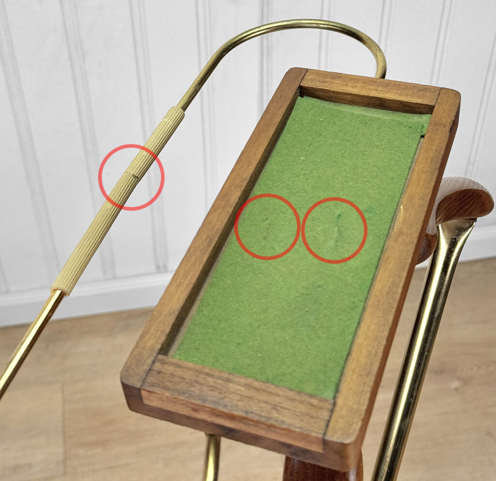 This Valet was very well made, it’s solid, sturdy and makes a great looking functioning piece. The white vinyl is free of any roles or rips, although you will notice its misshaped from previous use. The magazine rack bottom is optional to use, one of the hooks which holds the rack to the legs are missing. The top accessory hanger along the top of the valet shows a break along the backside. We’ve circled this area in our photo gallery to reference.