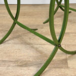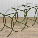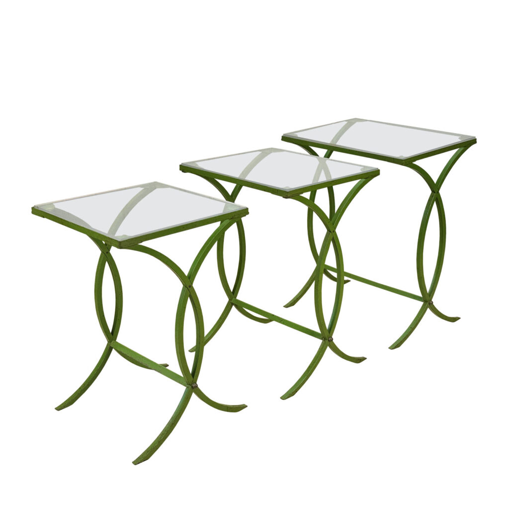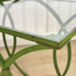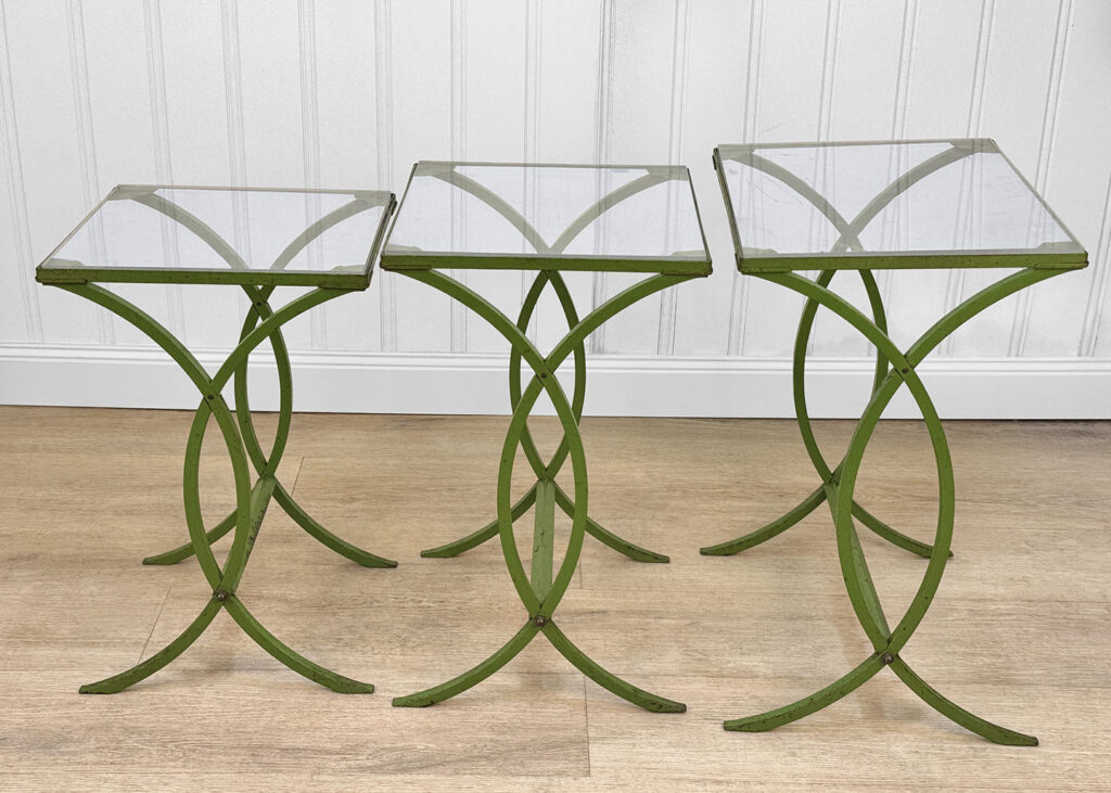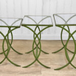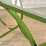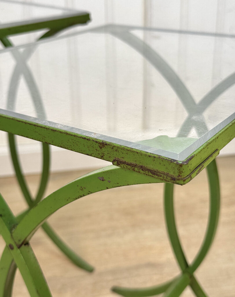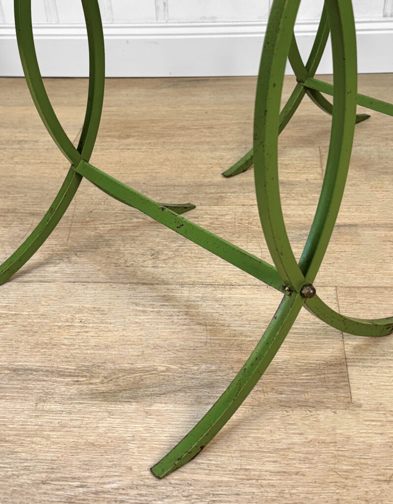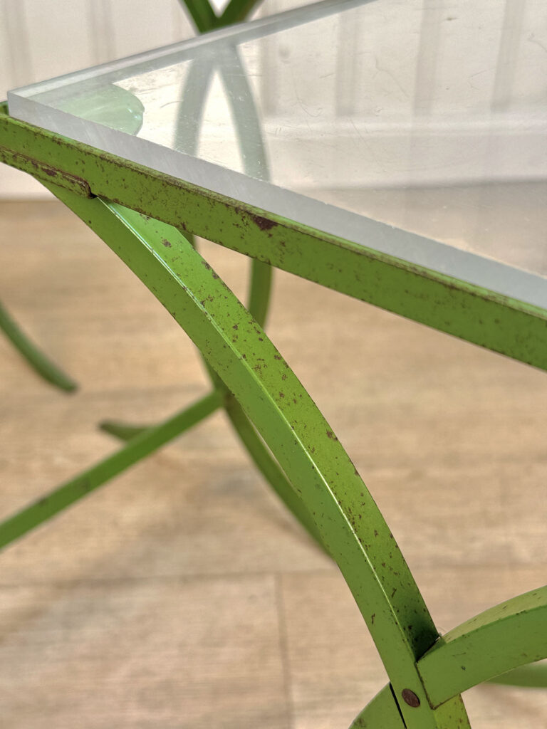 Each Table stands as it should, there aren’t any repairs shown. Surface scratches along the lucite tops can be seen from age and previous use. A small flake along one tops edge is circled in our photo gallery to reference. Light surface rust to the green finish can be seen from being used outdoors. There isn’t any pitting shown!