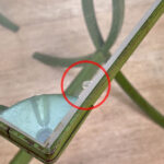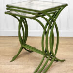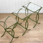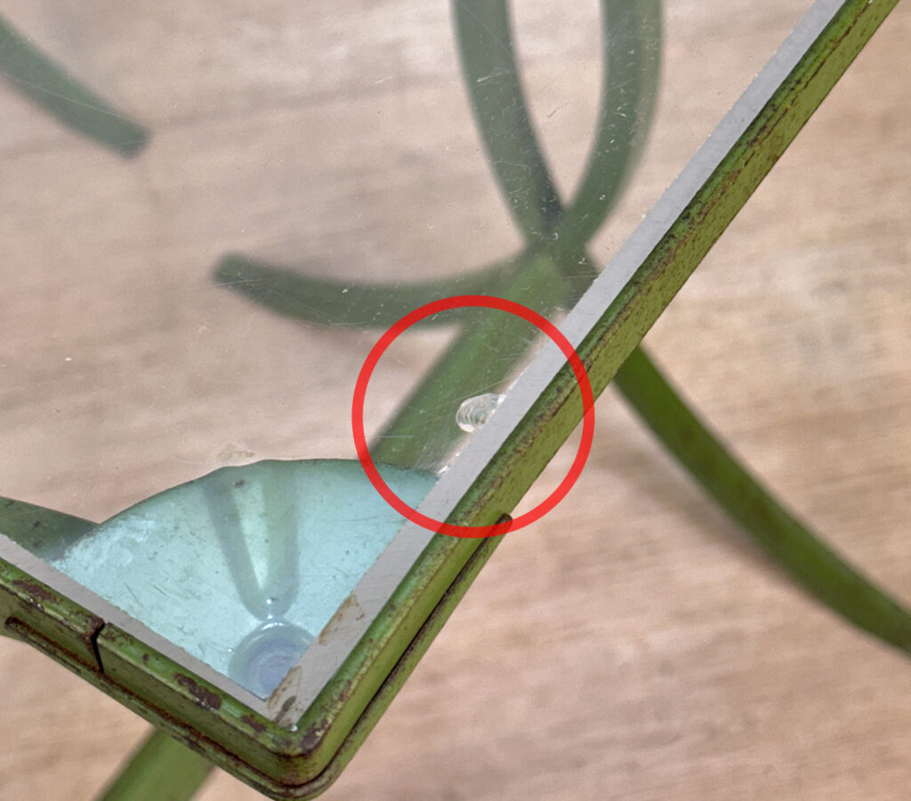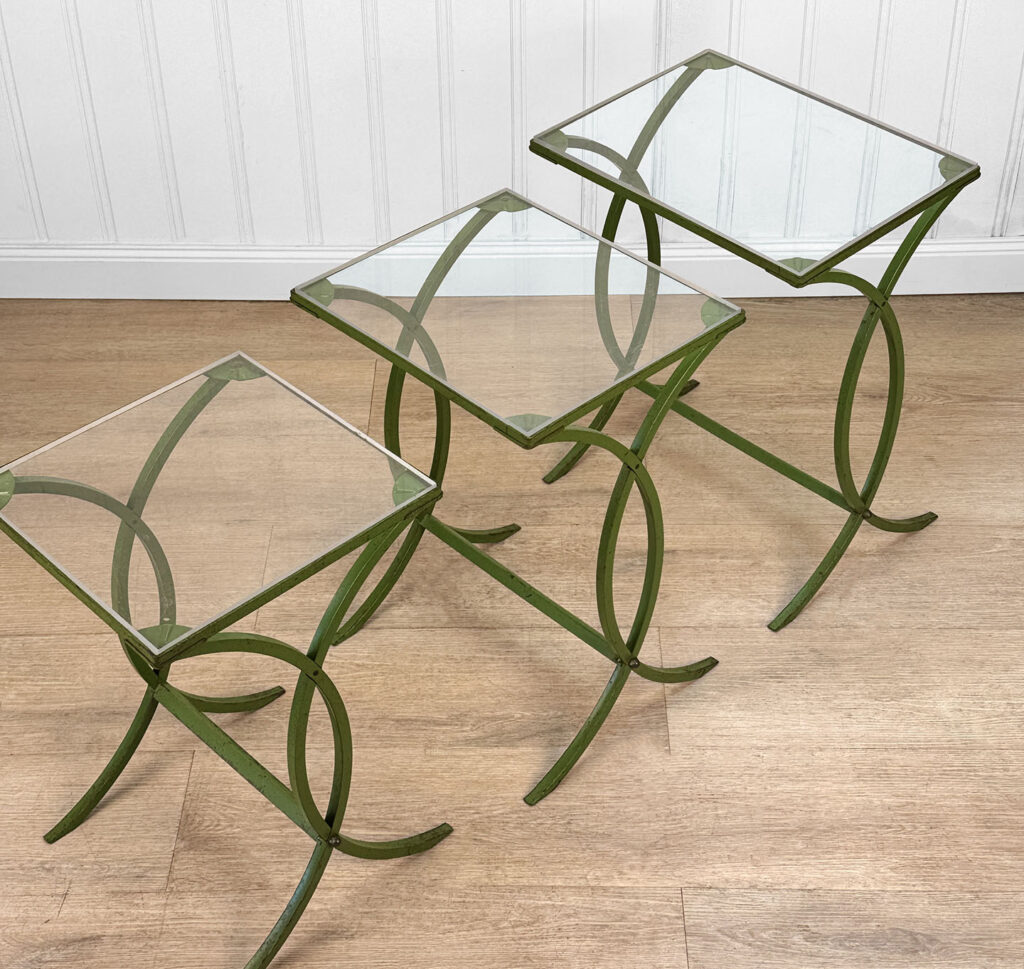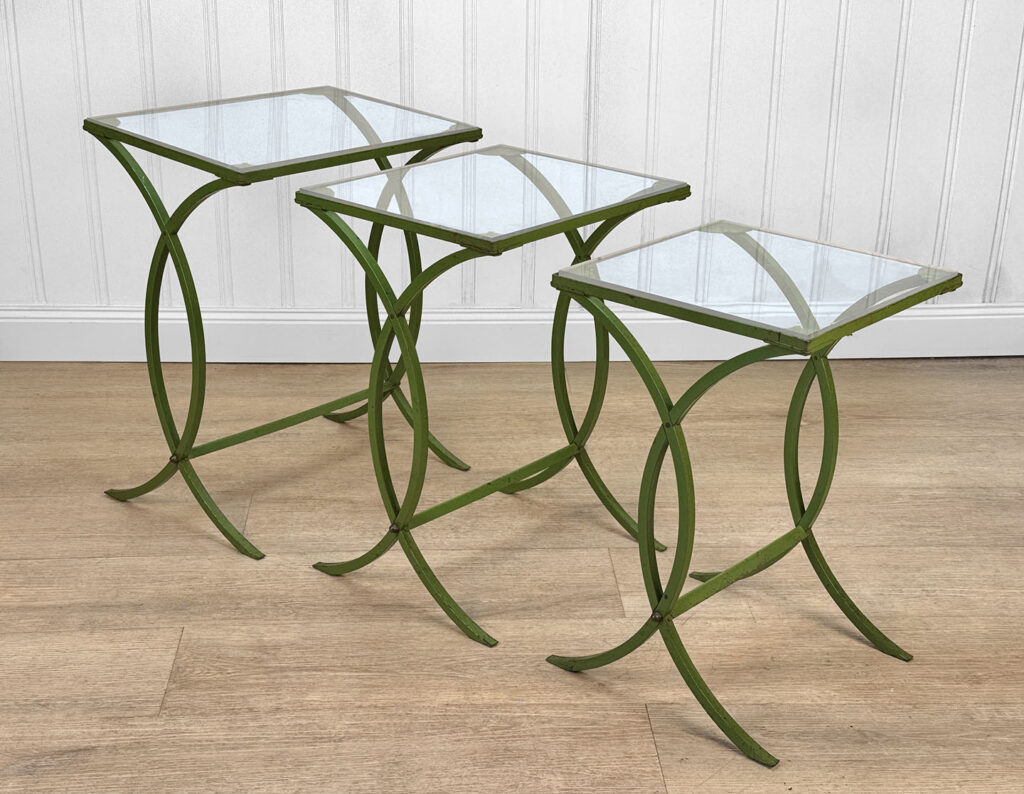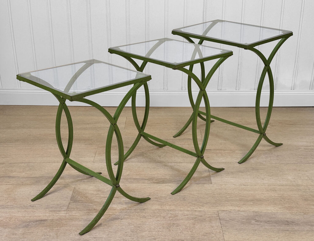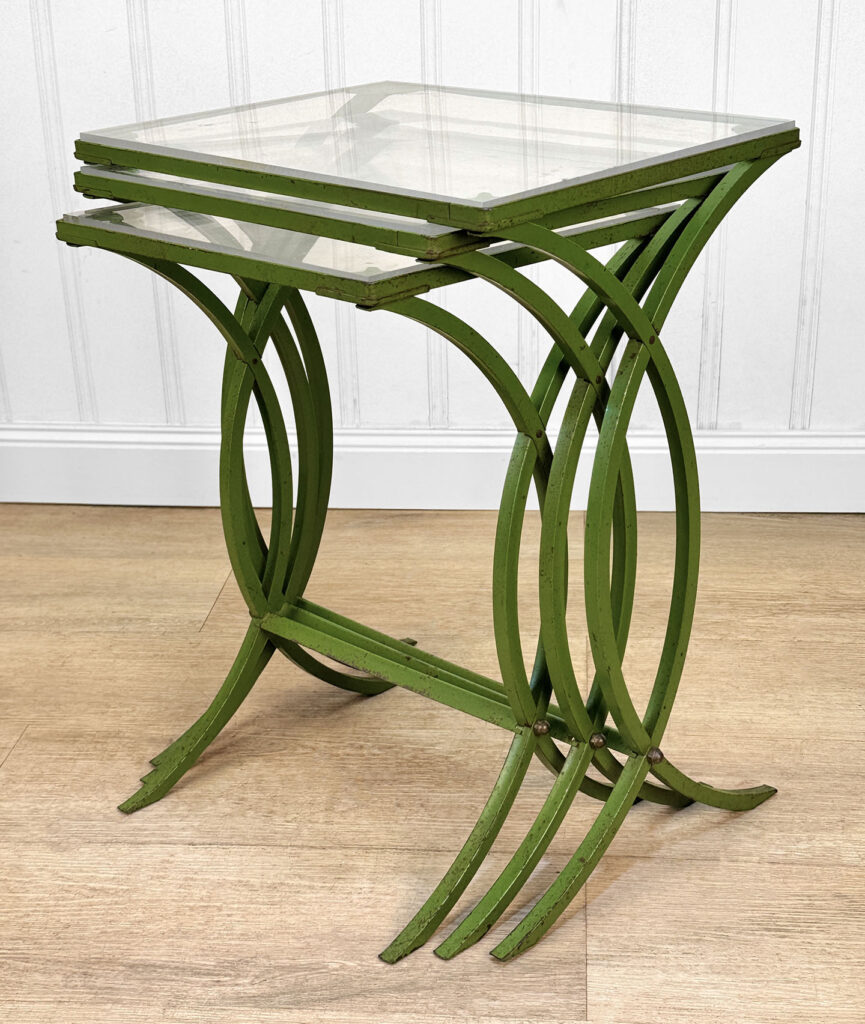 Each Table stands as it should, there aren’t any repairs shown. Surface scratches along the lucite tops can be seen from age and previous use. A small flake along one tops edge is circled in our photo gallery to reference. Light surface rust to the green finish can be seen from being used outdoors. There isn’t any pitting shown!
