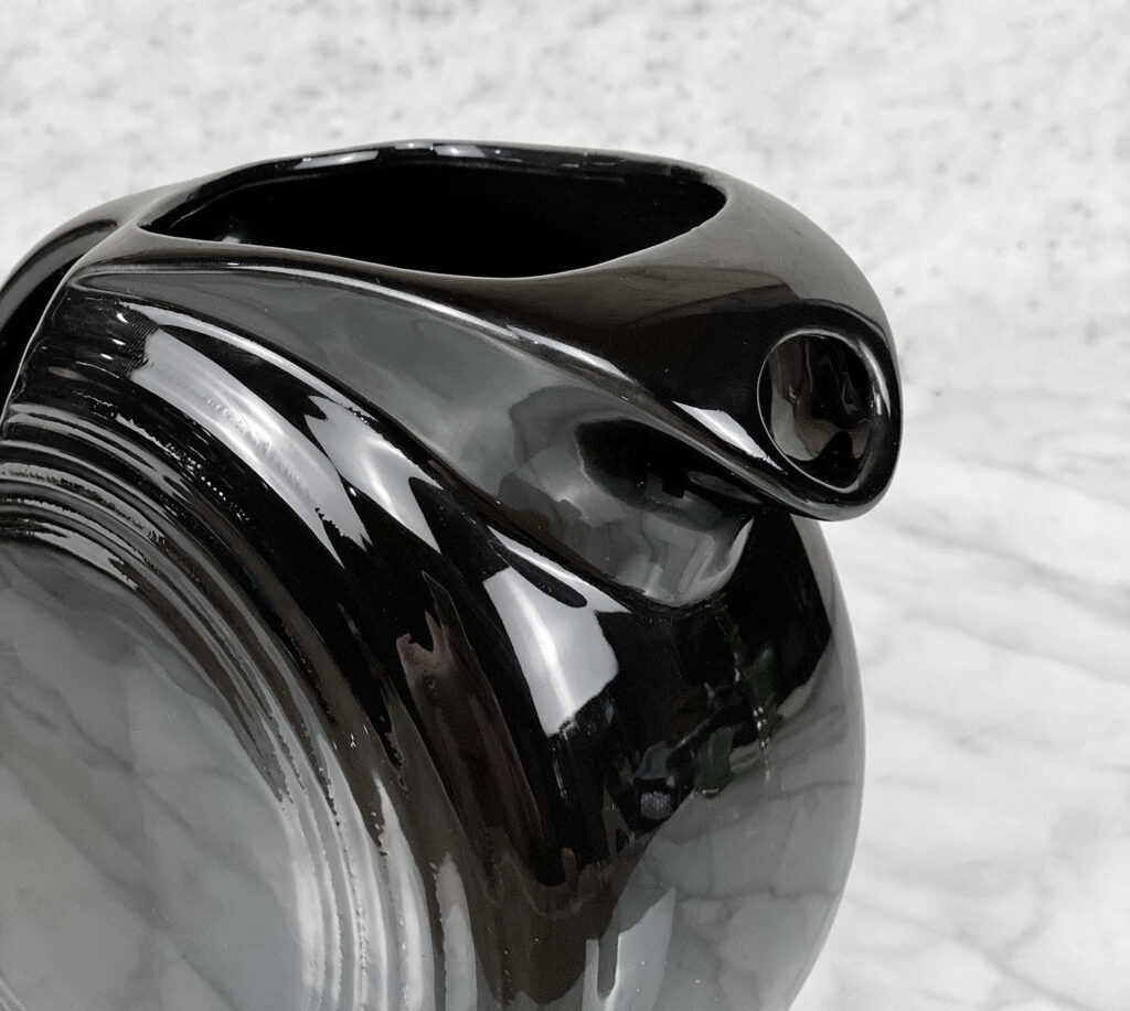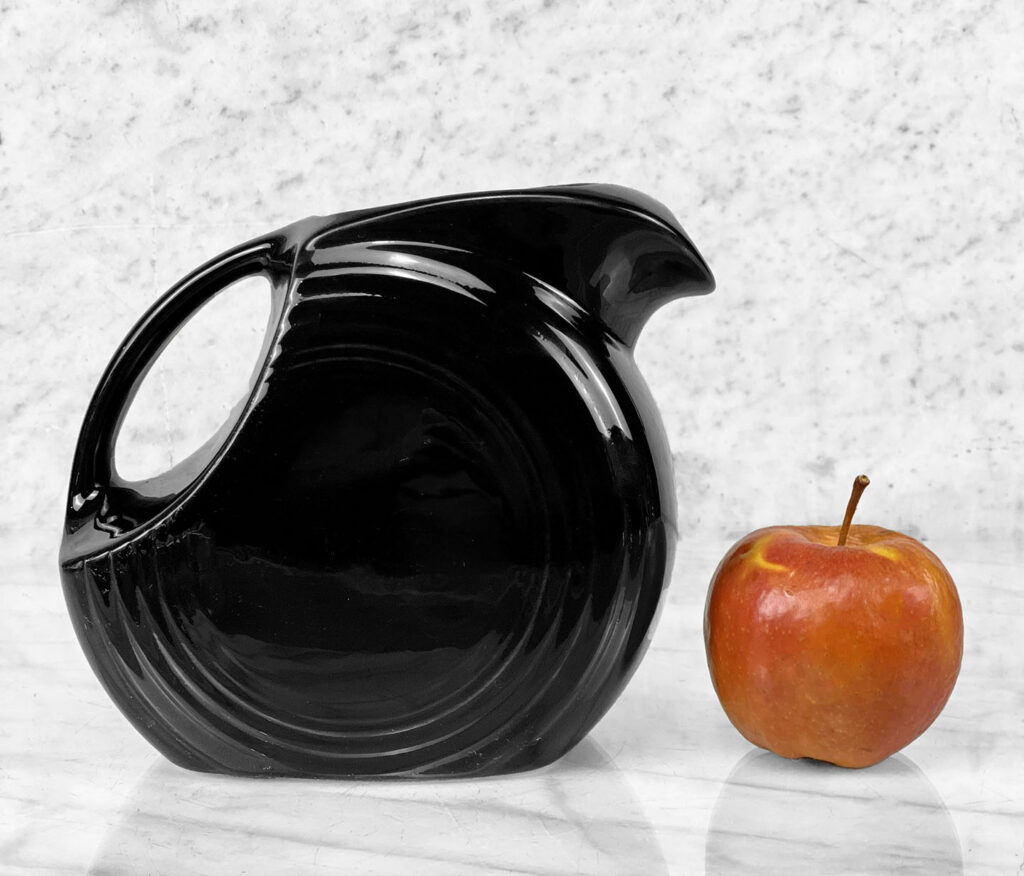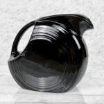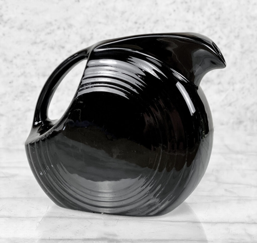 This Vintage Fiesta Disc Pitcher is in overall good condition without any cracks, chips or repairs shown. A series of light scratches can be seen along the handle top. This area is circled in our photo gallery to reference.